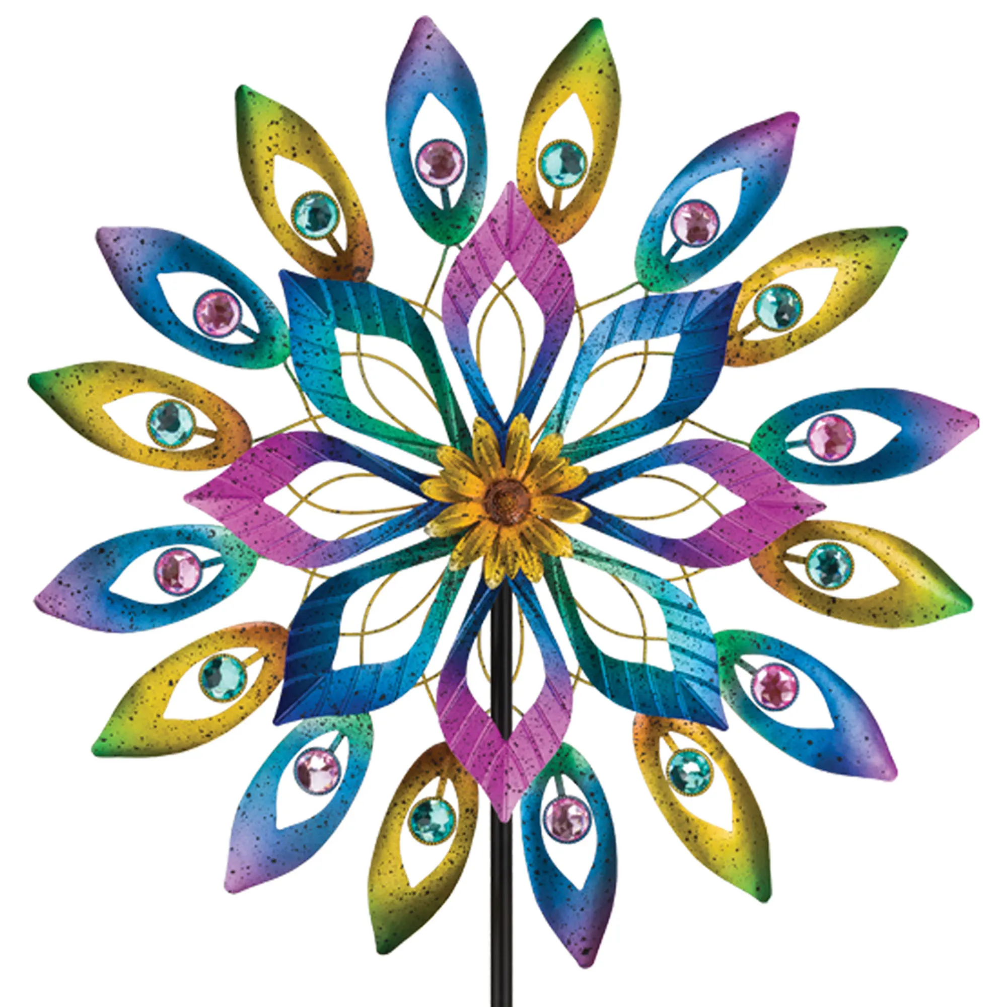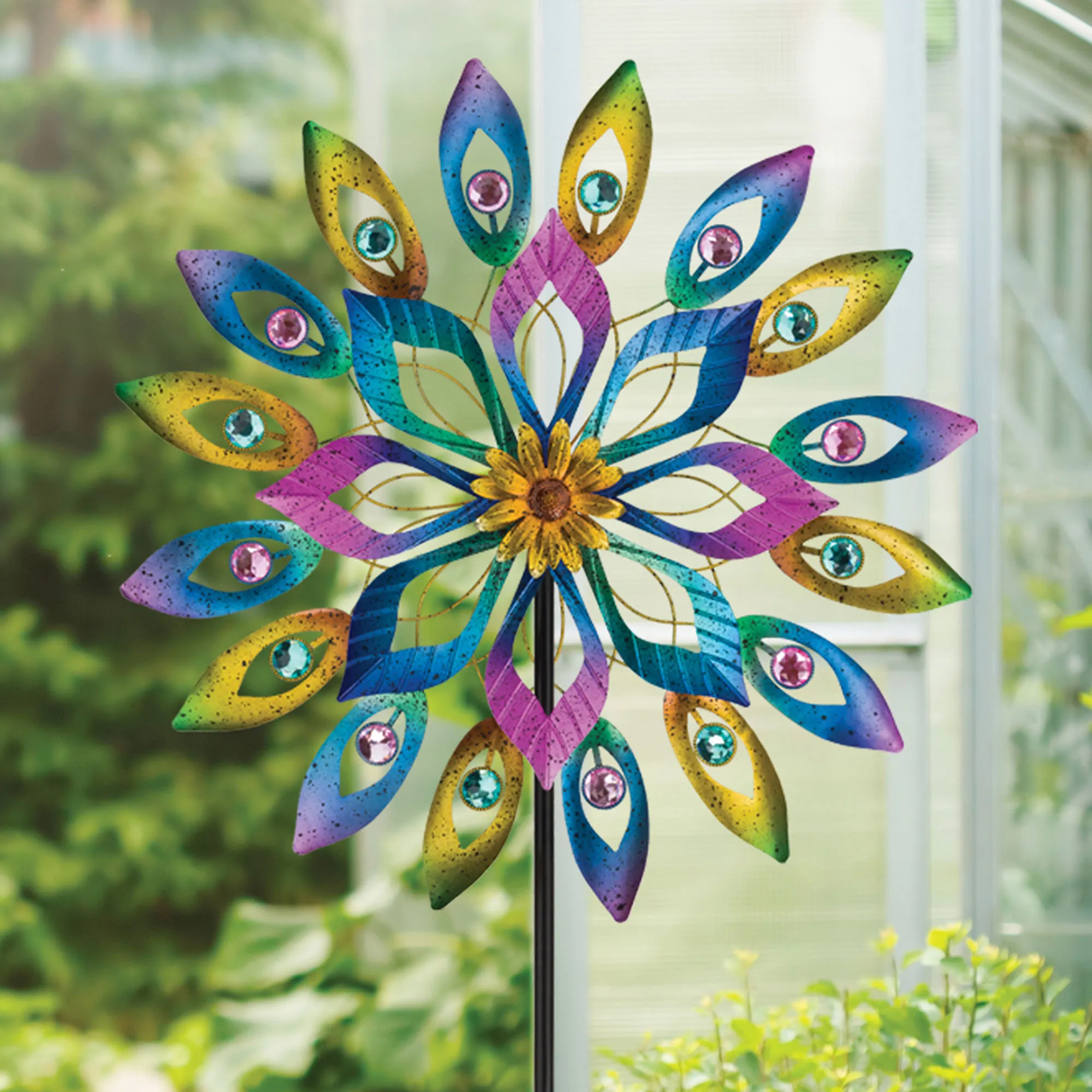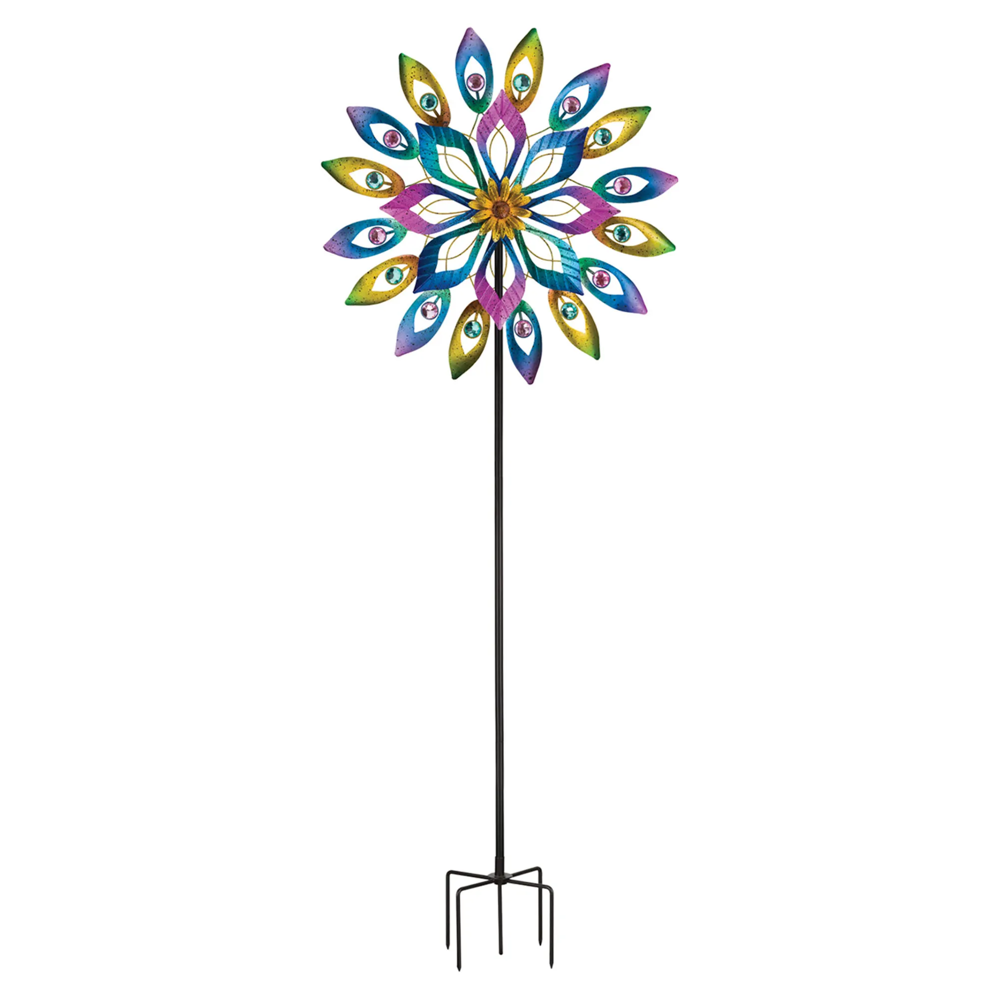 Flowing Petals Jeweled Flower Medallion Outdoor Garden Metal Wind Spinner Stake