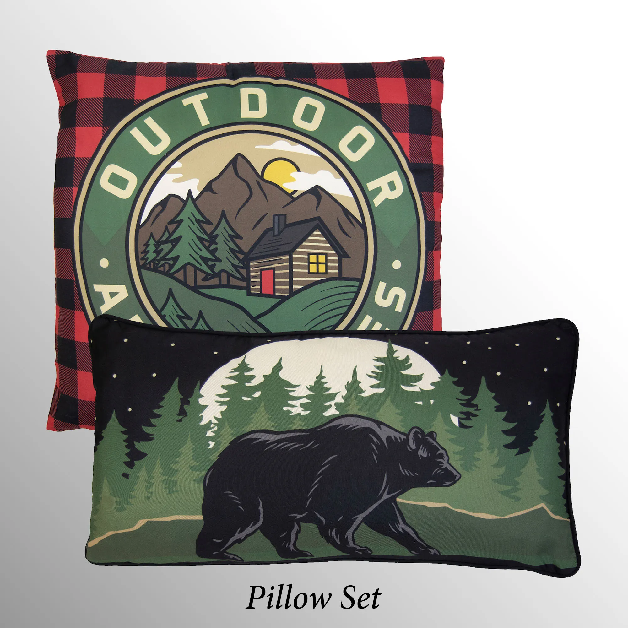 The Pillow Set of Two includes one square pillow and one rectangle pillow. Spot clean. Tailored square pillow is red and black plaid with a center "Outdoor Adventures" emblem featuring a cabin, trees, and mountains. Piped rectangle pillow features a black bear walking through the green pine forest as the full moon rises in the black starry sky.