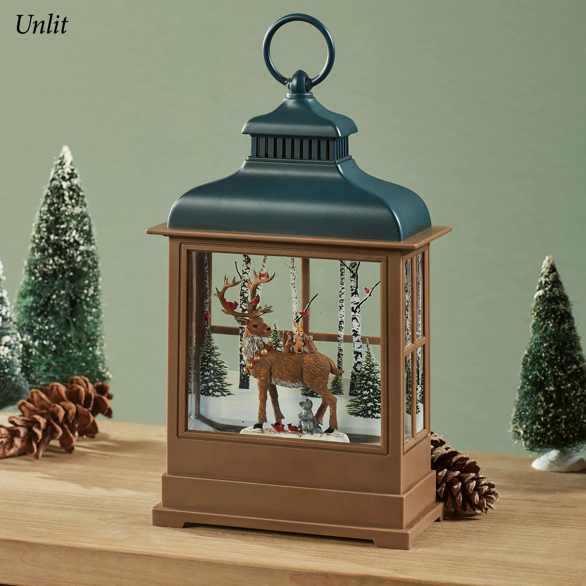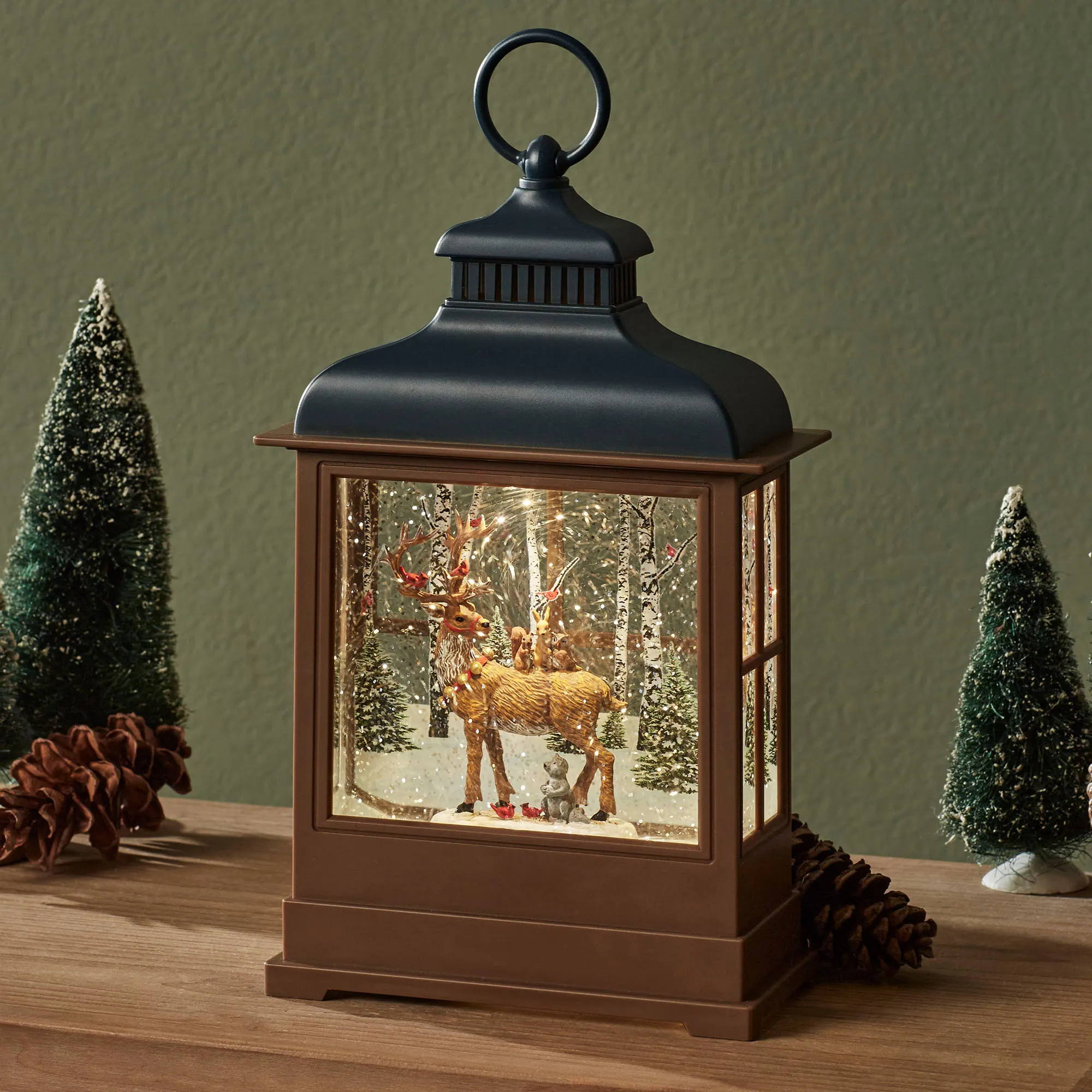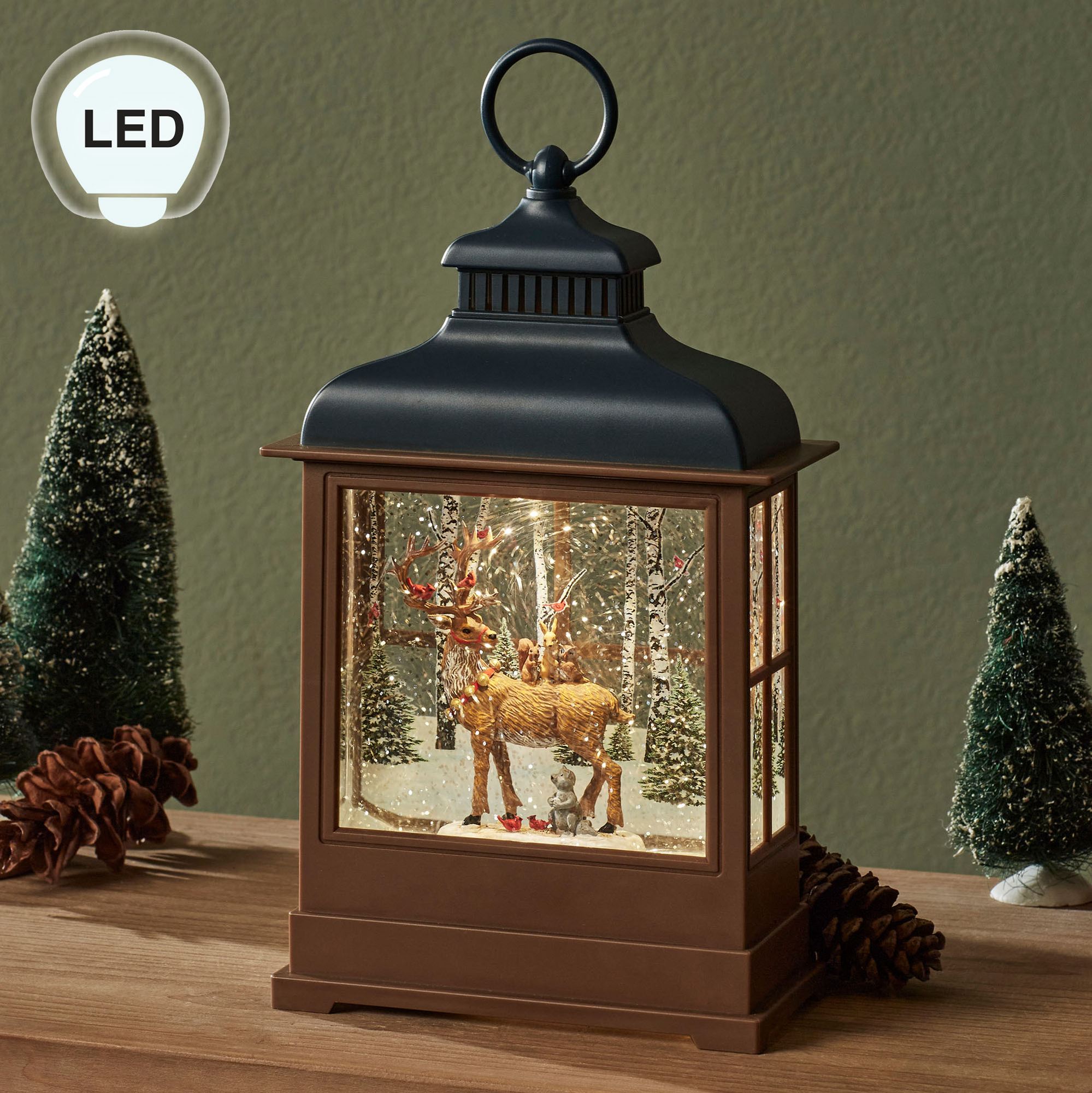 The Forest Friends LED Lighted Swirl Lantern shines with winter woodland wonder. Topped with dark blue, the brown molded polymer lantern features an angular footed design with paned sides and a printed back panel of birch trees, pine trees, cardinals, and the snowy forest floor. In the center, reindeer, cardinal, squirrel, rabbit, owl, and raccoon friends create a magical winter sight. Glitter swirls around the liquid-filled interior and shimmers from the glowing LED light. This lantern operates from a built-in six-hour timer/off switch on the bottom. Requires three of your AA batteries or your adapter for use with the included USB cord. With a ring at the top, the glitter globe lantern measures 7"Wx3"Dx12.5"H overall.