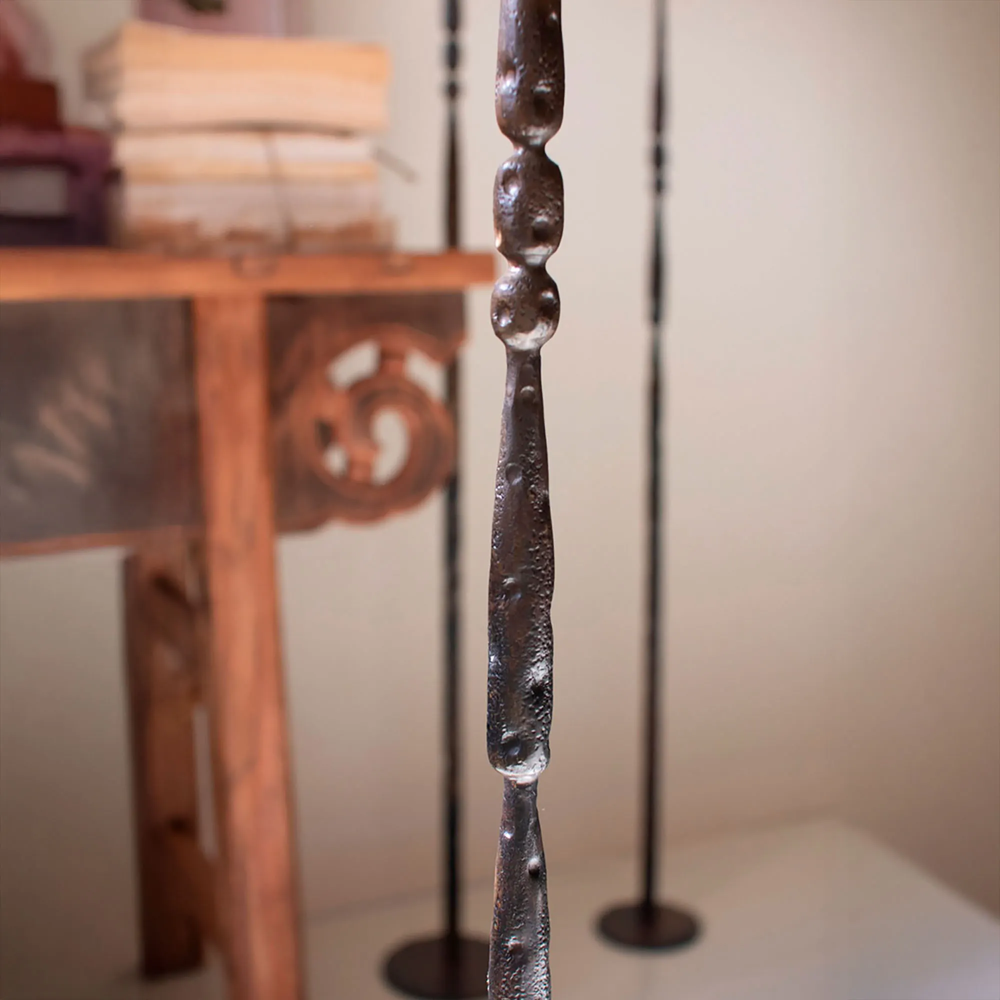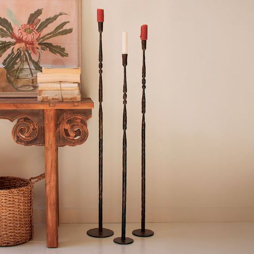 The Forged Iron Floor Candleholder Set looks sophisticated and makes a classy statement. The tall candleholders feature a spindle-style design near the top, have a dark brown and antique brass blended finish, and have a flat round base. We recommend using your LED taper candles. Set includes small, medium, and large candleholders. Small is 4"dia.x20"H; medium is 5"dia.x43"H; and large is 6"dia.x47"H.