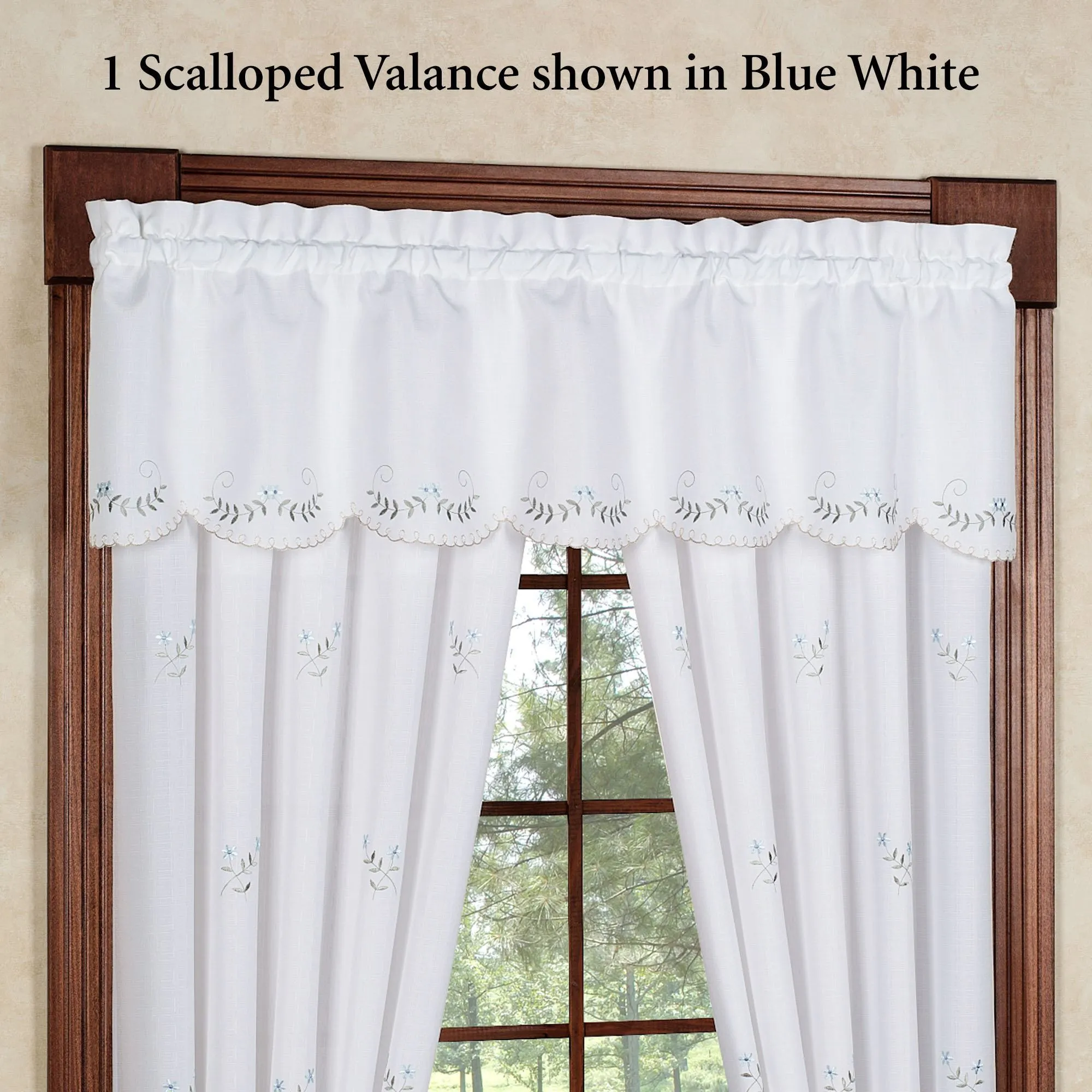 The casual and simply elegant Forget-Me-Not Window Treatment features a charming, embroidered floral and leaf motif. Tailored Curtains are scalloped and include tiebacks; curtains are available in two lengths. Scalloped Valance has a scalloped bottom edge. Polyester window treatment has 1.5" rod pockets. Machine wash. Imported. The curtain pair width is the total width of two panels together.