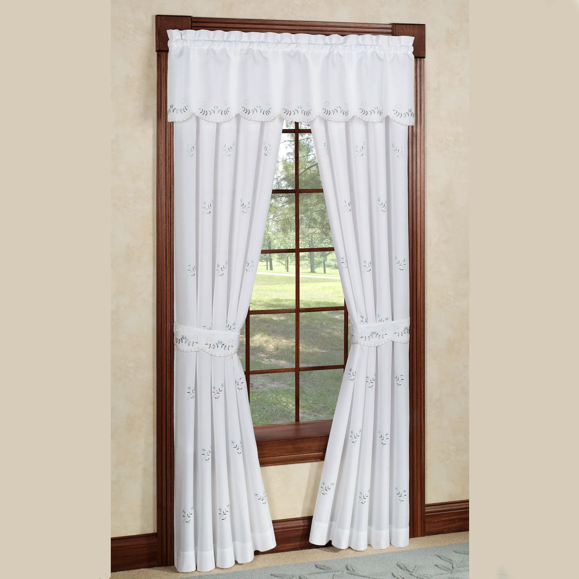 The casual and simply elegant Forget-Me-Not Window Treatment features a charming, embroidered floral and leaf motif. Tailored Curtains are scalloped and include tiebacks; curtains are available in two lengths. Scalloped Valance has a scalloped bottom edge. Polyester window treatment has 1.5" rod pockets. Machine wash. Imported. The curtain pair width is the total width of two panels together.