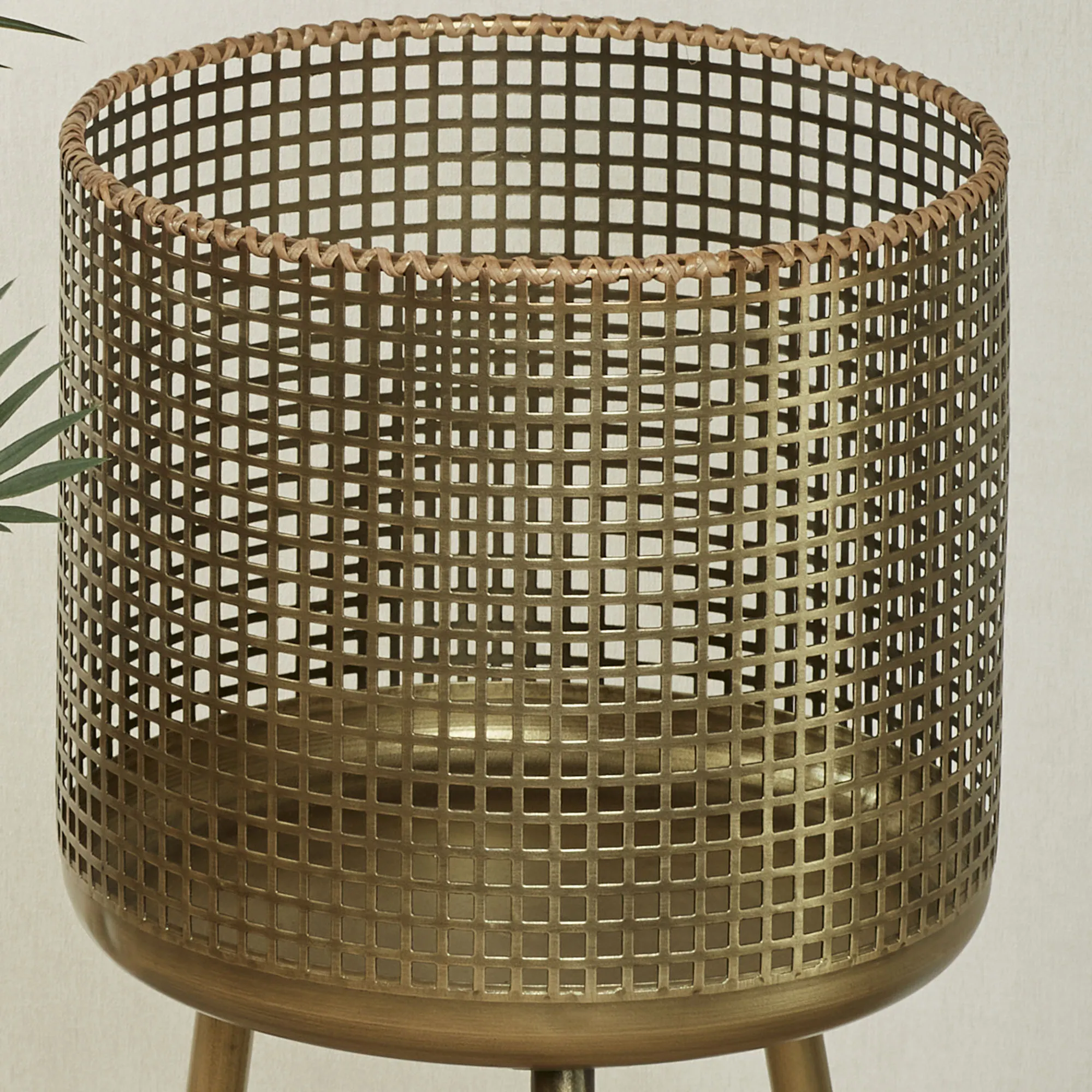 Elevate the look of any plant with the Foster Planter Set. Made of metal, these planters have a gold finish, an openwork woven design, a solid bottom, and ball feet. A rattan accent is woven through the top edge. Indoor or covered outdoor use. Small is 10"dia.x22"H, and large is 12"dia.x26"H.