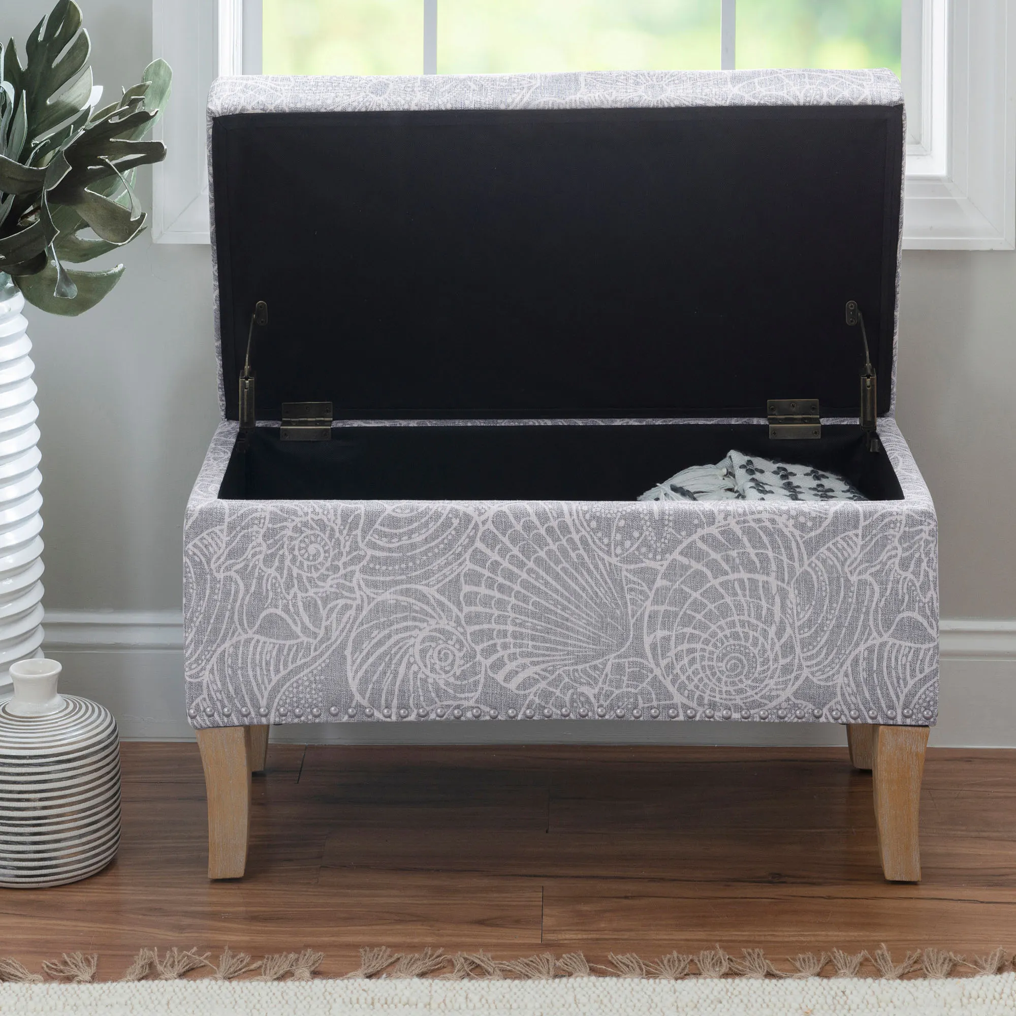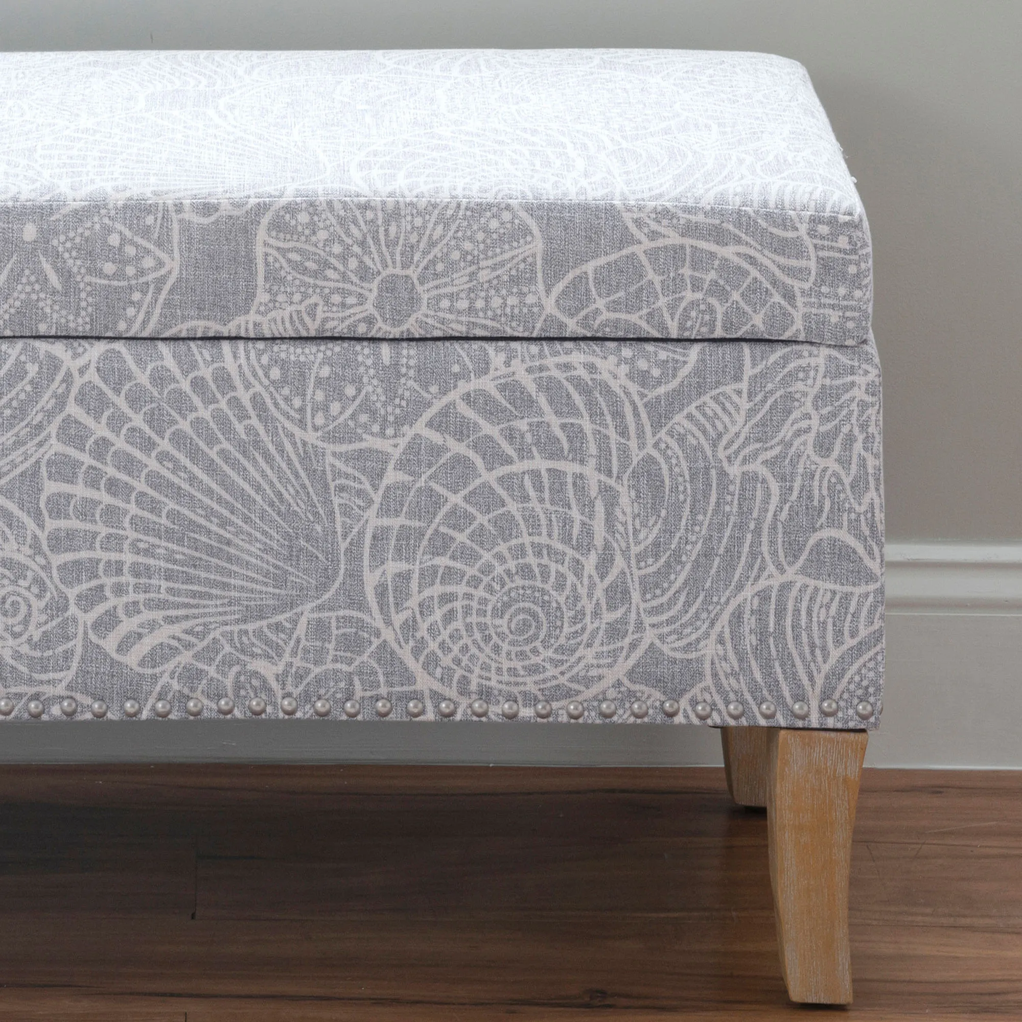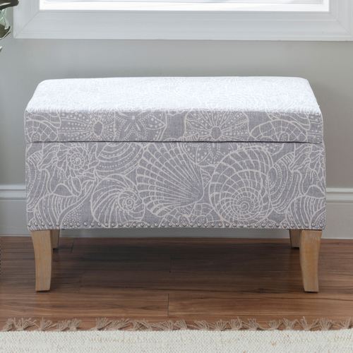 The cute shell pattern displayed on the Fountaine Storage Ottoman was inspired by the shore. This versatile ottoman has a durable, woven polyester/rayon fabric with a printed shell motif in rustic gray hues, silver nailhead trim, solid wood legs with a natural finish, and a cushioned top. Storage ottoman will look good at the foot of the bed, in a hallway, or in an entryway. The lid has a safety hinge that prevents it from slamming down. Interior storage dimensions are 29.25"Wx13.25"Dx7.5"H. The maximum recommended weight is 350 lbs. Overall, the storage ottoman measures 32"Wx16"Dx18"H; weighs approx. 28 lbs. Fill is foam. Spot clean the fabric.