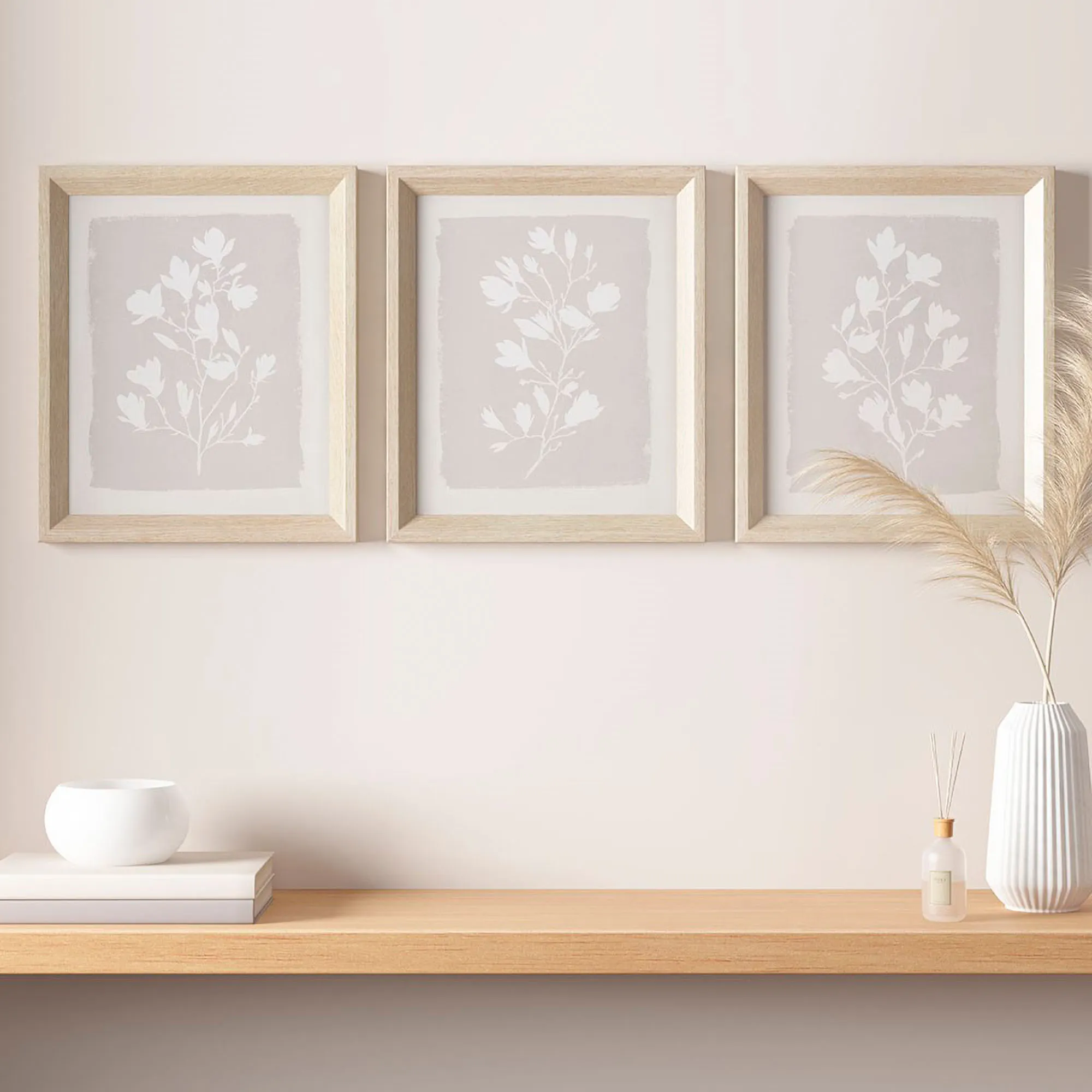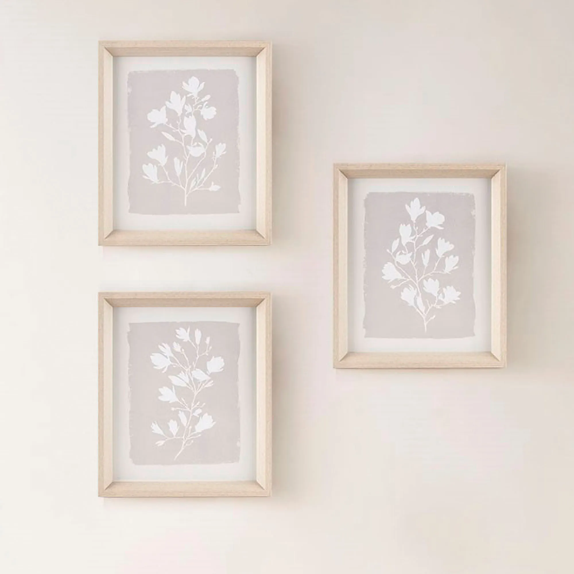 The Framed Florets Wall Art Set flourishes with an artistic style. Each framed piece, by artist Lindsay Barckholtz, showcases soft white flower prints on taupe and ivory backgrounds. Art is protected under glass, and the natural wood frames have sloped molding to create depth and dimension. Each piece measures 12"Wx1.5"Dx14"H.