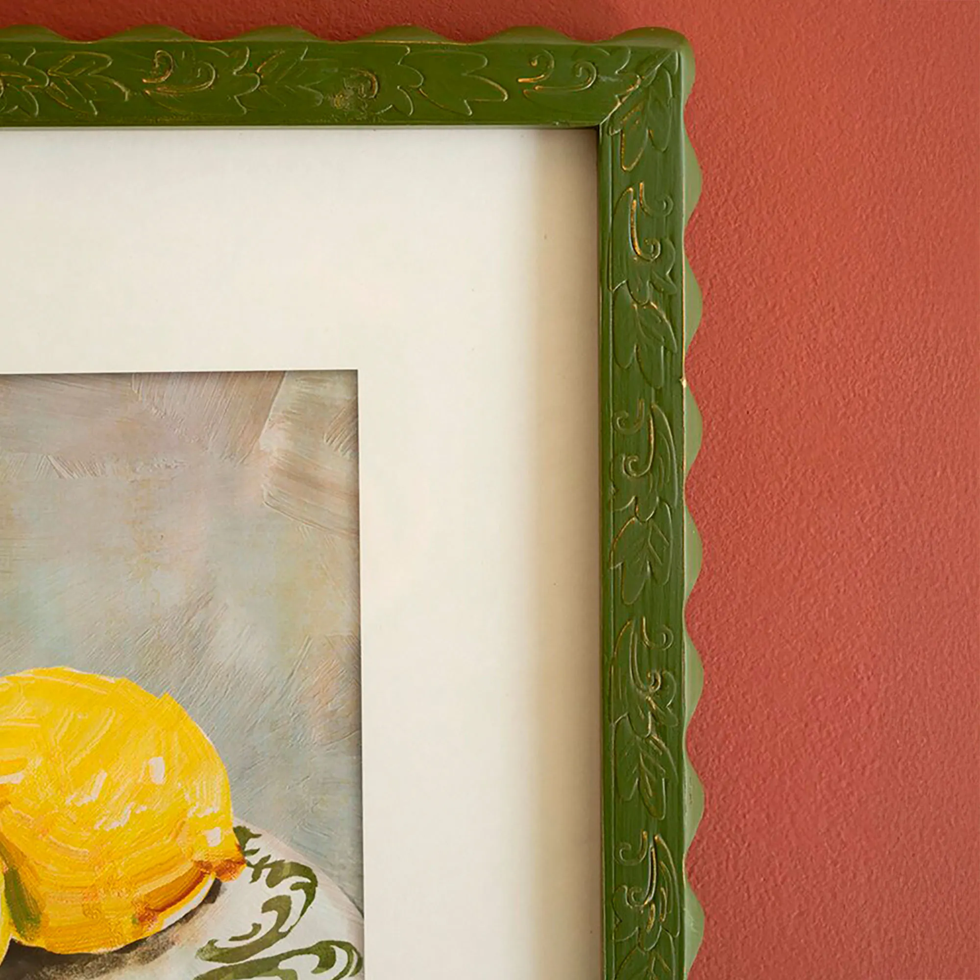 The Framed Fruit Wall Art Set lends a touch of good taste to your space. With a painterly look, each paper print artwork features ripe cherries or lemons with green leaves on a plate. A white matte, clear glass, and green scalloped wooden frame with leaf detailing protect each design. Each framed fruit wall art measures 20"sq.x1"D overall. Set weighs 10 lbs.