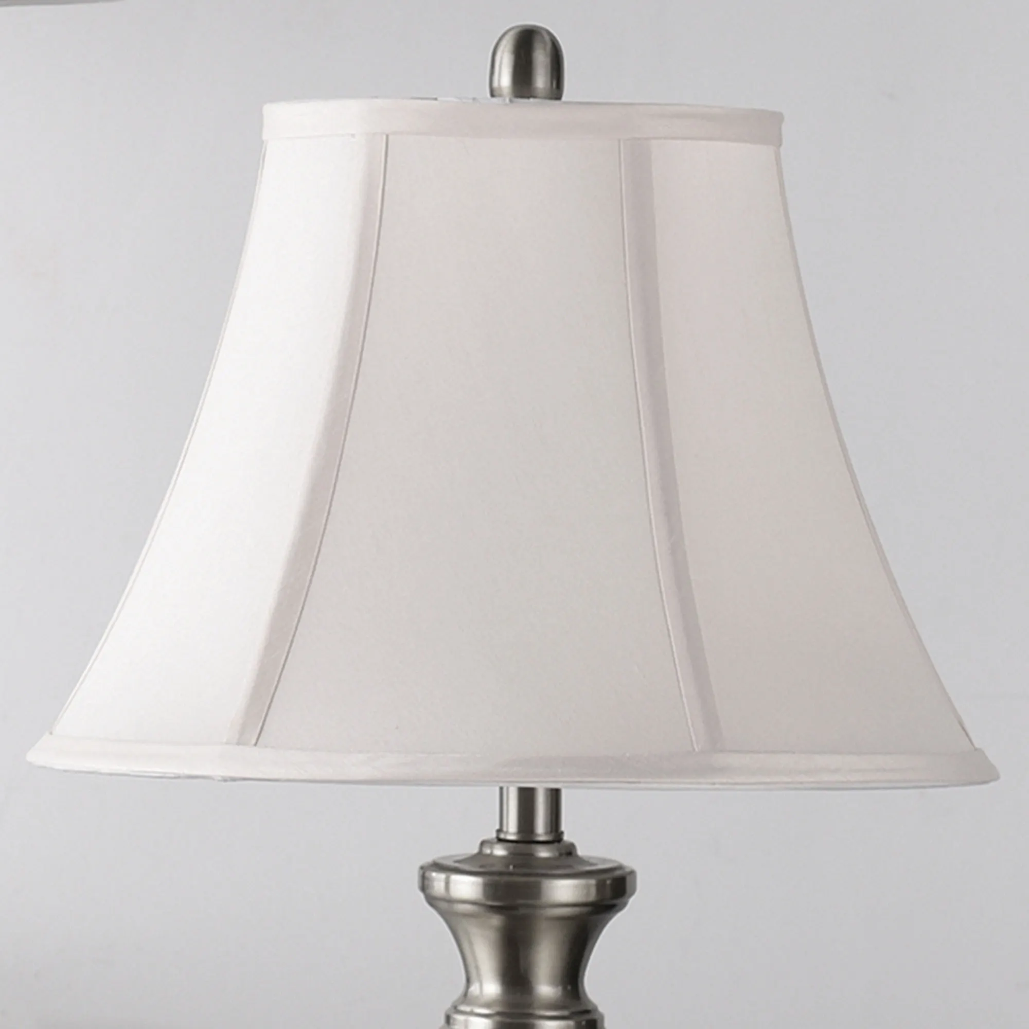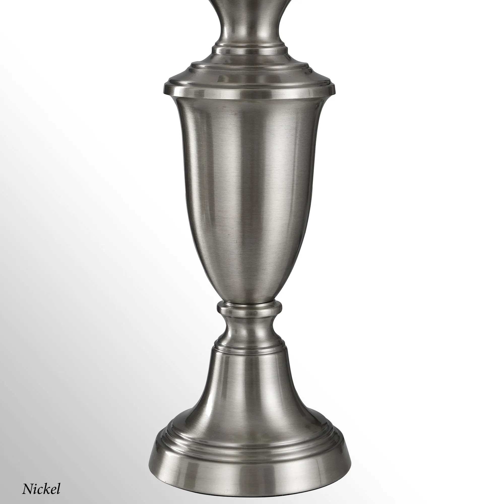 The Francis Table Lamp Pair decorates with classic style. Made of steel, these urn-style table lamps have stepped, round mounting bases. The softback shades are off-white fabric. UL listed. Each requires one 150W max. 3-way bulb and measures 15"dia.x29.5"H, including the 2"H finial.