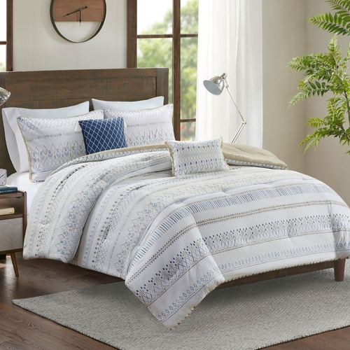 Enjoy the refreshing style of the Fraser Bedding from Madison Park. The 5-piece Bed Set includes a comforter, 2 shams, and 2 decorative pillows. The white comforter features printed soft blue and taupe diamond, linear, chevron, stripe, and geometric bands on a textured polyester microfiber seersucker ground. Backing is almond with diamonds. Click on the Details tab to read about the other items in the bed set. Fill is polyester. Machine washable; spot clean the pillows. Imported.