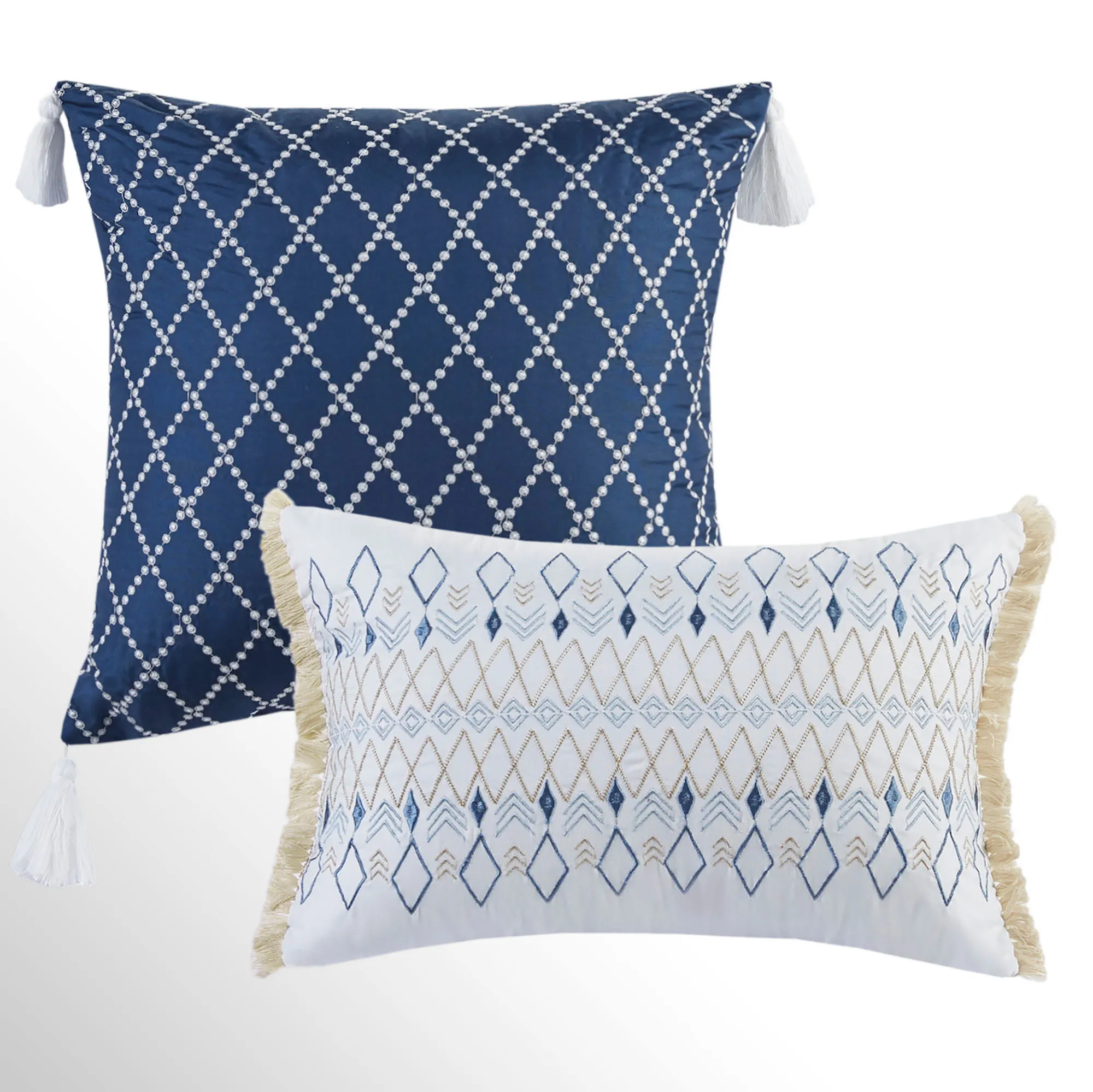 Decorative pillows have embroidery and tailored edges; spot clean. Square pillow is blue with white diamond embroidery and tasseled corners. Rectangle pillow is white with coordinating geometric embroidery and fringed length ends.