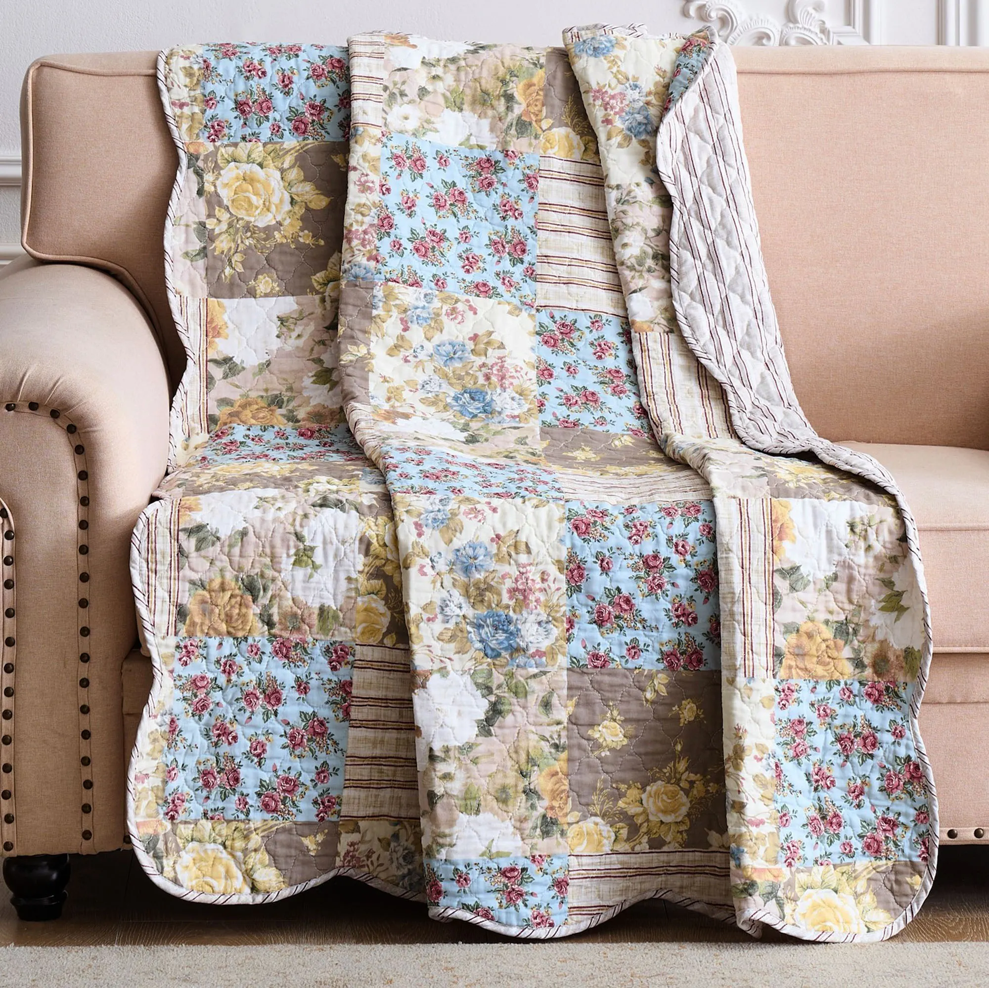 Transform your bedroom into a timeless retreat like those found in the French Country. Crafted from pre-washed and preshrunk cotton, the printed ensemble features a multitude of vintage-inspired roses, florals, stripes, and classically charming motif squares in a rich palette of soft blues, warm browns, white, light cream, burgundy, and gentle yellows. Scalloped, bound edges add whimsy, while quatrefoil quilting offers stylish allure. The design is OEKO-TEX(R) certified, which ensures a lack of harmful chemicals, making the bedding safe for the whole family.