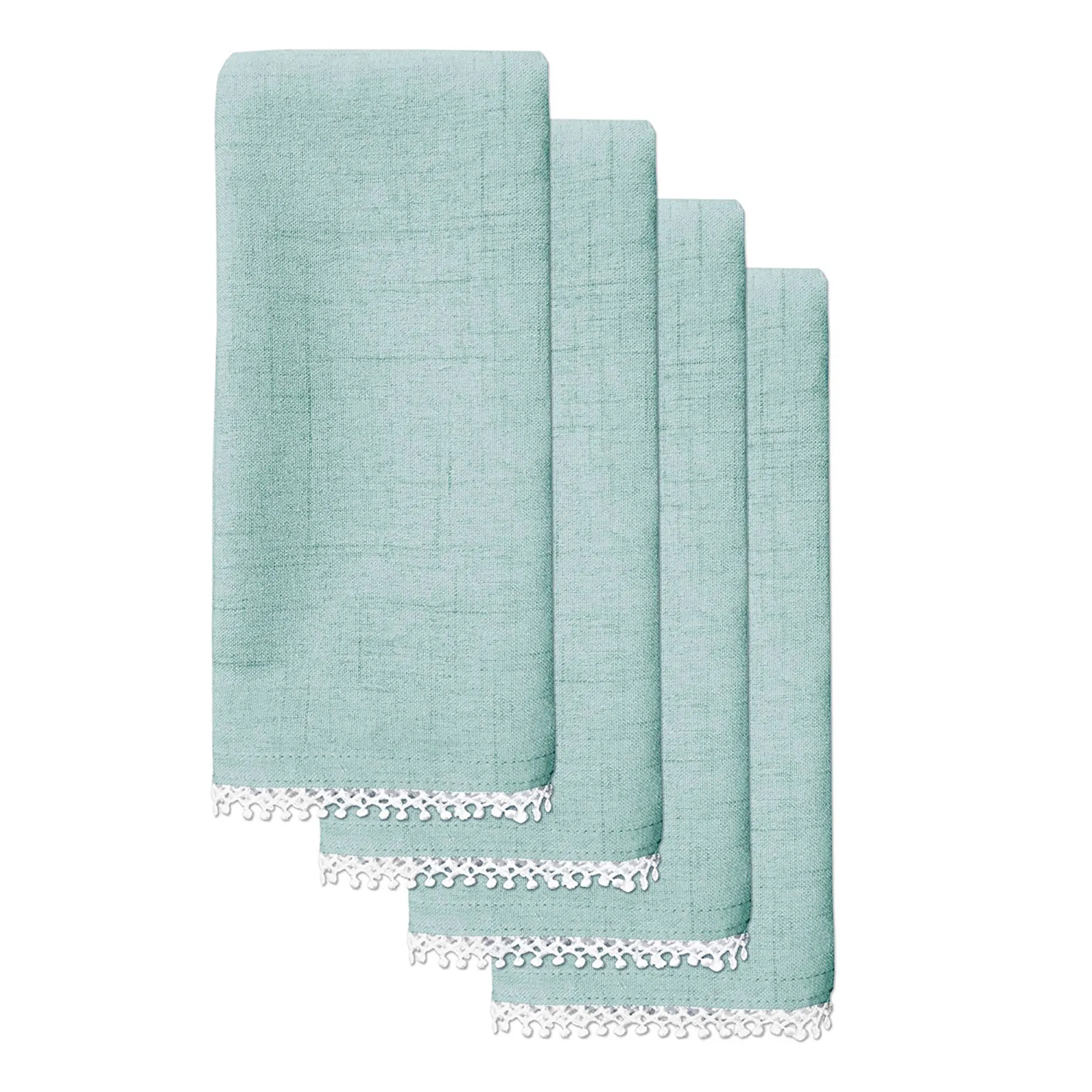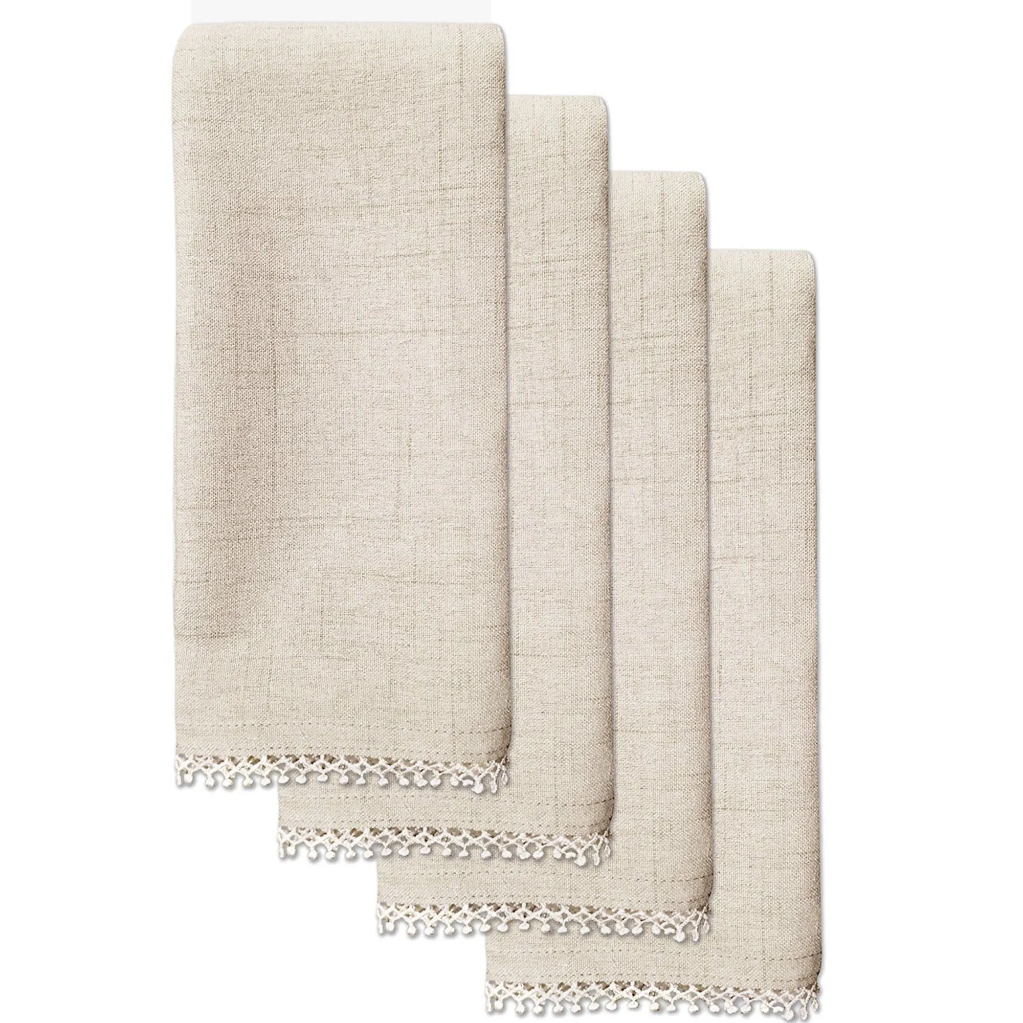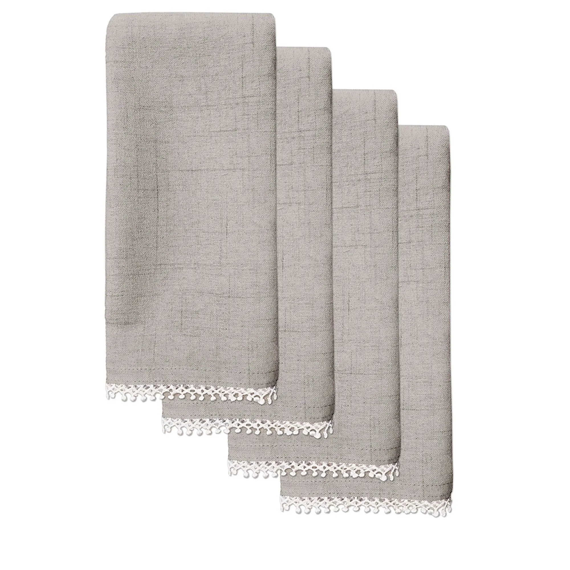These napkins are nice size and match the tablecloth perfectly. The edge design is very small in scale so it won't interfere with the use of the napkin. Just adds a little touch of pizzazz to the table. No shrinkage at all, and if pulled from dryer quickly, can remove much of wrinkles with your hand. Or, you can iron to perfection. Looking forward to using for all Spring gatherings.