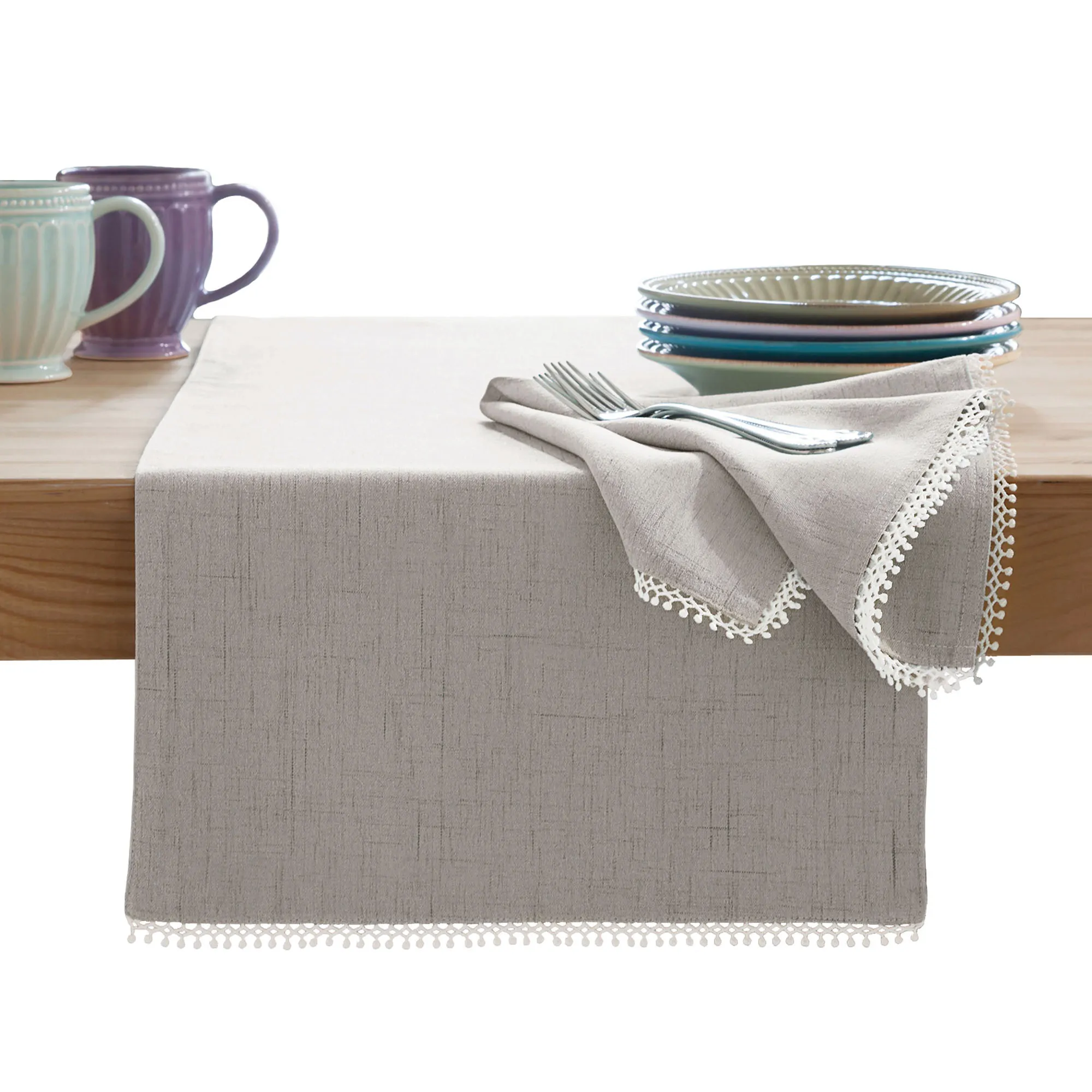 • Soft-hued slubbed polyester table linens