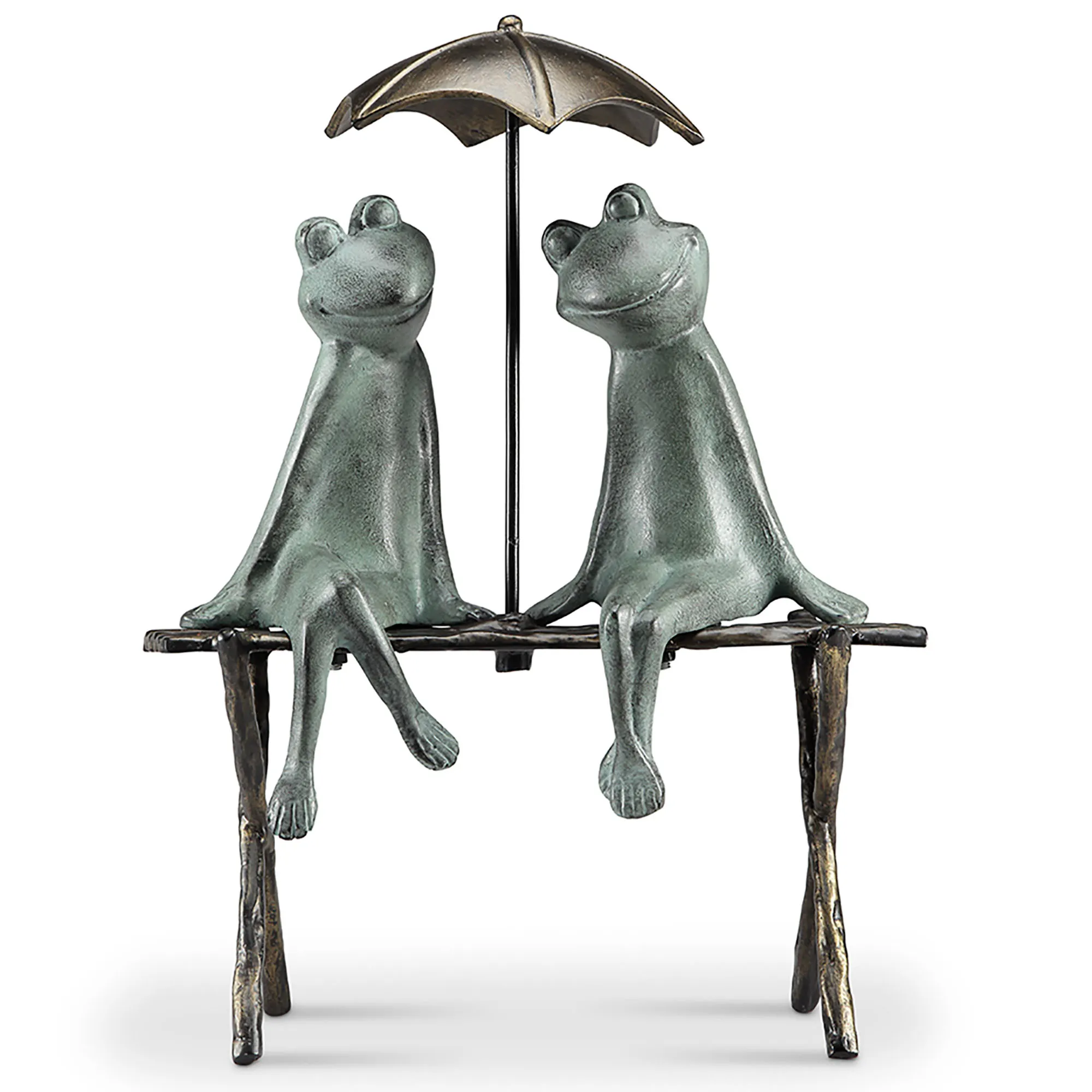 Share your favorite sitting spot with the one you adore in the Frog Lovers Garden. This hand-cast aluminum sculpture has hand-rubbed verdi and bronze finishes and features two frogs on a bench in the shade. Indoor or outdoor year-round use. Frog sculpture measures 18"Wx7"Dx18"H.