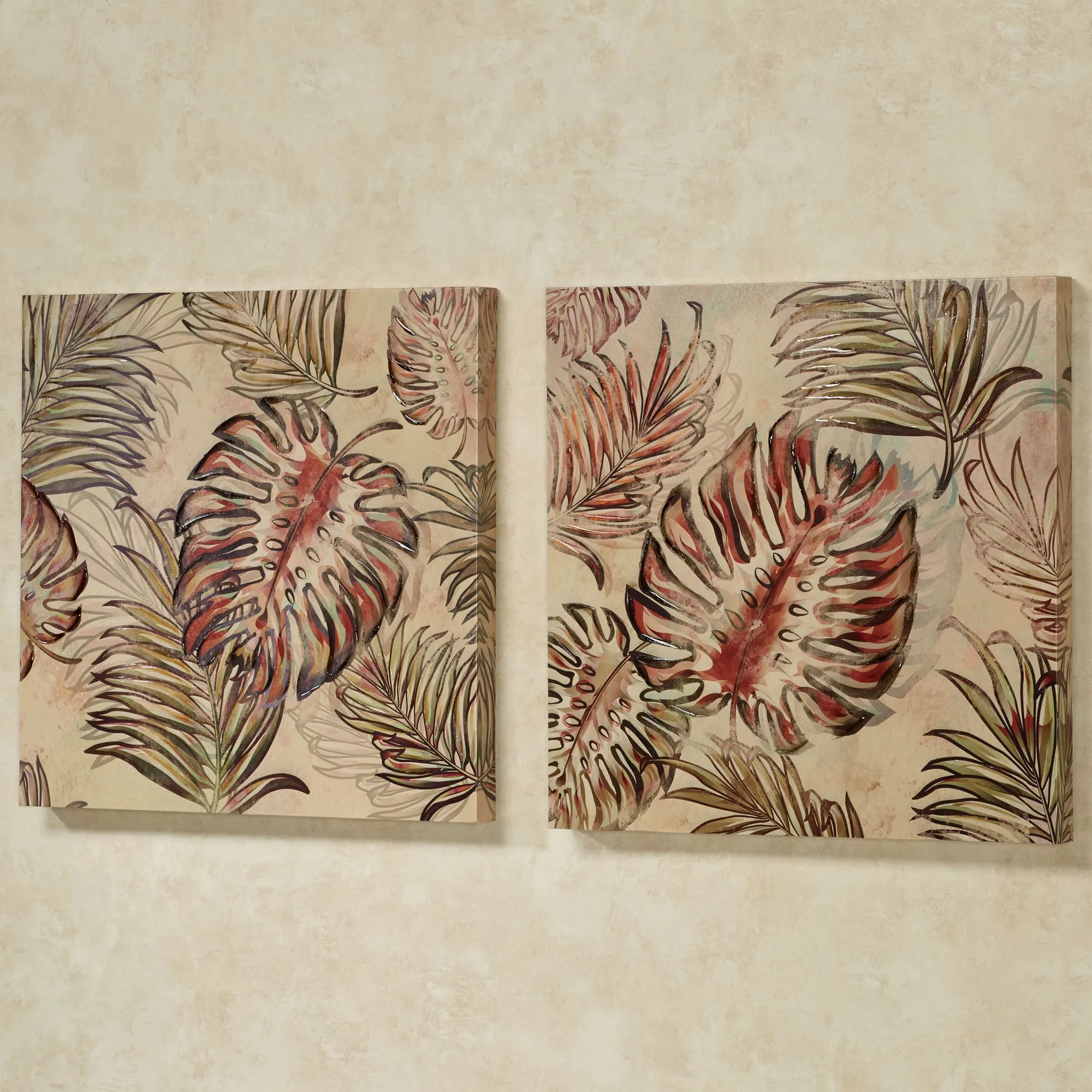 The swaying leaves upon the Frond Haven Canvas Wall Art Set turn your decor into a secluded tropical paradise. Gallery-wrapped over wood frames, the giclee canvases feature warm tropical colors and colored gel embellishments. Each measures 24"sq.x2"D.