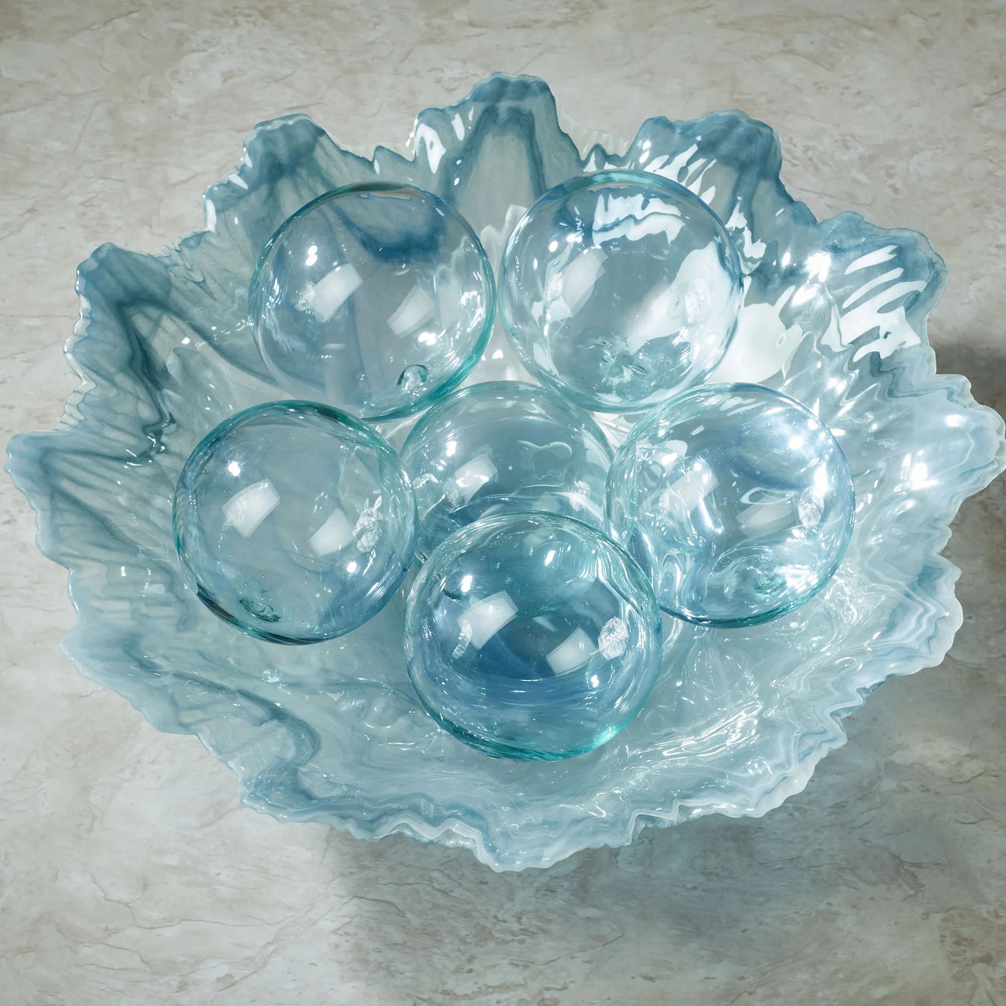 A Glass Orbs Set adds a fanciful accent to your decorative display. Crafted from recycled glass, each set includes six orbs in an aqua frosted or clear hue. Each orb is 4" dia. Bowl is not included.
