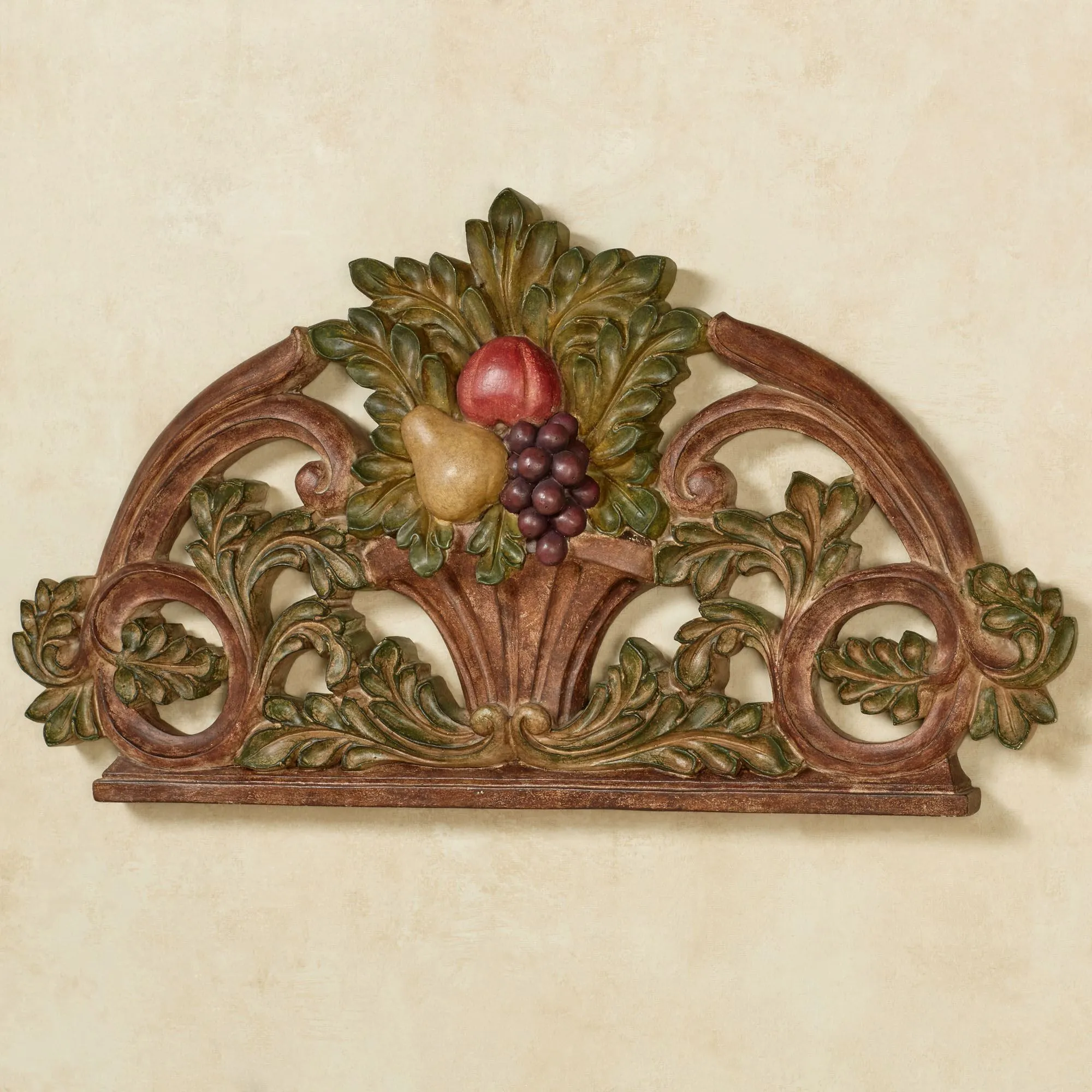 Scrolling vines, leaves, and Fruit in an Urn make for an impressive display in a kitchen or dining area. Made of resin, this arched wall plaque includes handpainted shades of brown, green, purple, and red. Measures 25"Wx3"Dx13"H.