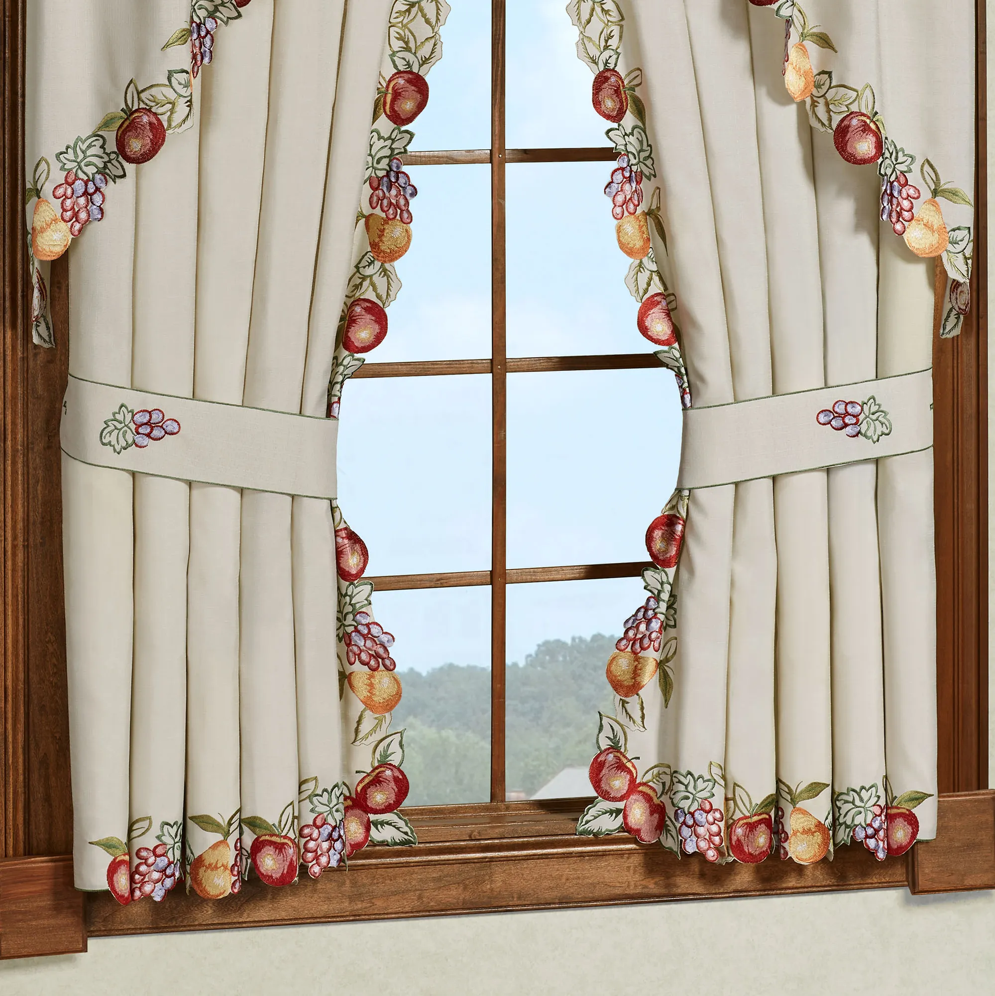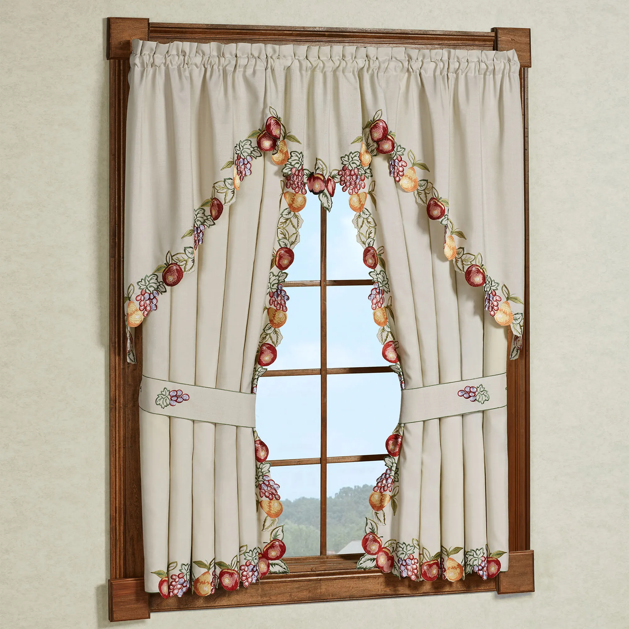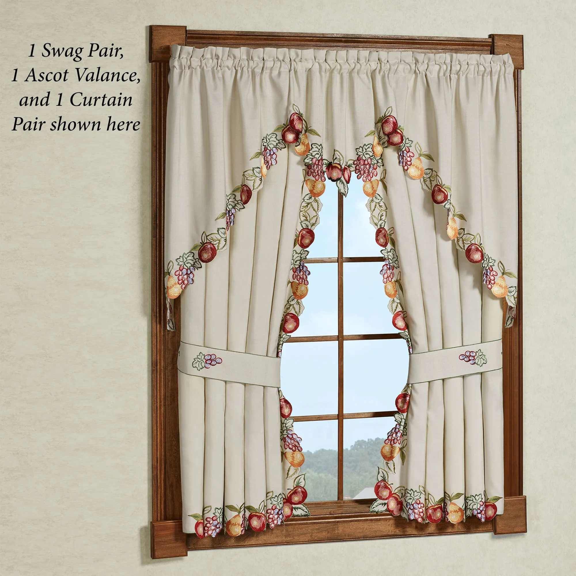 Harvest this Fruitful blend of apples, grapes, and pears for an everlasting impression of nature's bounty. This slubbed oatmeal, polyester window treatment has contour edges with embroidered fruit. Colors include shades of orange, gold, purple, rose pink, white, deep red, dark green, and sage. Rod pockets are 1.75". Specify Curtain Pair, 84"Wx63"L; Swag Valance Pair, 60"Wx36"L; or Ascot Valance, 24"Wx18"L. Curtain Pair includes tiebacks. Machine washable. Imported. The curtain pair width is the total width of two panels together.