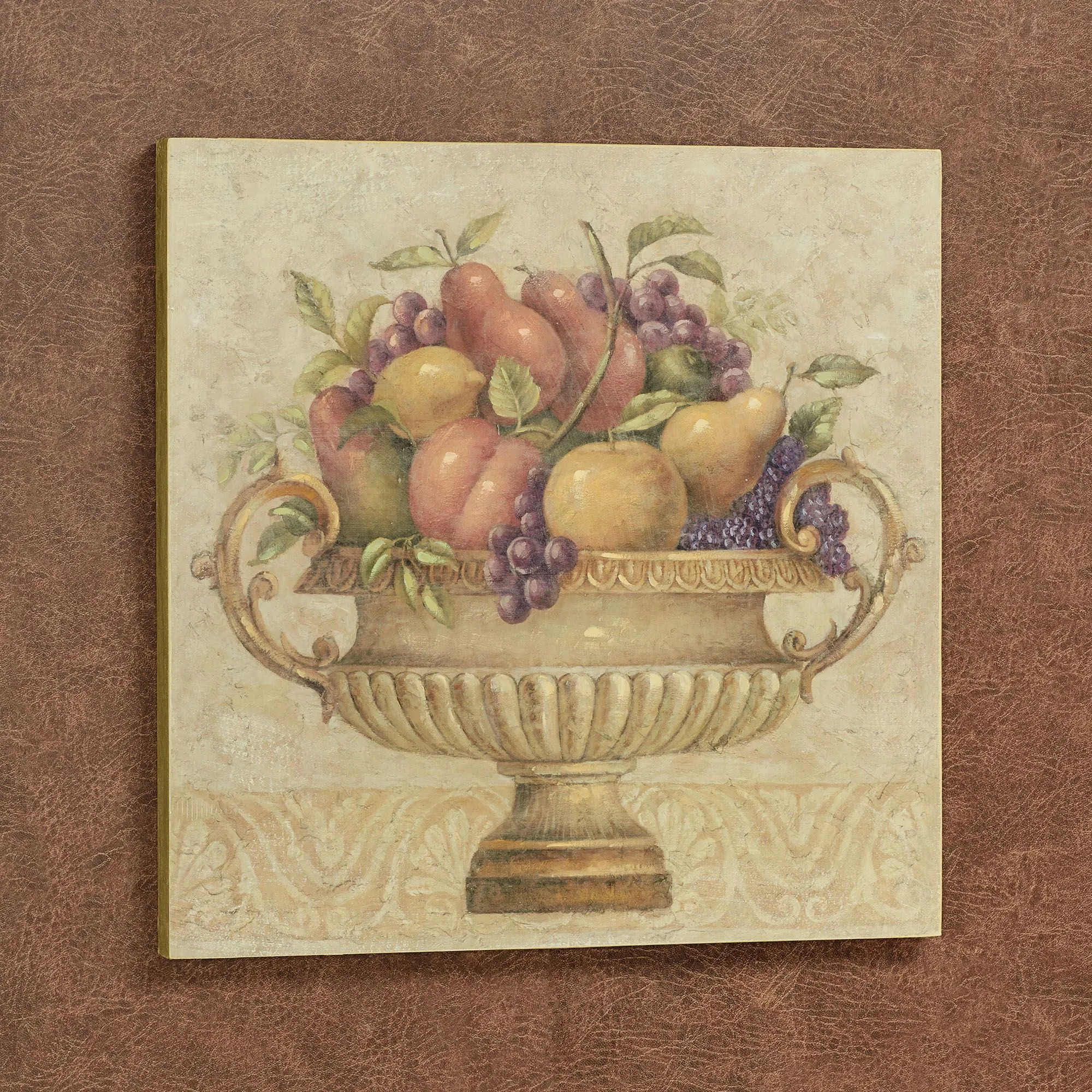 An ornate, pedestal-style urn is abundantly stacked with a towering Fruitful Harvest. This wooden wall art plaque has handpainted embellishments and depicts a decorative bowl filled with fruit on a light background with a subtle design. The unique technique used creates a textured look similar in appearance to a chalk drawing. Measures 18"sq.x1.5"D.