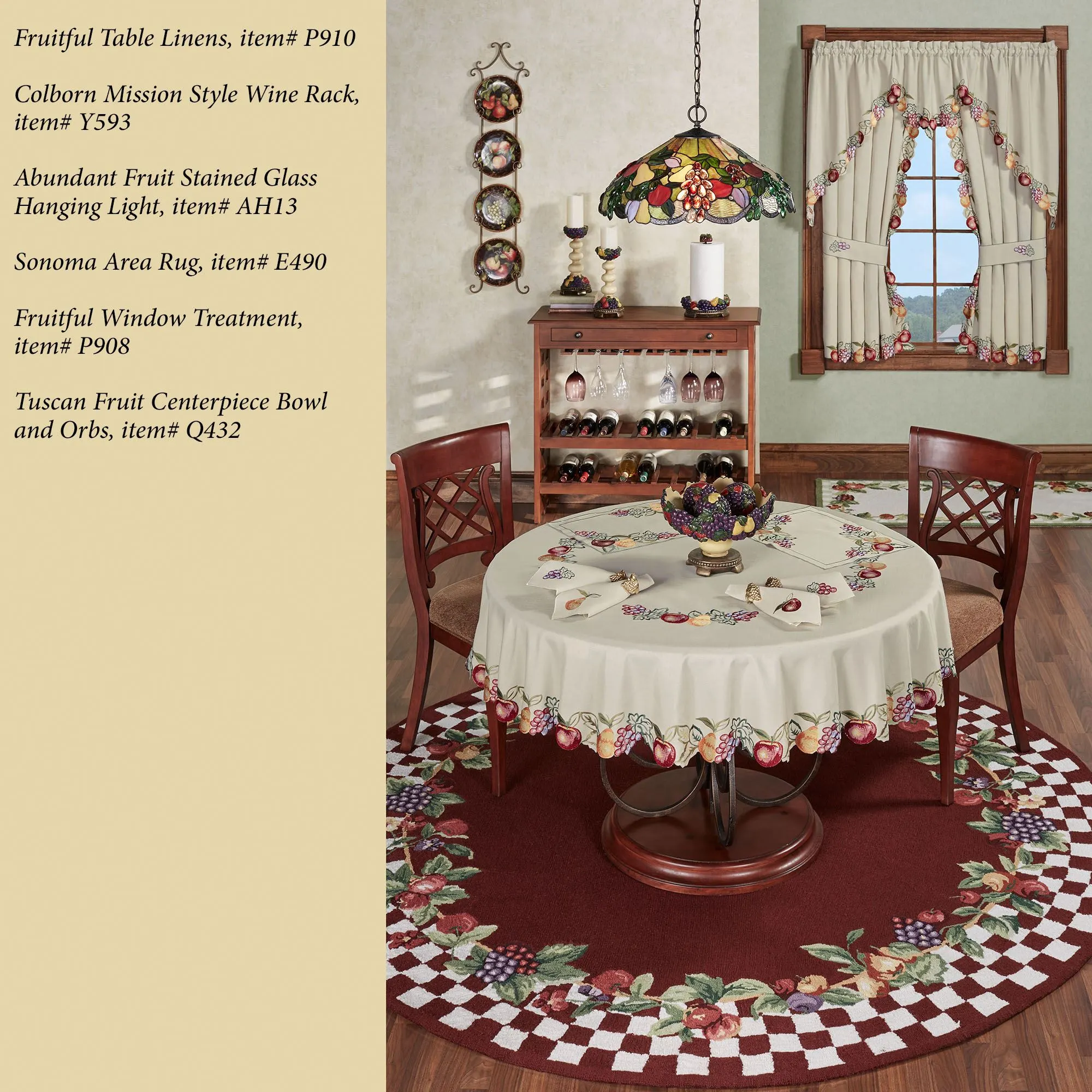 Harvest this Fruitful blend of apples, grapes, and pears for an everlasting impression of nature's bounty. These polyester table linens have a slubbed oatmeal background and embroidered fruit. Colors include shades of orange, gold, purple, rose pink, white, deep red, dark green, and sage. Specify Round Tablecloth, Napkin Set of 4, or Placemat Set of 4. Round Tablecloth, 70" dia., has contour-cut edges. Napkins, 18" sq., have a single fruit on each. Placemats, 18"x13", have a double border. Machine washable. Imported.