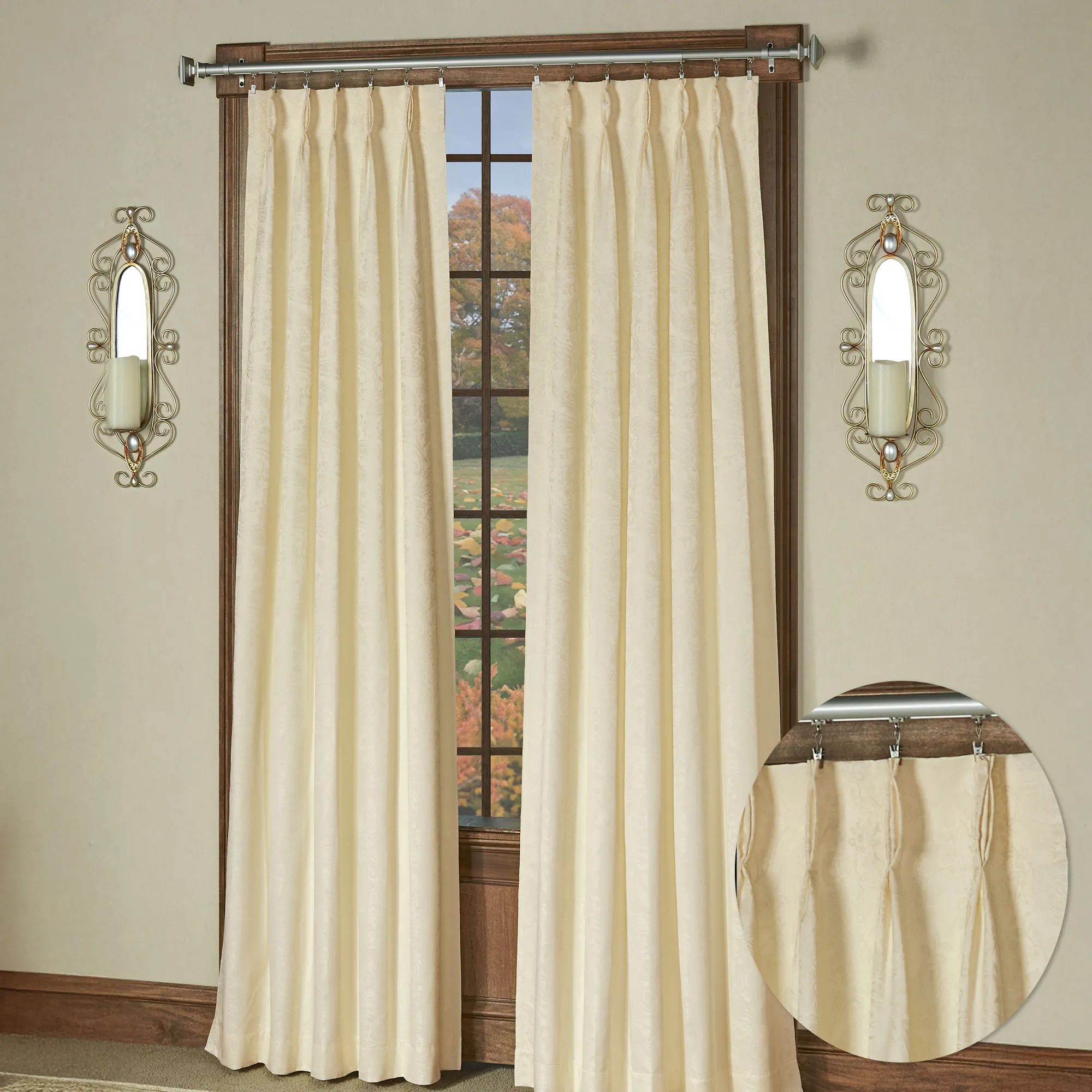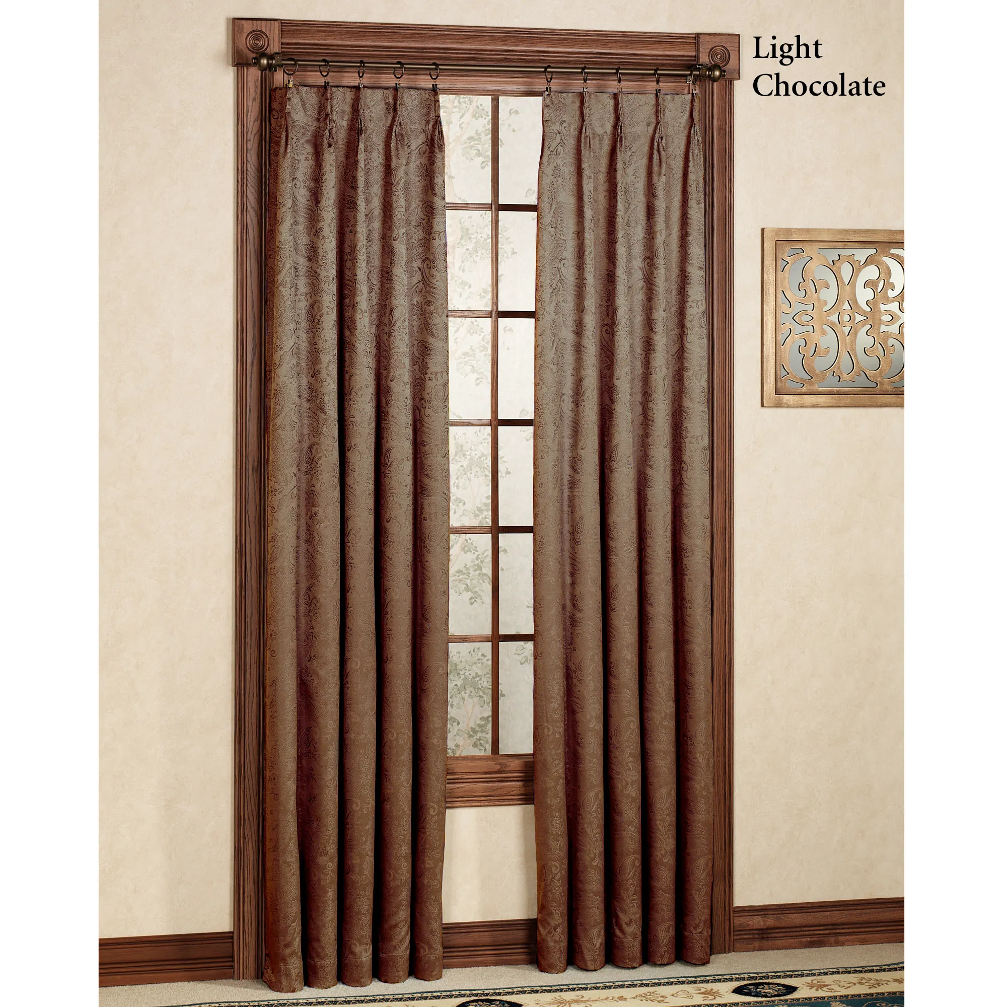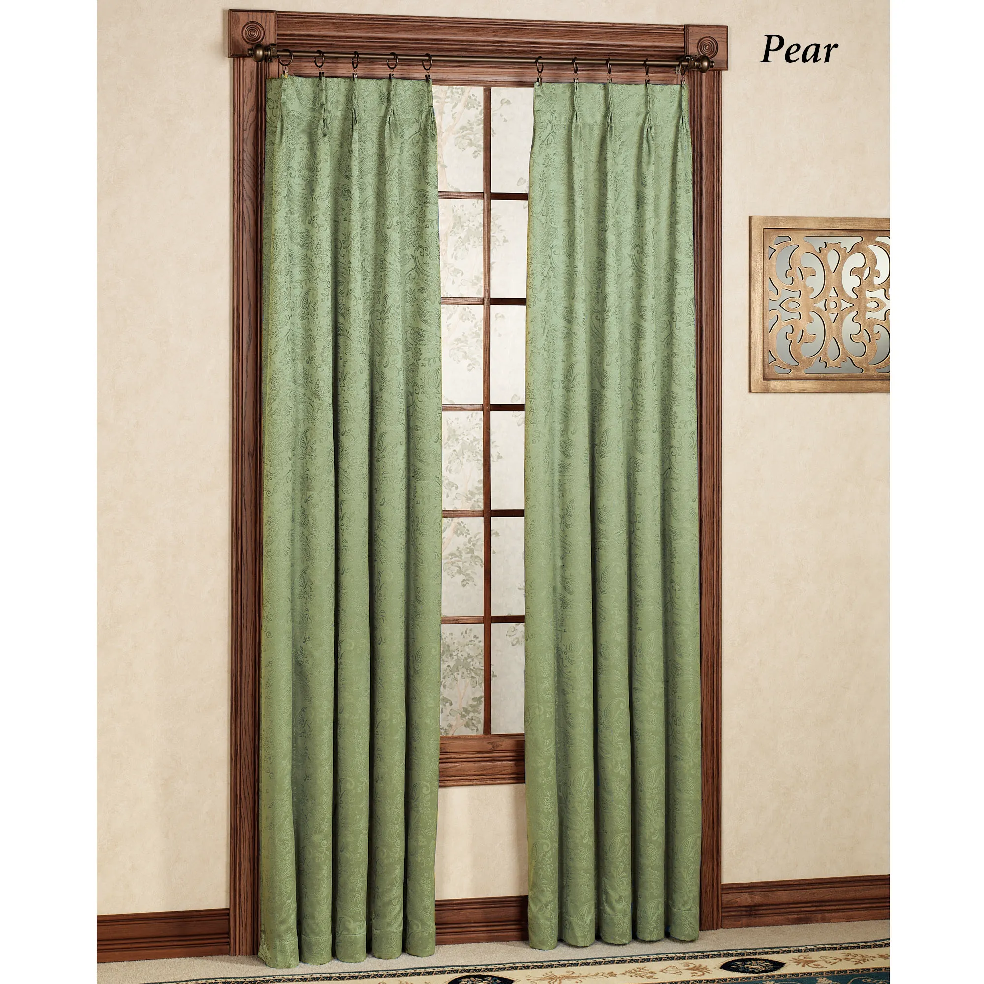 The elegant Gabrielle Pinch Pleat Window Treatment features a subtle paisley design on a solid color. The energy-saving, thermal window treatment helps to reduce light, reduce noise for a better night's sleep, and cut heating and cooling costs. The polyester window treatment has an acrylic foam backing; curtains have a pinch pleat design. Use your clip rings or drapery pins on the curtains to complete the tailored look; click on Details for the clip requirements. Specify Curtain Pair, Wide Curtain Pair, Patio Panel, or Rod-Pocket Valance. Choose Ivory, Crimson, Federal Blue, Latte, Light Chocolate, or Pear. Crimson has a light pink foam backing. Machine wash. Imported. Curtain pair width is the total width of two panels together.