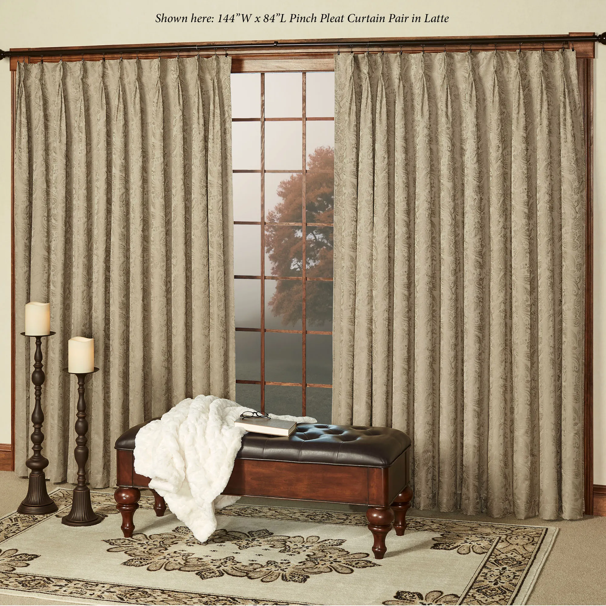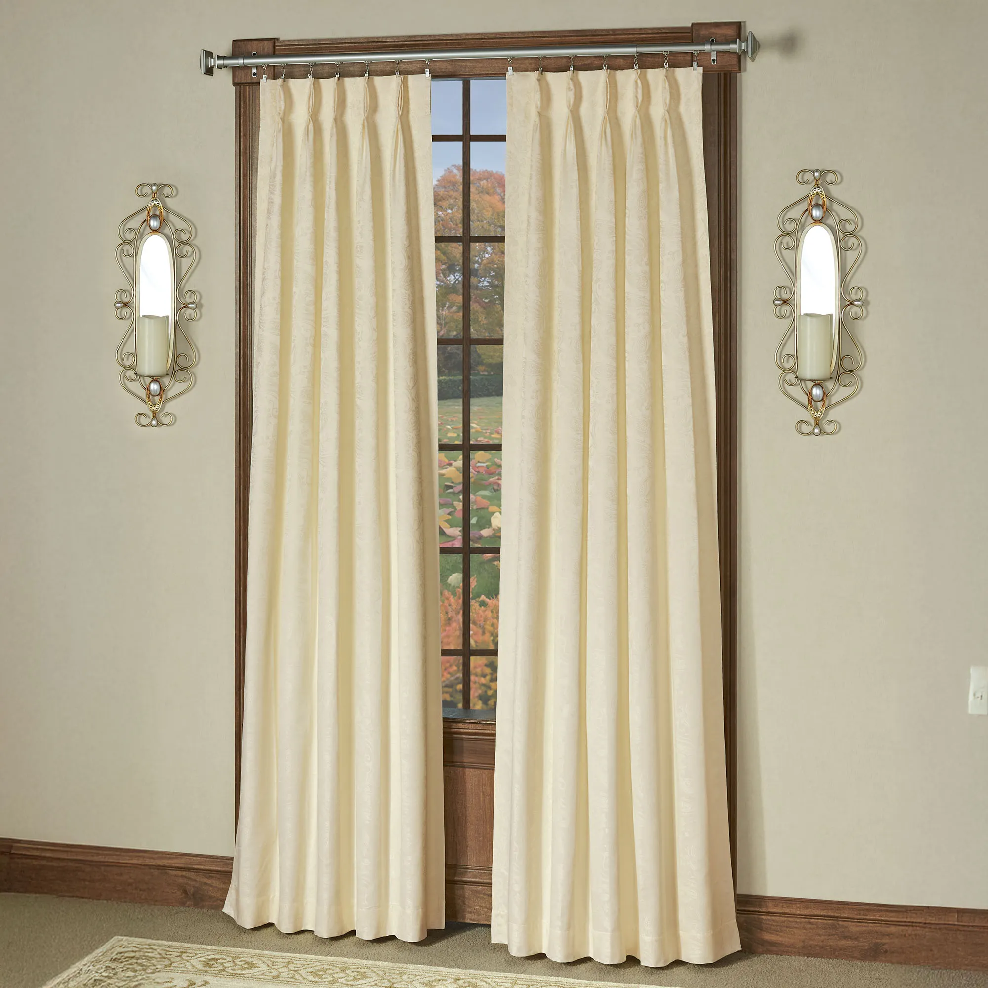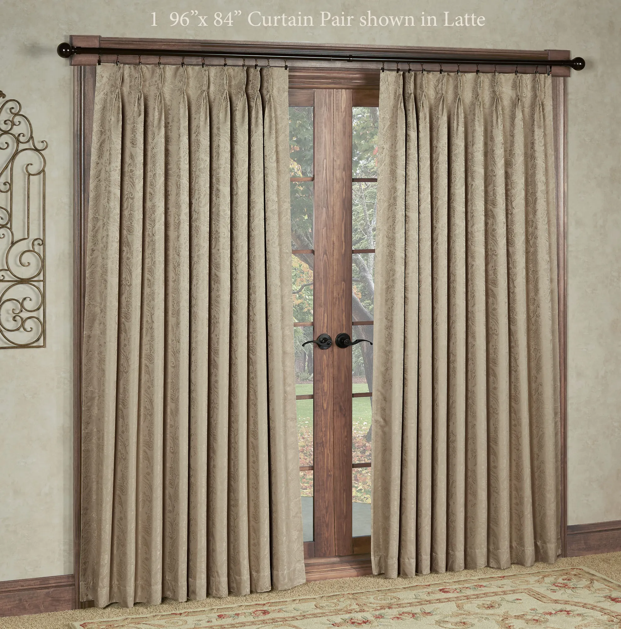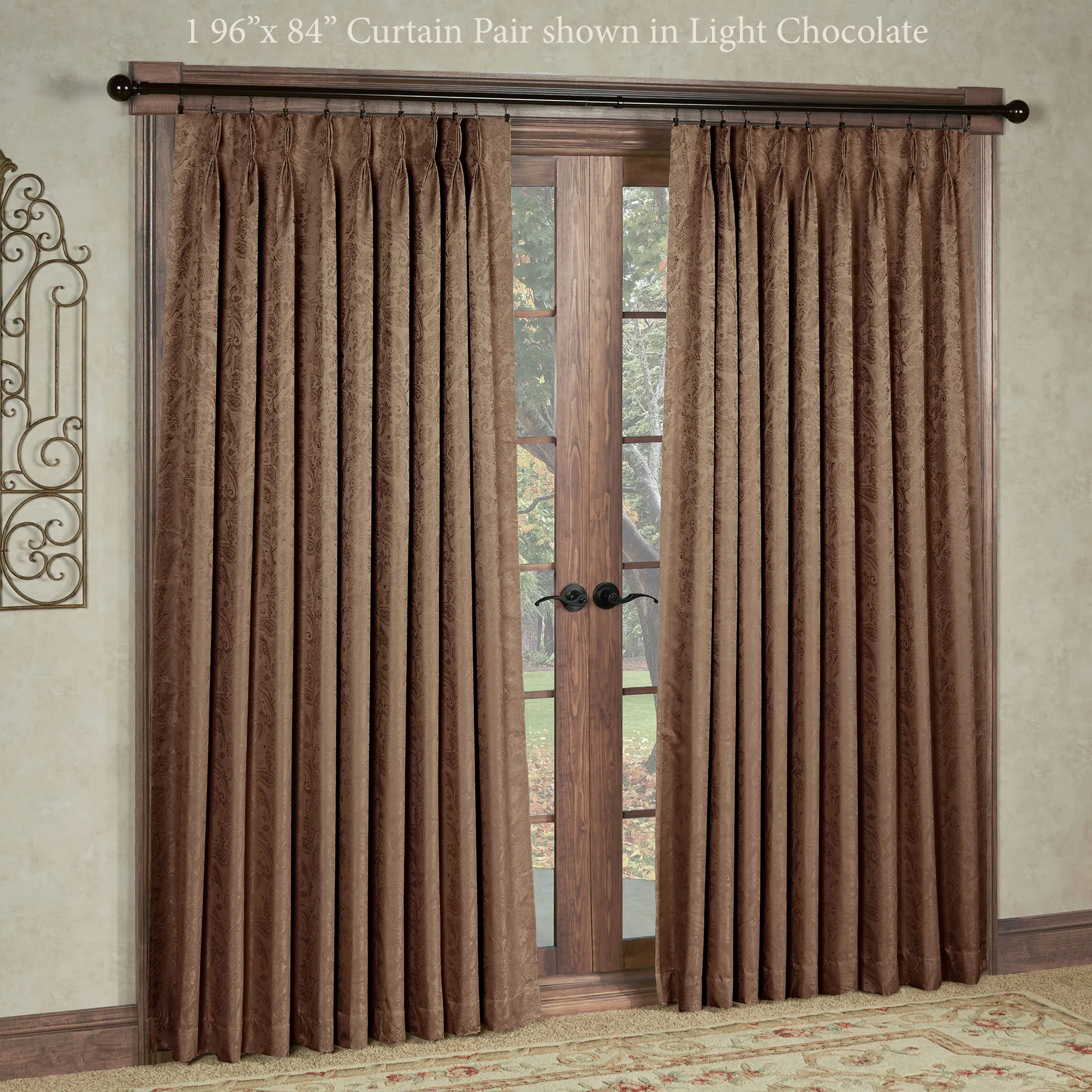 The elegant Gabrielle Pinch Pleat Window Treatment features a subtle paisley design on a solid color. The energy-saving, thermal window treatment helps to reduce light, reduce noise for a better night's sleep, and cut heating and cooling costs. The polyester window treatment has an acrylic foam backing; curtains have a pinch pleat design. Use your clip rings or drapery pins on the curtains to complete the tailored look; click on Details for the clip requirements. Specify Curtain Pair, Wide Curtain Pair, Patio Panel, or Rod-Pocket Valance. Choose Ivory, Crimson, Federal Blue, Latte, Light Chocolate, or Pear. Crimson has a light pink foam backing. Machine wash. Imported. Curtain pair width is the total width of two panels together.