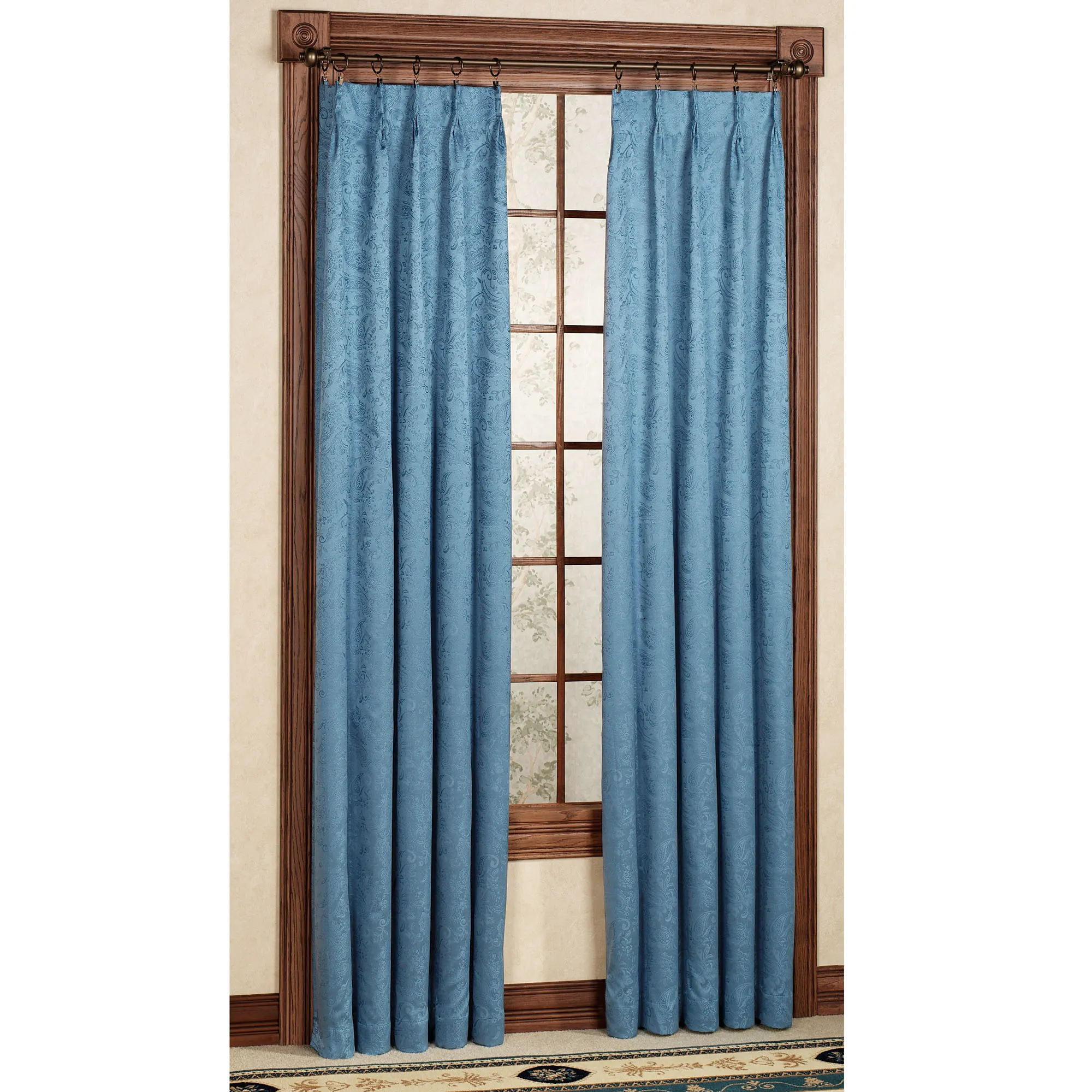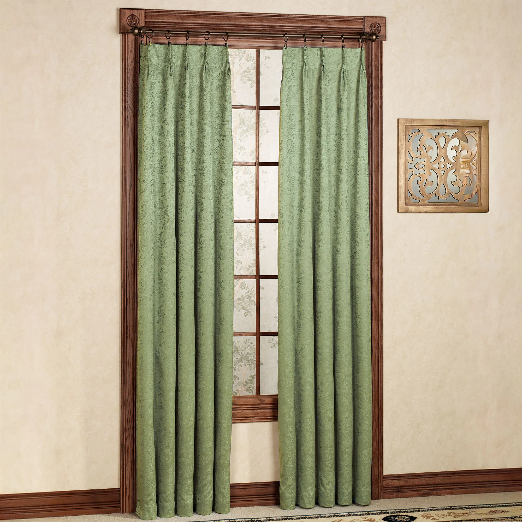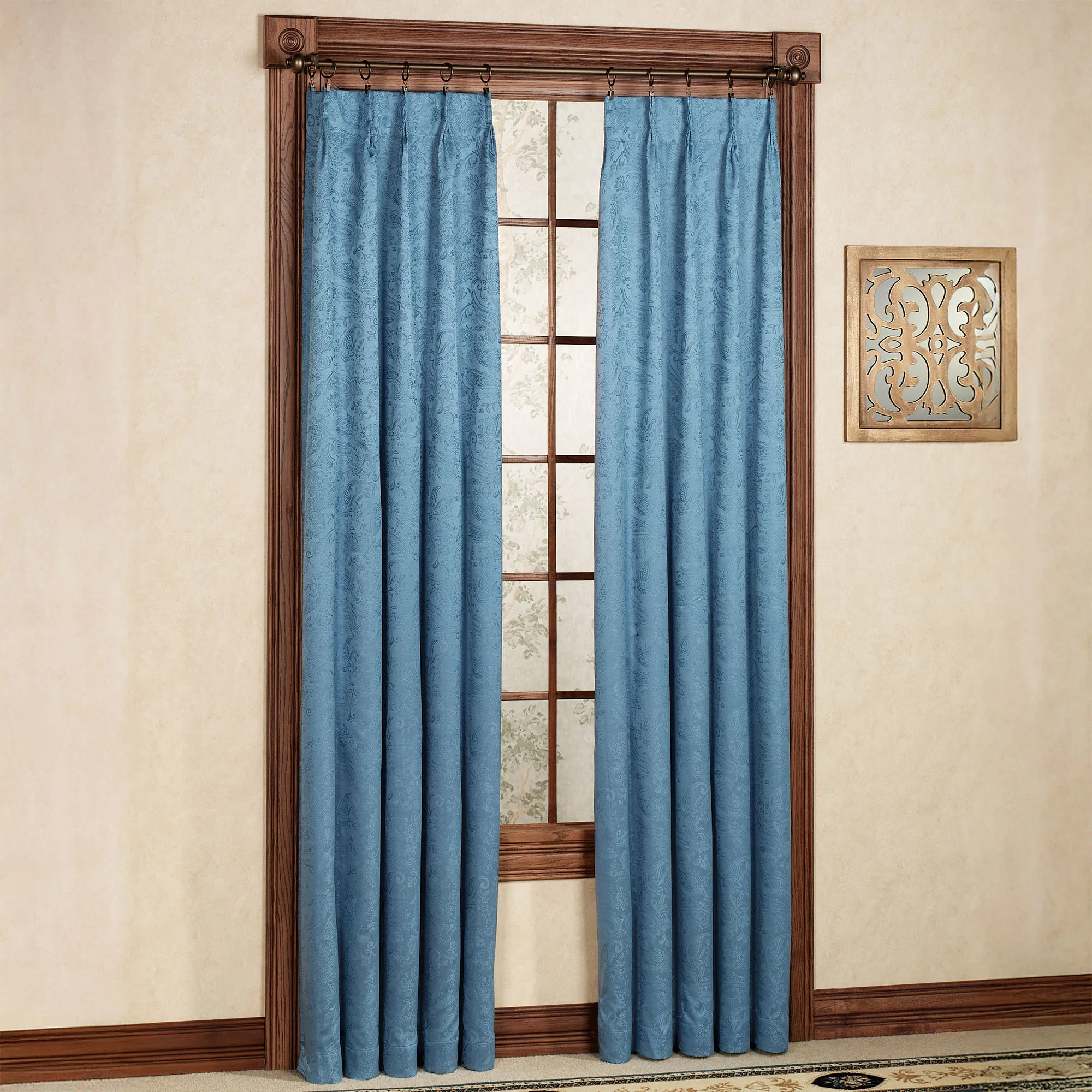 • Window treatment features a subtle paisley design