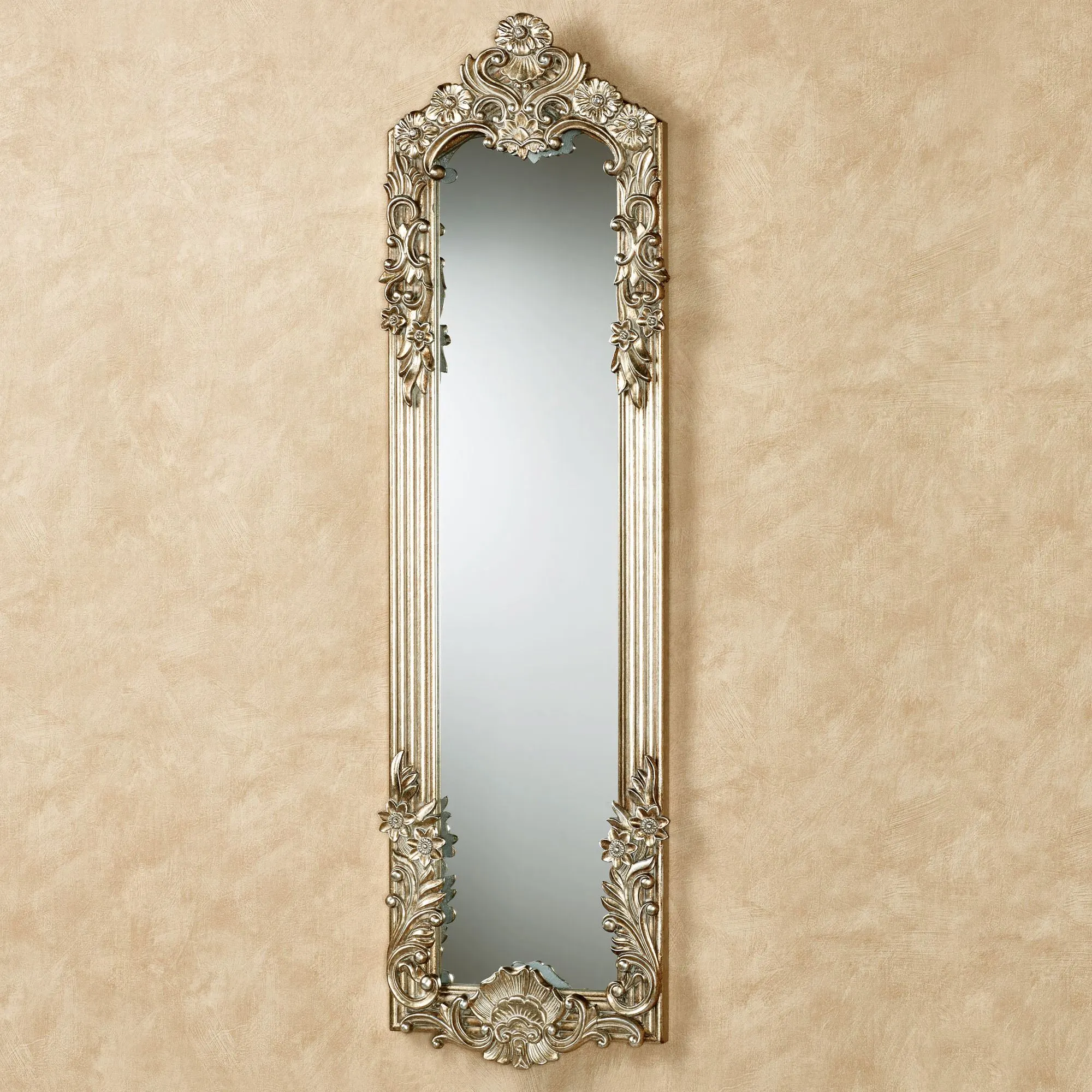 The Gadsden Small Floral Wall Mirror is adorned with flowers, petals, and scrolls. The resin frame with decorative accents is finished in platinum with gold highlights. Grooved sides add depth. Flat glass measures 7.5"x34". Overall, wall mirror measures 11"Wx1.5"Dx40"H; weighs 10 lbs.