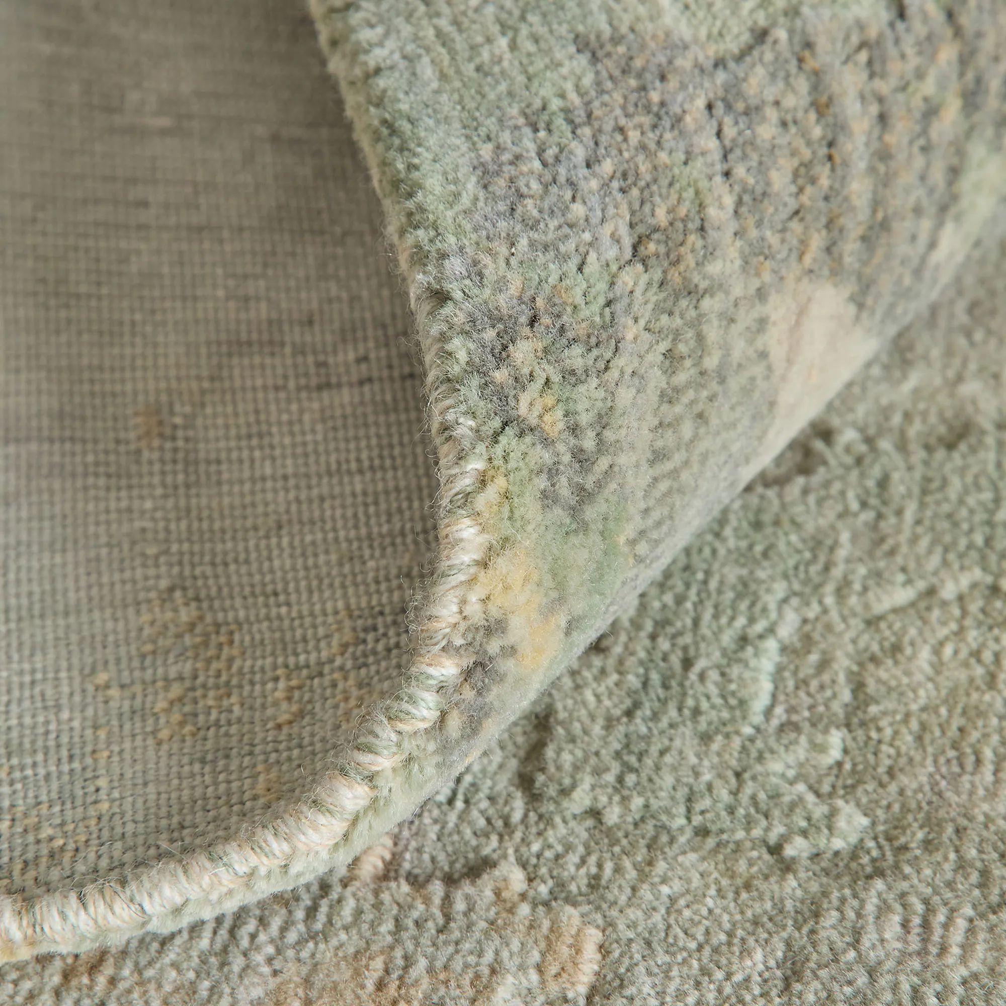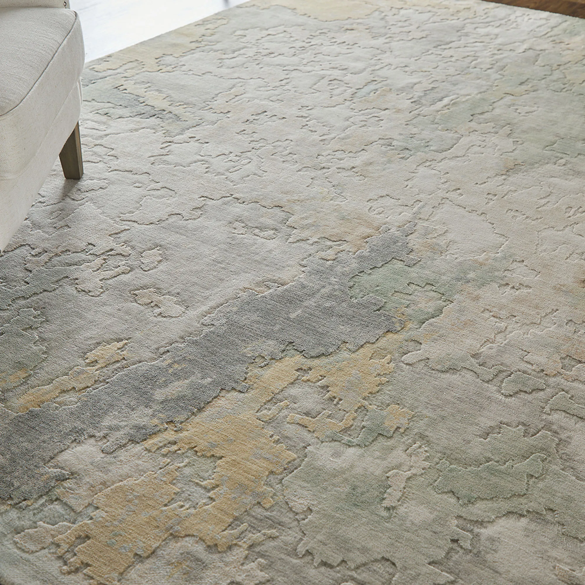 The Gaia Rug exudes an innate beauty via the rich texture, soft natural hues, and contemporary appeal. Power-loomed from a New Zealand wool and nylon blend, the .35" thick area rug features an expansive hi-low textured pile detailed with handcarving and inspired by natural topography. With a tonal look that adds depth and dimension to a space, the soft color palette fills the rug with shades of green, cream, beige, linen, and gray. Backing is jute. We recommend professional cleaning by a rug cleaner. Imported.