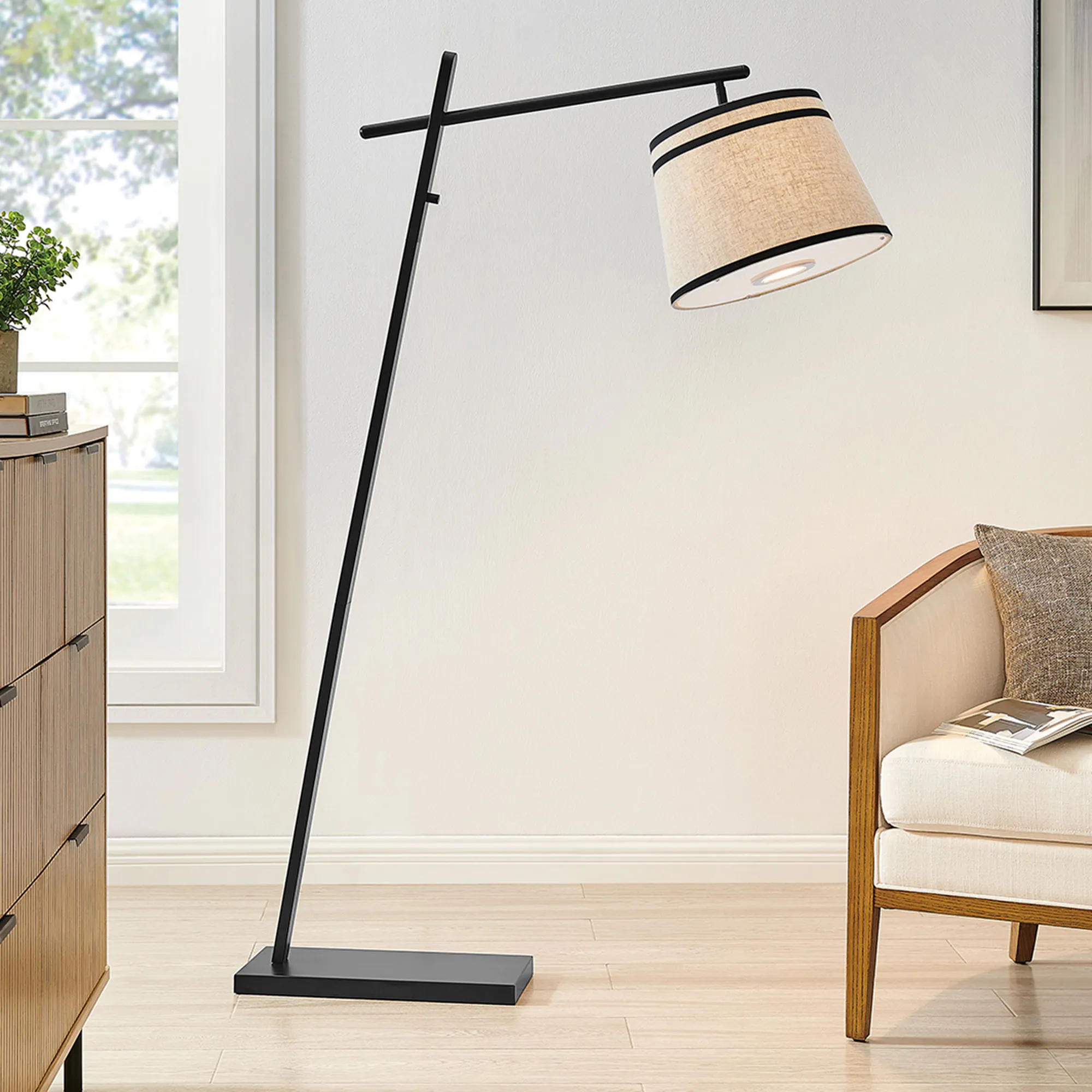 The Gaines Floor Lamp provides a stylish look with streamlined detailing. Finished in black, the lamp features a rectangular metal base supporting a long crossing, angular neck. Accented with black trim, the light beige fabric shade adds a neutral complement and can be adjusted for the perfect angle. The dual lighting design provides an integrated softer accent light at the bottom of the shade and standard inner bulb lighting. UL listed. The unique lamp includes a built-in 5W LED bulb and requires your one 60W bulb to operate the three-way lighting (accent, inner, or both). Floor lamp has a switch on the neck. Overall, measures 34.5"Wx14"Dx62"H and weighs approx. 26 lbs.