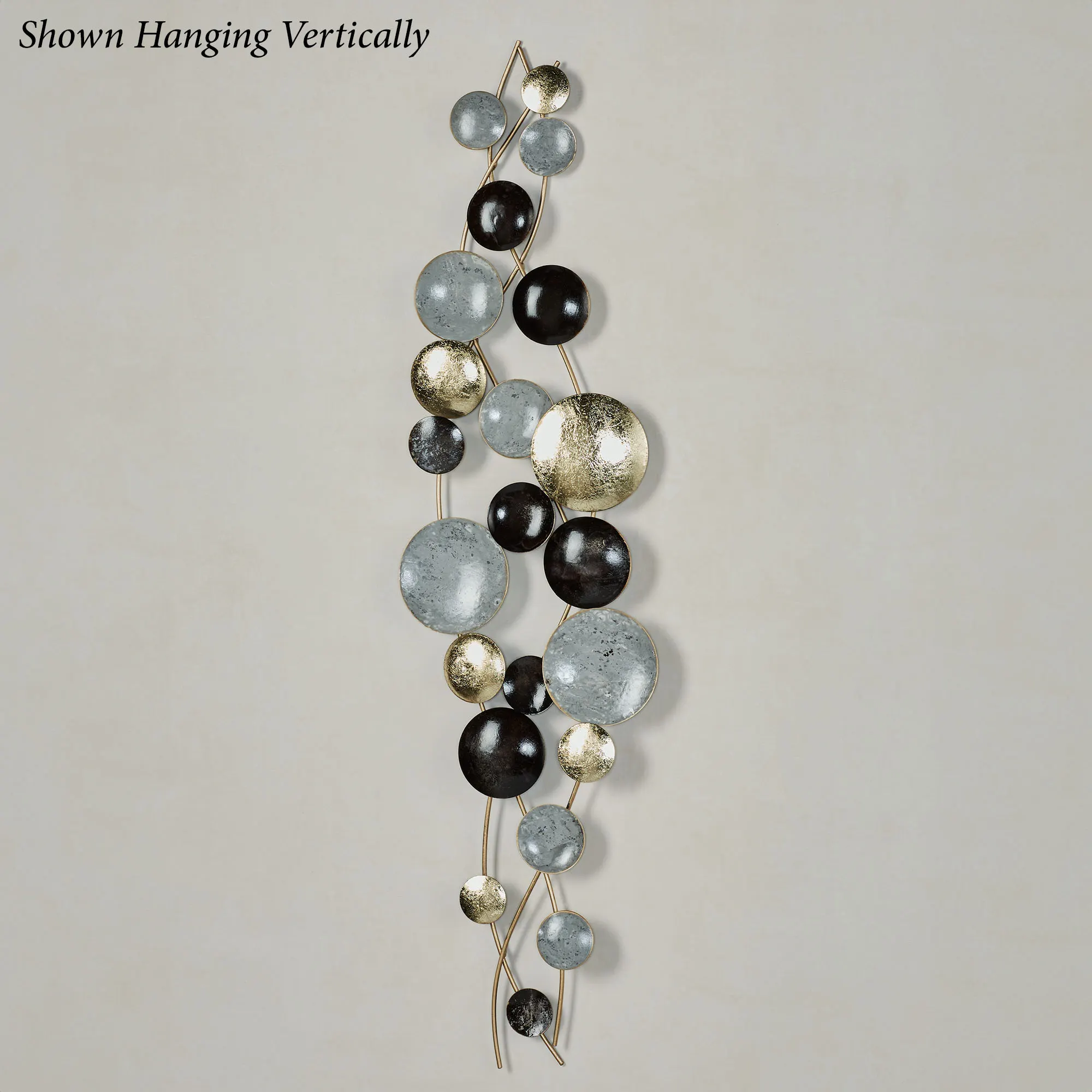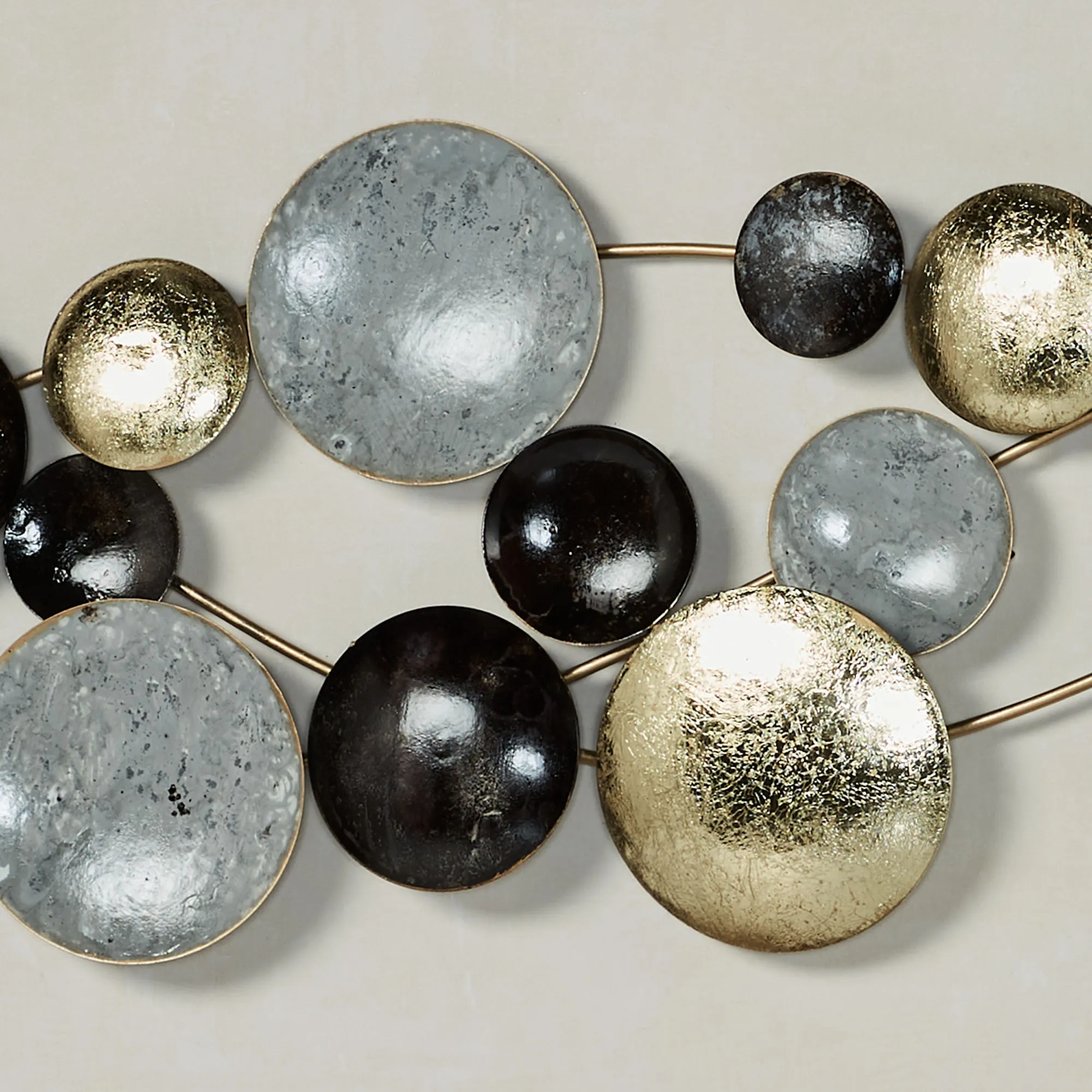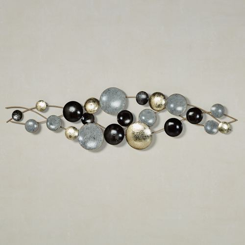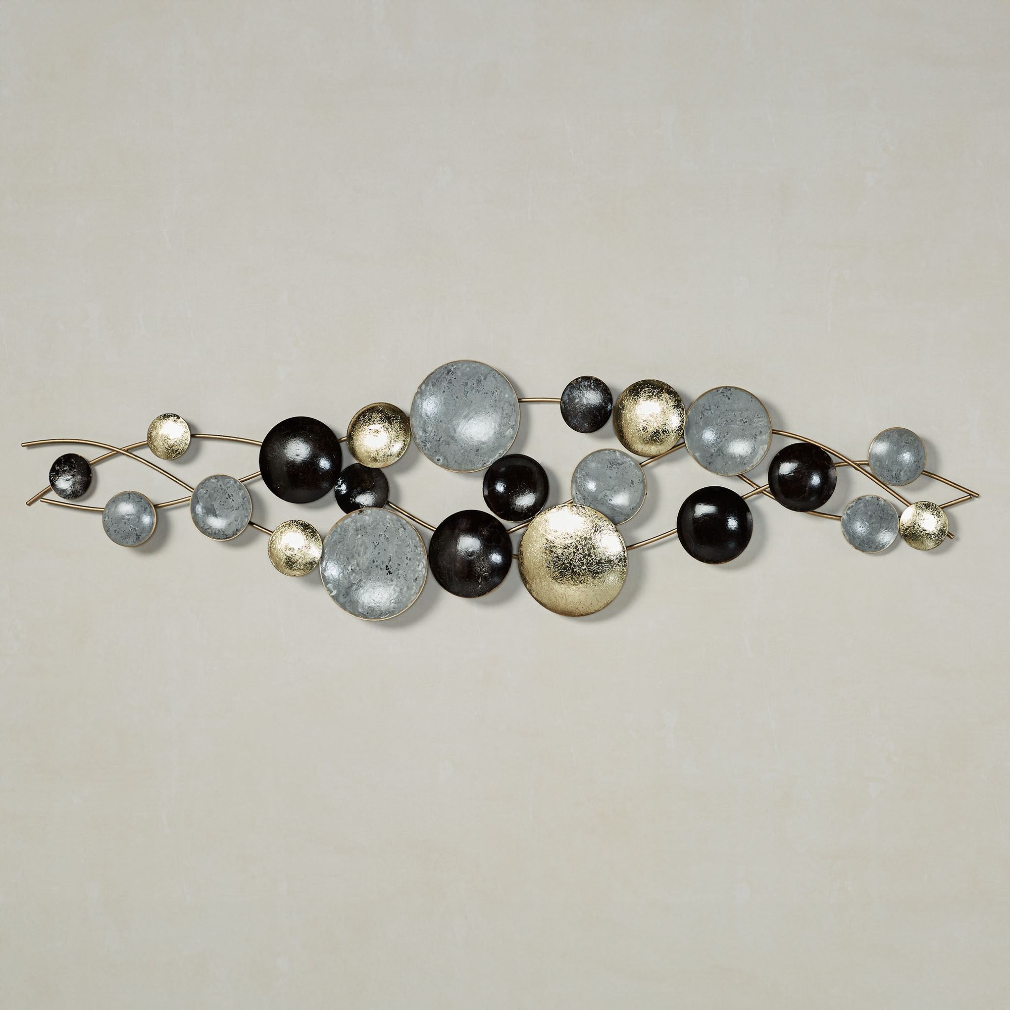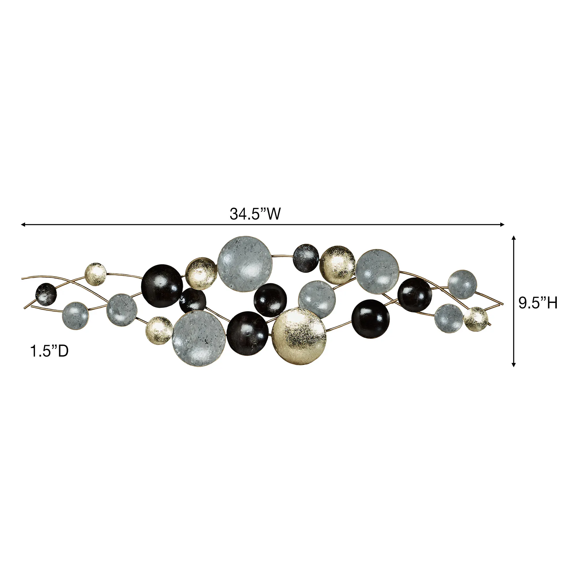 The concave and convex discs on the Galactic Abstract Wall Art are out of this world. Made of metal, this hand-finished wall art has three wavy gold rods filled with discs in gold foil, gray, and black. Modern wall sculpture may hang horizontally or vertically. Measures 34.5"Wx1.5"Dx9.5"H.
