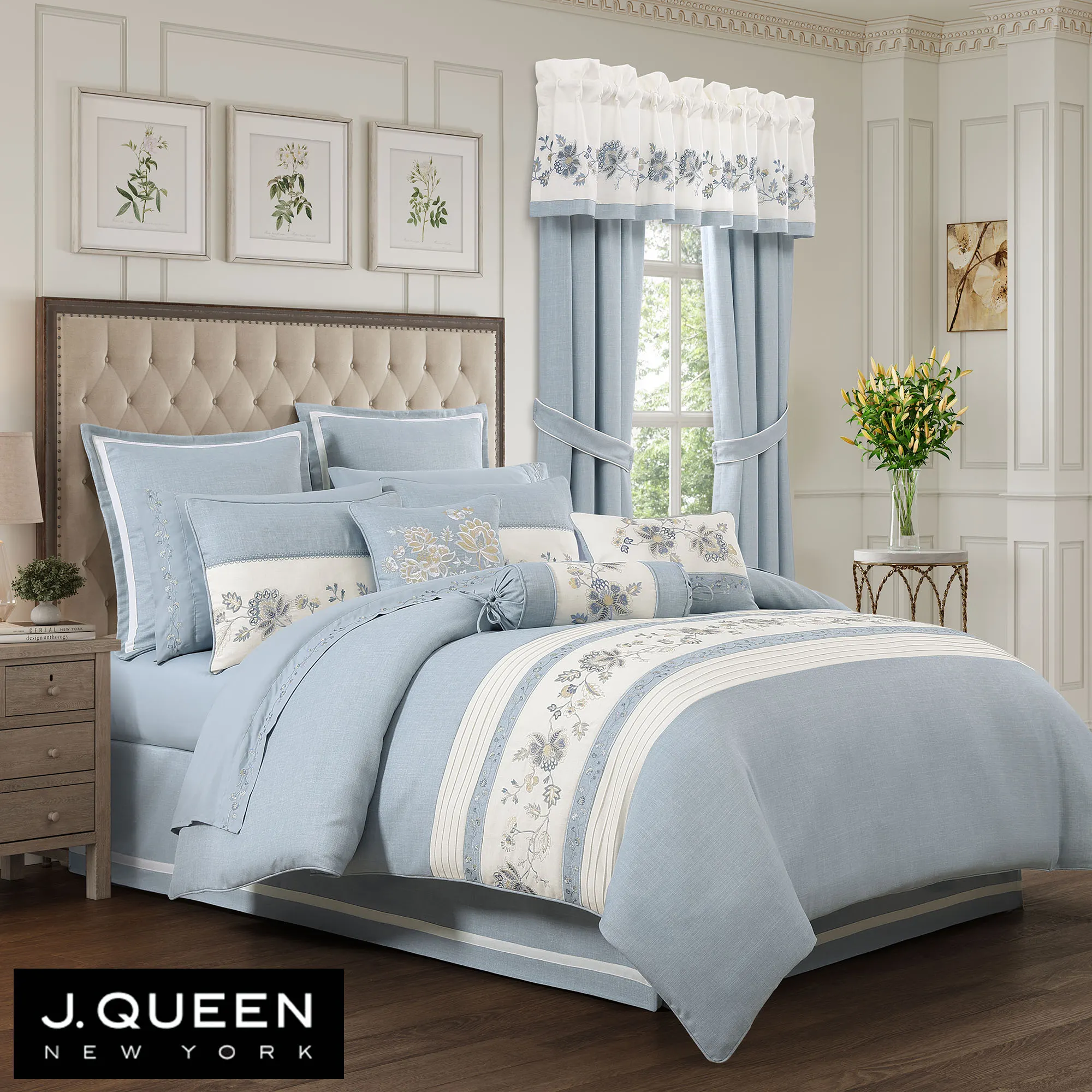 Garden Bloom Chambray Blue Embroidered Floral Comforter Set Bedding by J Queen New York