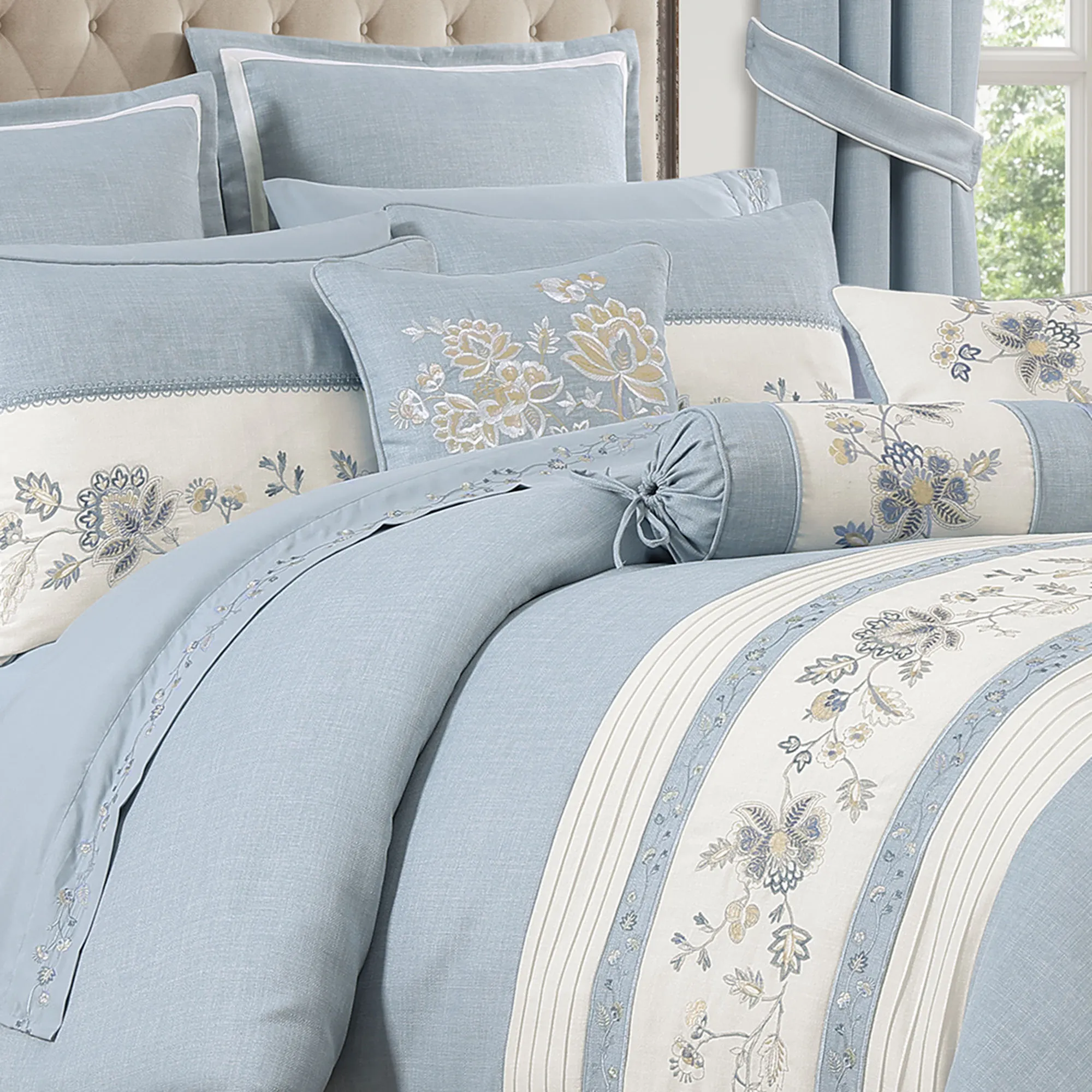 • Comforter and shams have floral embroidery
