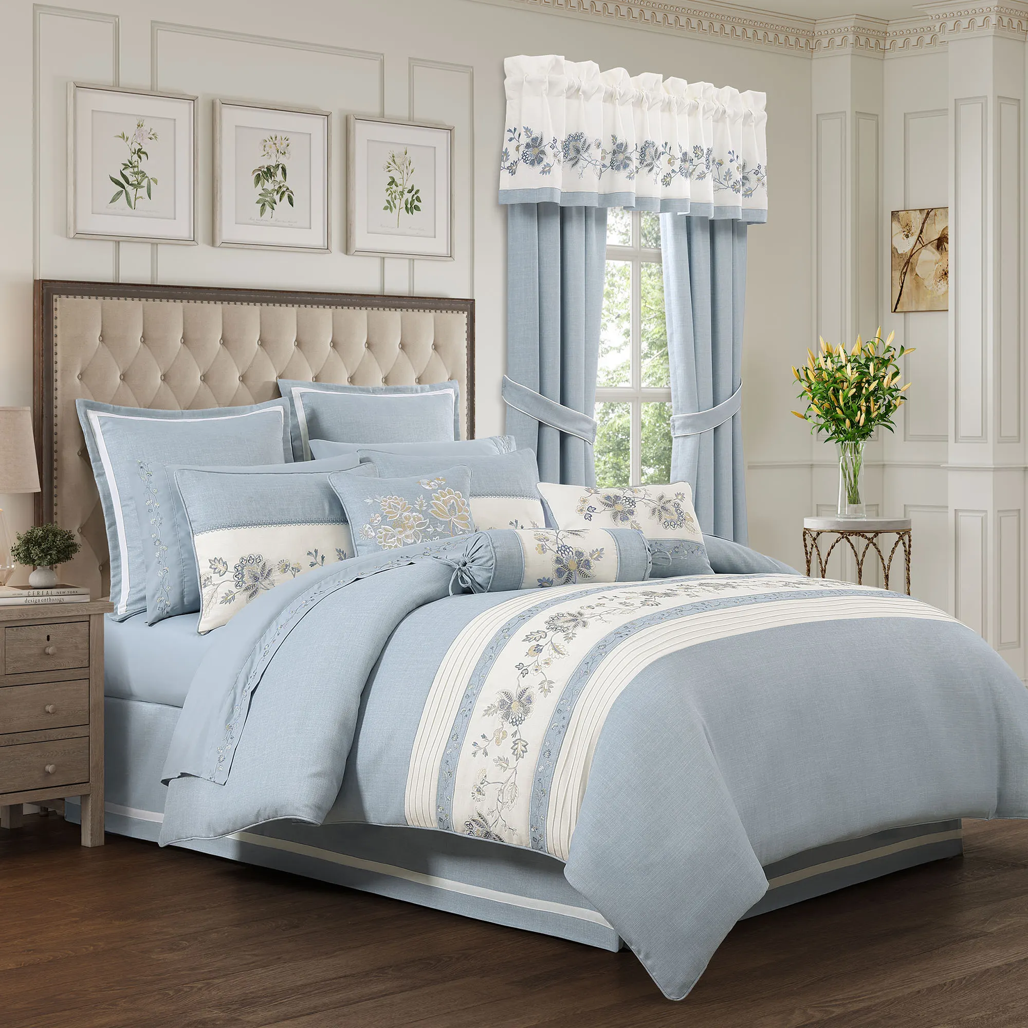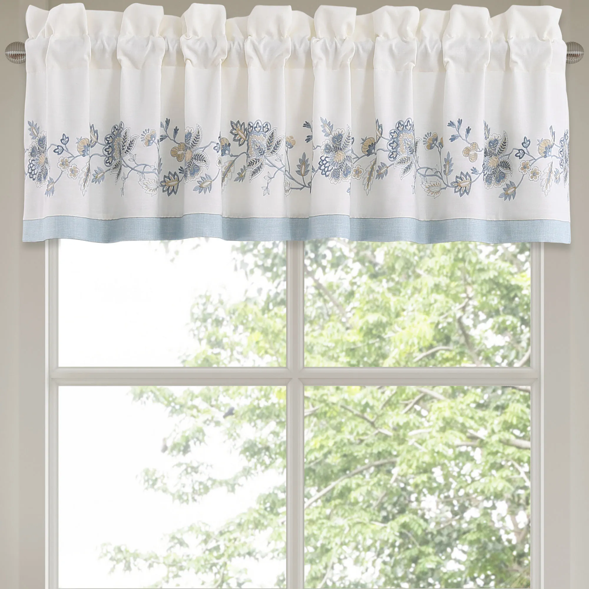 Tailored Window Treatment is lined. The chambray blue Wide Curtain Pair includes tiebacks and has a 3" rod pocket. Curtains are available in two lengths. Lined Tailored Valance has embroidered florals on ivory and pieced chambray blue accents. Rod pocket is 3.25".