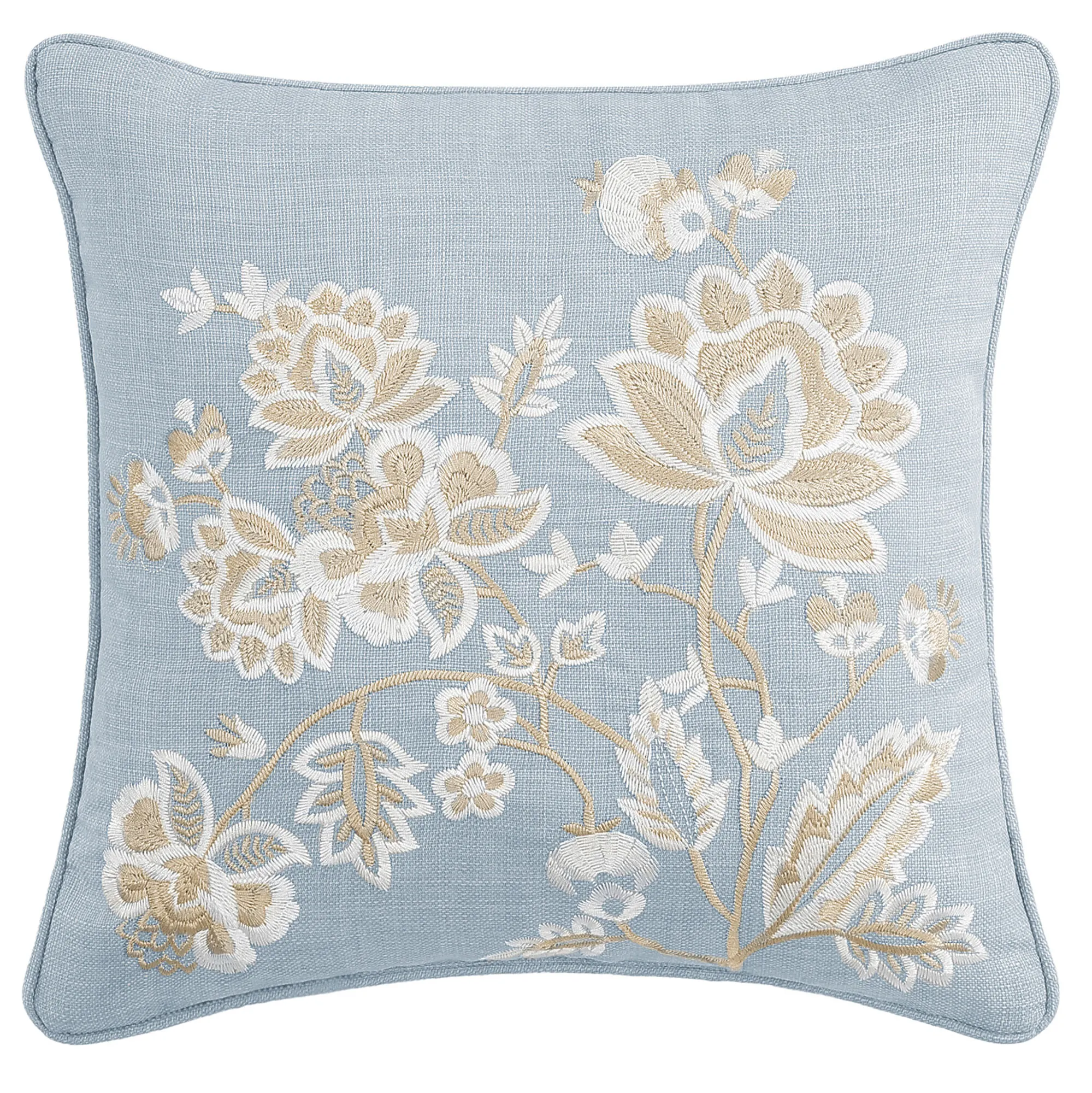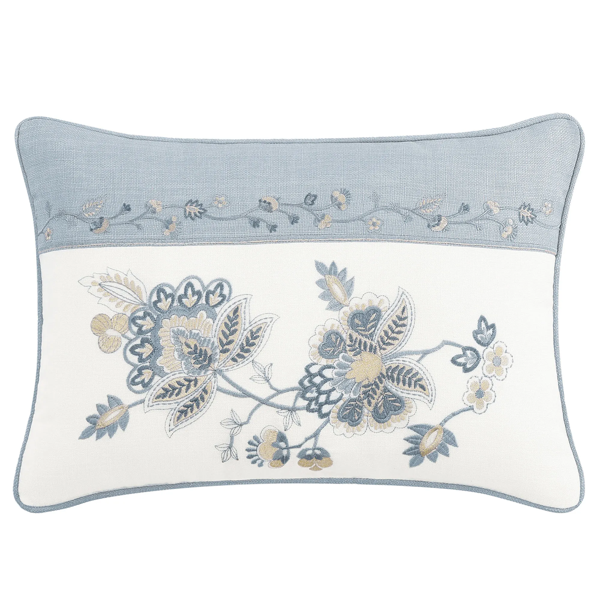 The chambray blue Pillows have embroidered designs. Spot clean. Rectangle has an ivory bottom and piped ends. Square has piped ends. Neckroll has an ivory center and tie ends.