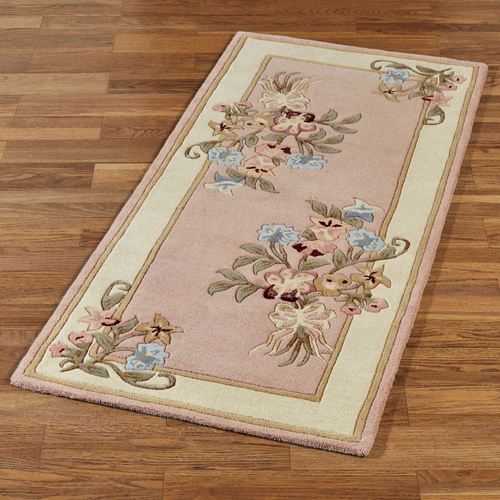 The handmade Garden Bouquet Floral Rug Runner blossoms with soft shades of dusty mauve, pale pink, blue, cornflower, and sage. With a lovely solid color field, the .75" thick, handcarved, and hand-tufted pure wool rug features lush bouquets, floral swags, and borders of ivory, beige, and solid. Backing is cloth-covered latex. Due to the handcrafted nature of this rug runner, slight variations may occur. We recommend professional cleaning by a rug cleaner. Made in India.