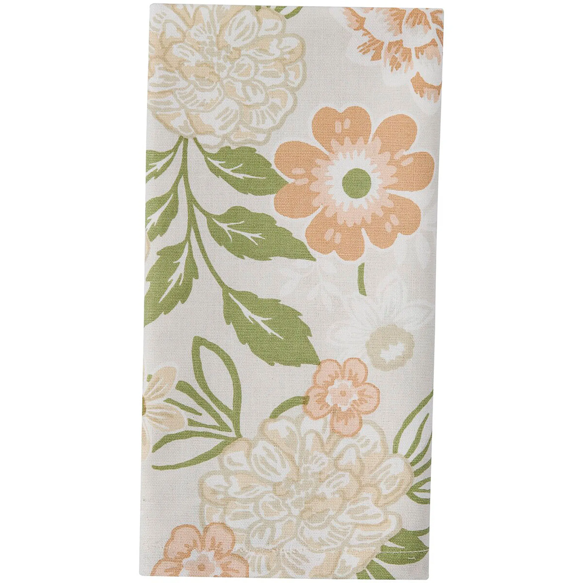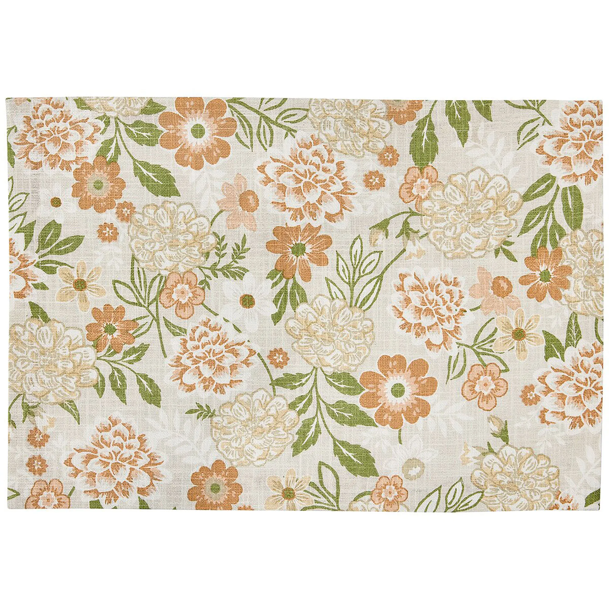 Garden Grace blooms from your tablescape. Scattered muted ginger, copper, bronze, white, and green leafy flowers blossom from the linen-colored cotton table accents for vintage-inspired floral allure. Table Runner is 13"W. Placemats are 19"x13"; sold as a four-piece set. Napkins are 18" sq.; sold as a four-piece set. Machine washable. Imported.