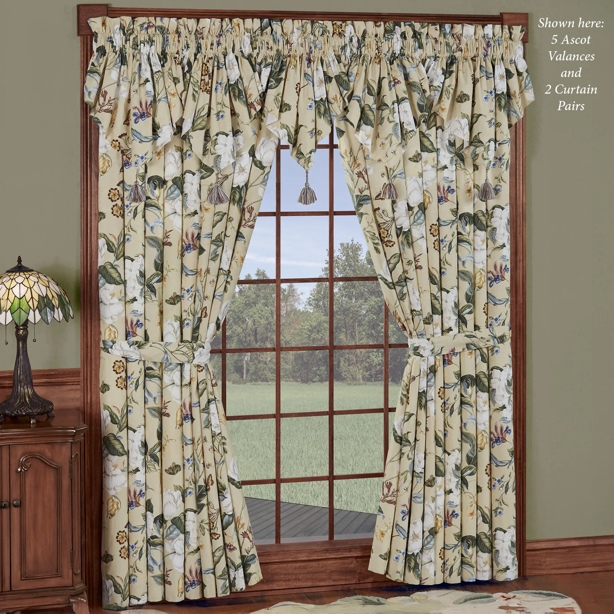Garden Images III Magnolia Floral Ascot Valances recall images licensed from the Colonial Williamsburg Foundation(R). Jacquard-woven cotton ascot valances have a primary design of garden flowers, magnolias, dogwood, and butterflies on a parchment ground. Each lined ascot valance has a removable tassel on the end. 3" rod pocket. Each is 52"Wx20"L. Dry clean. Imported. The curtain pair width is the total width of two panels together.