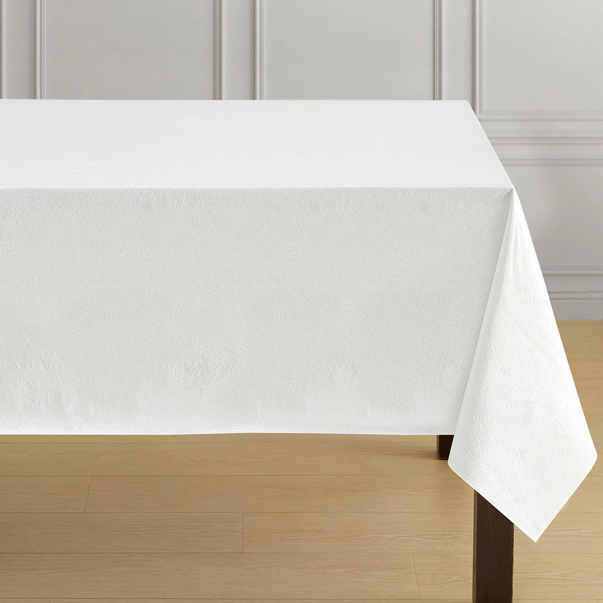 The Garden Lace Embossed Vinyl Tablecloth adds a subtle, elegant touch to your tablescape. Crafted from high-quality PVC, the waterproof tablecloth features an embossed classic floral design in a timeless white hue. Backing is polyester. Sold as one piece of fabric, the rectangle tablecloth can easily be custom cut to your table, buffet, console table, or kitchen island; measures 54"x108" overall. Simply wipe clean with a damp cloth. Imported.