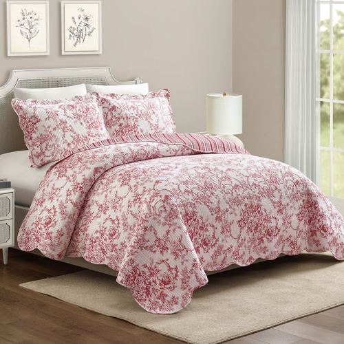 The enchanting Garden Toile Red Bedding is a sweet reminder that floral dreams do come true. The Mini Quilt Set includes a quilt and two shams. This lightweight, cotton bedding, from the Modern Heirloom Collection(R), features a delicate toile print in red on a white background. Quilt has channel quilting and scalloped, bound ends; reverses to a coordinating stripe print. Fill is cotton. Machine washable. Imported.