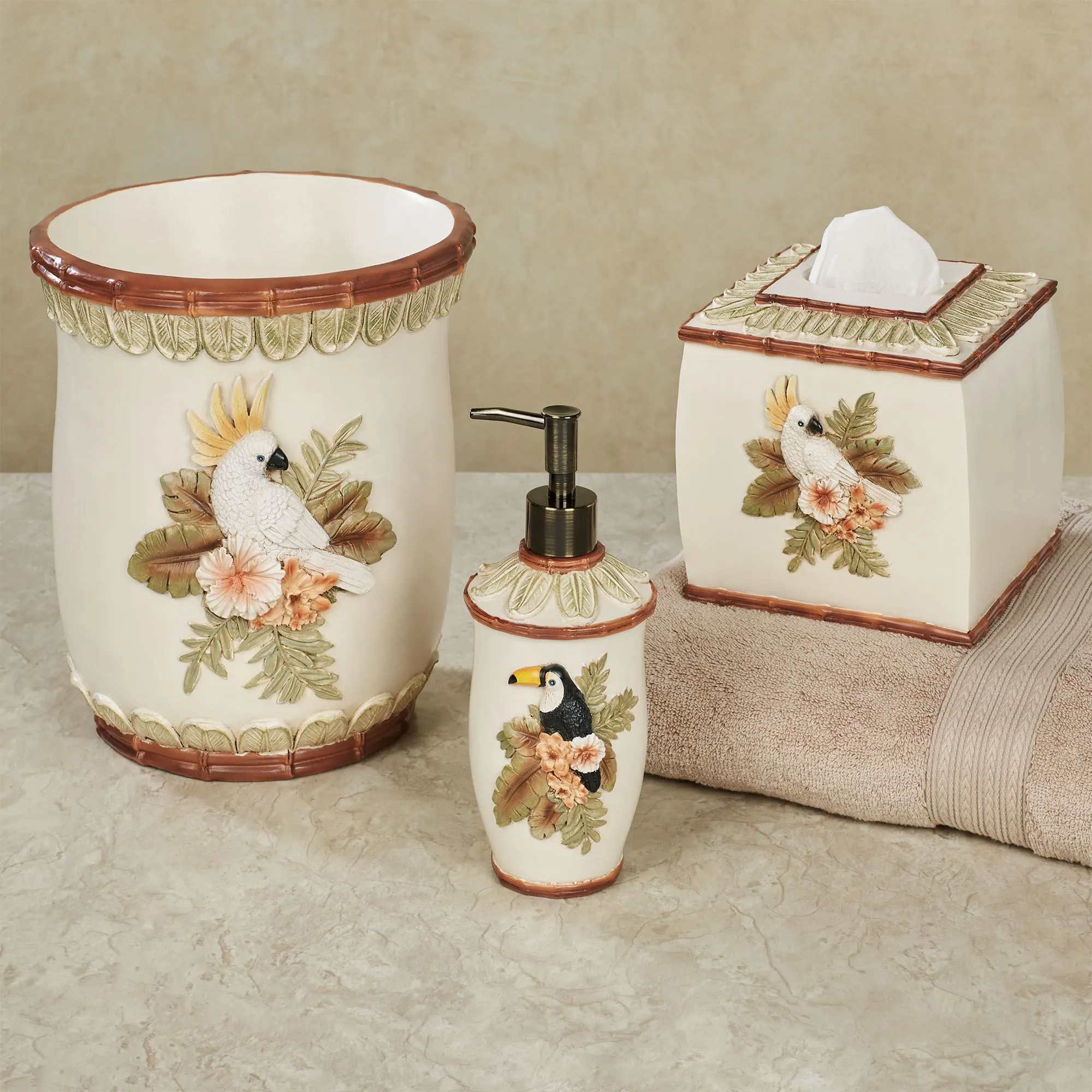 Embrace the beauty of the Garden Tropics with charming feathered friends. Handpainted with lovely detail, each ivory resin bath accessory features dimensional designs of burnt orange and ivory tropical florals and green palm leaves. One side has a black toucan bird in the flora, while the other has a white cockatoo. Bamboo-like trim and more palm leaves surround the edges. Bath accessories are sold individually. Lotion/Soap Dispenser is 4"dia.x9"H. Tissue Cover is 6.5"Wx7"Dx6"H. Wastebasket is 9.5"dia.x10"H.