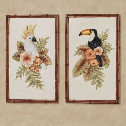 Embrace the beauty of the Garden Tropics with charming feathered friends. Handpainted with lovely detail, this dimensional resin wall plaque set features ivory backgrounds trimmed with bamboo-like designs. A white cockatoo and black toucan adorn the center of the wall art. The birds sit in lush green tropical leaves and flowers in burnt orange and ivory hues. Each wall plaque is 10"Wx1.5"Dx16"H.