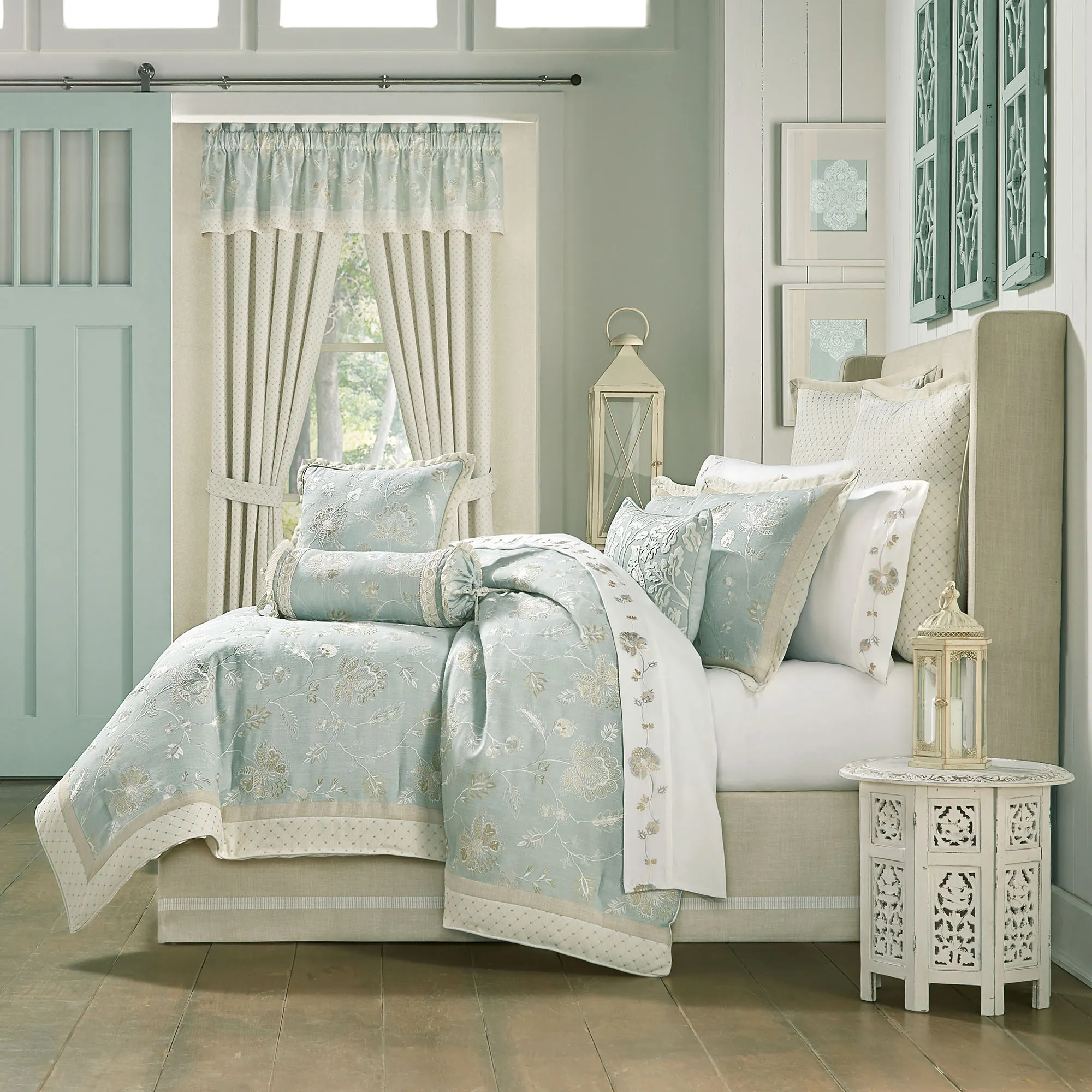 Wake to charming floral designs on the Garden View Comforter Set. This woven polyester comforter, by J. Queen New York, features embroidered motifs. Oversized, piped comforter has embroidered florals on aqua mist, a natural band, and embroidered diamond designs on ivory. Back is solid white. Bedding fill is polyester. Dry clean. Imported. Sorry, the sheets shown are not available.