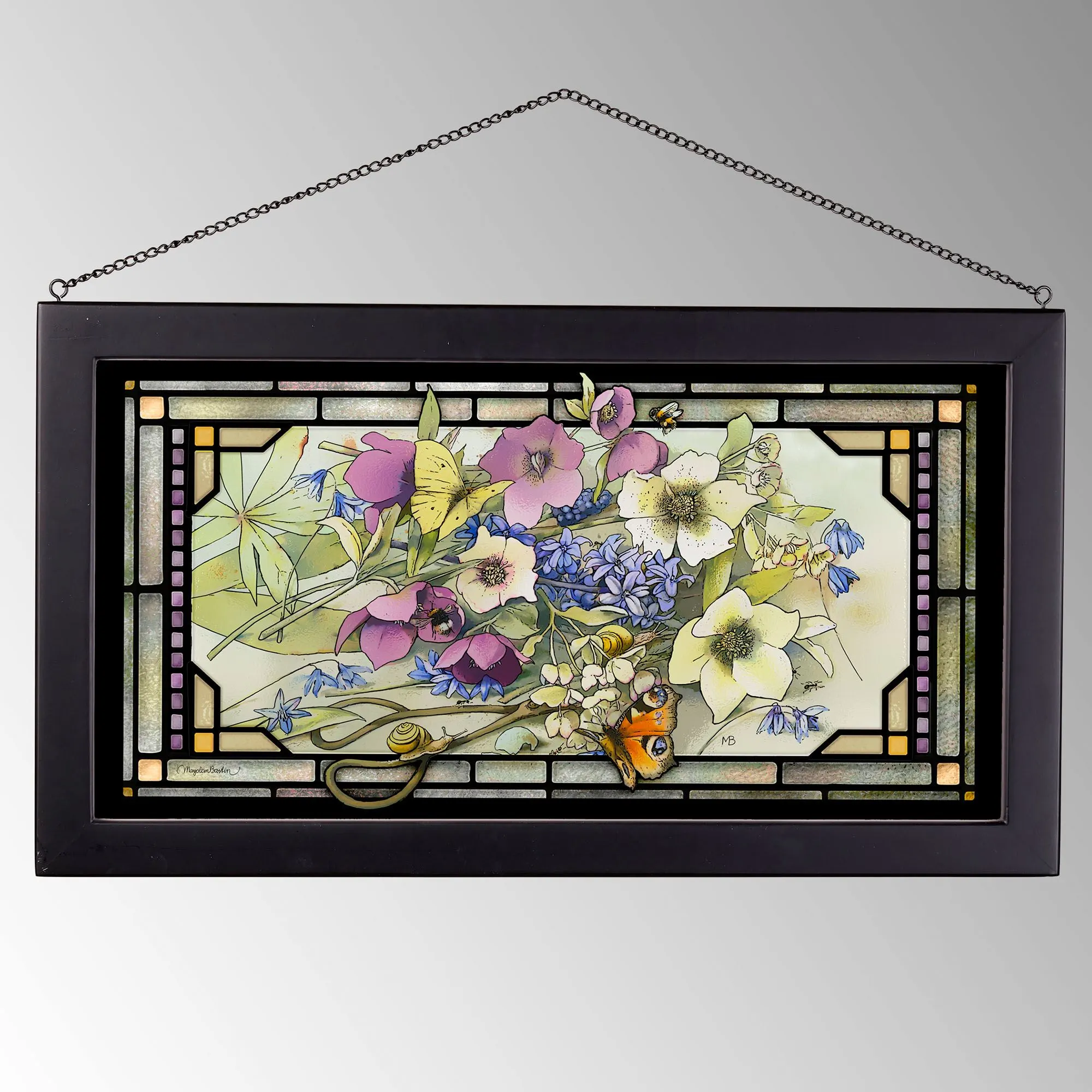 Cuttings of the Gardener's Delights are also the favorites of Mother Nature's creatures. Designed by Art Brand Studios(TM) and Wild Wings(R) from original artwork by artist Marjolein Bastin, this floral window art panel celebrates the wonder found in the natural world. Printed with fade-resistant ink, the glass panel resembles charming stained glass with a scene of freshly cut pastel flower blooms being visited by butterflies, snails, ants, and bees. A black wooden frame and included metal hang chain complete the design. Measures 23"Wx1"Dx13"H.