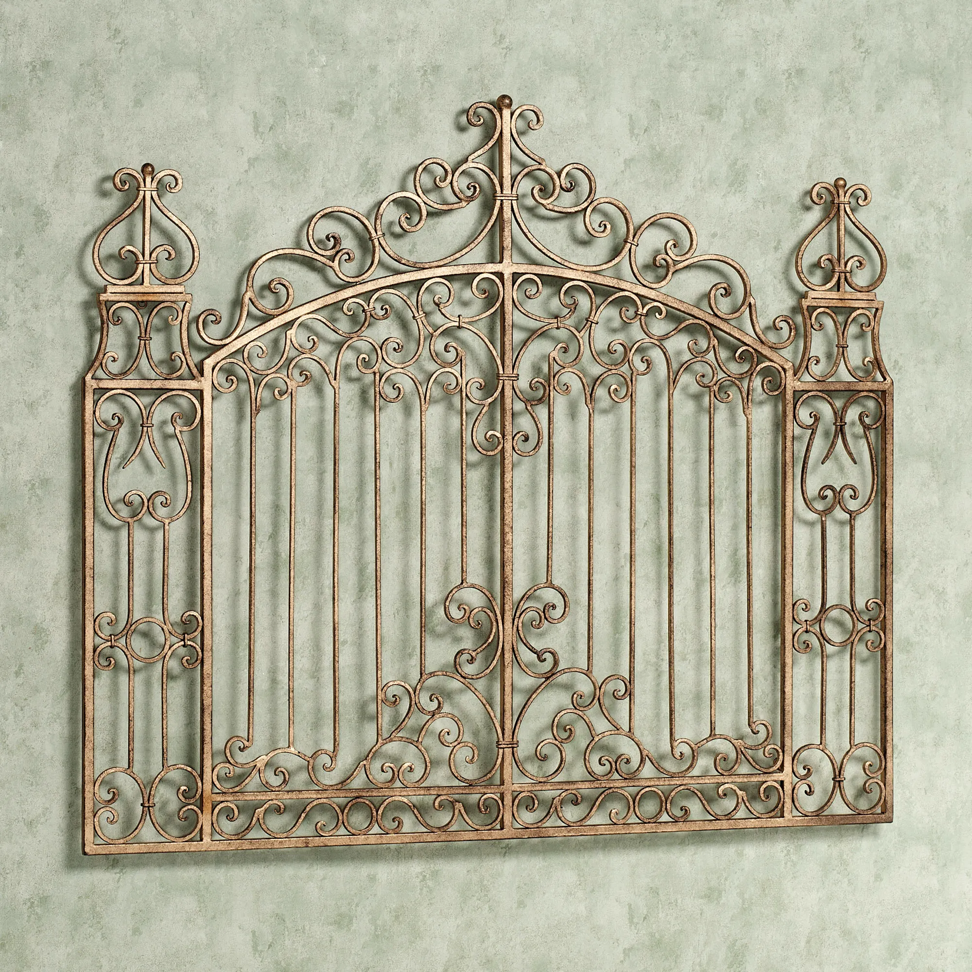 Discover the beauty of the countryside as you enter through the Gates of Tuscany. This handcrafted metal wall grille has a handpainted antique gold finish. Wall accent features a decorative scrolling motif. May be used indoors or outdoors year round. Measures approx. 45"x38"; weighs 23 lbs.