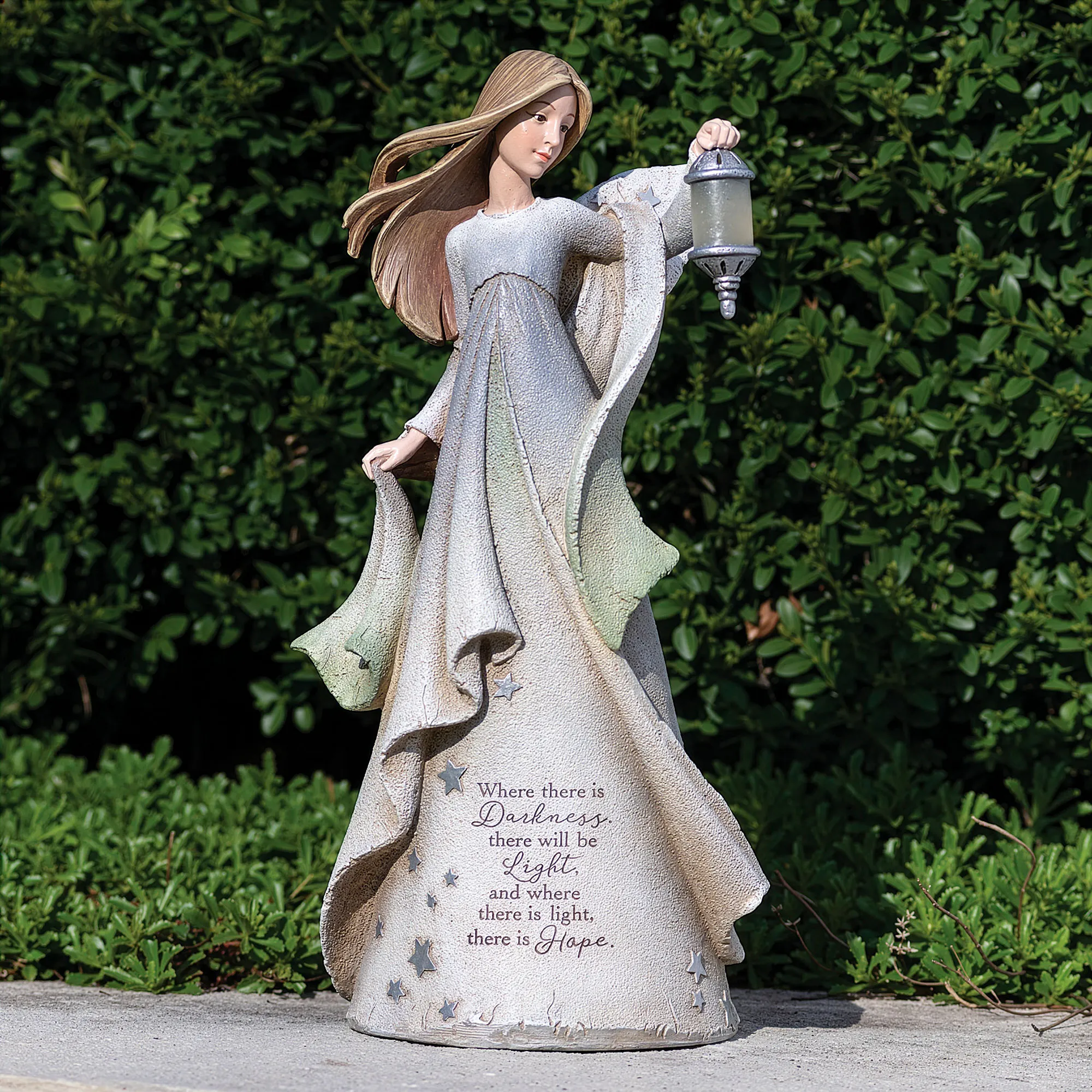 The Gazing Angel Outdoor Statue, from Heavenly Blessings exclusively by Roman, Inc., provides graceful inspiration designed by artist Karen Hahn. Wearing a textured dress in neutral tones of natural, blue, gray, and green, the lovely resin angel holds a solar-powered LED-lighted lantern aloft that gently glows through the night. Her dress reads "Where there is Darkness, there will be Light, and where there is light, there is Hope" next to star motifs; more stars decorate her charming wings. Outdoor seasonal use; do not expose this statue to freezing temperatures. Overall, the angel garden sculpture measures 8"Wx7"Dx16.5"H.