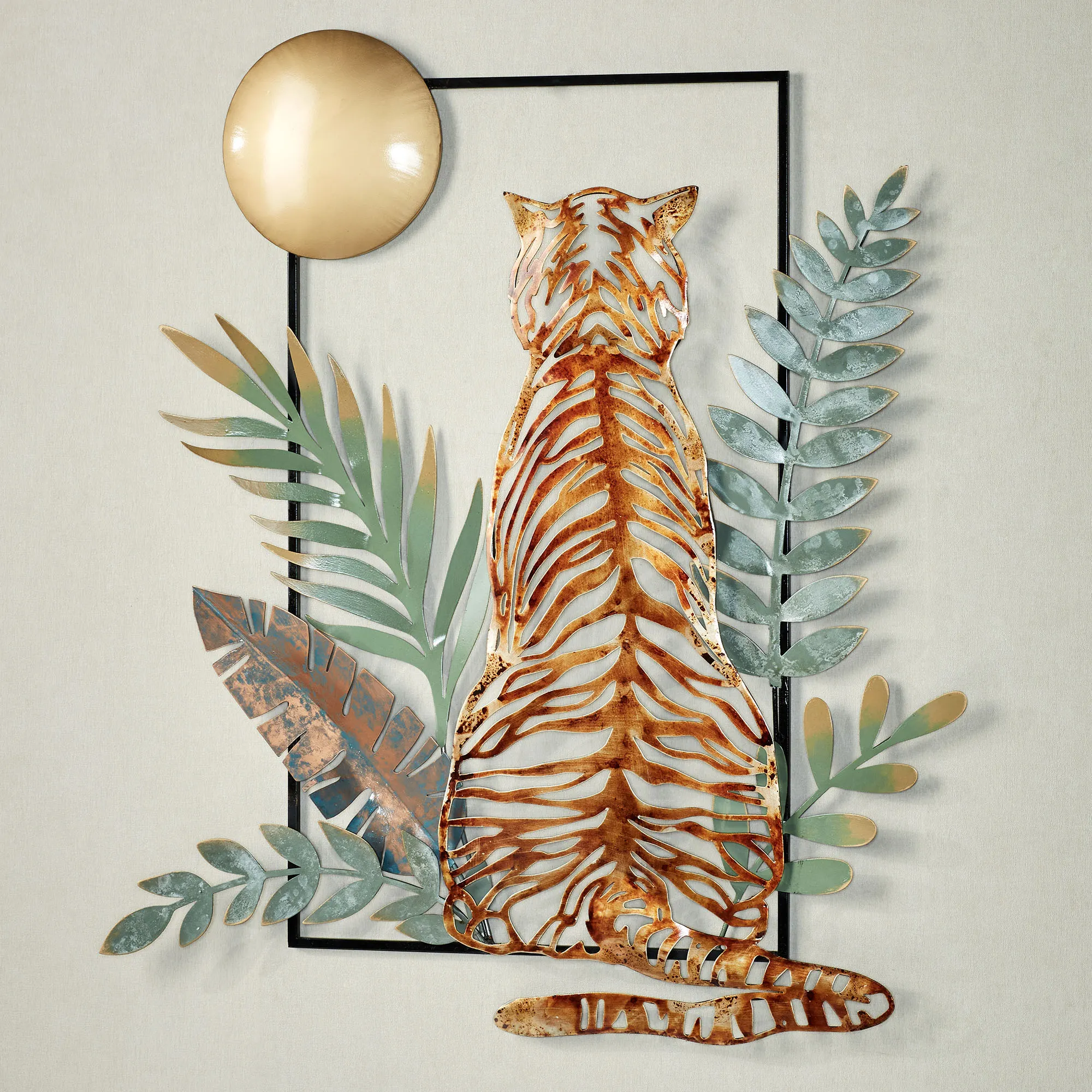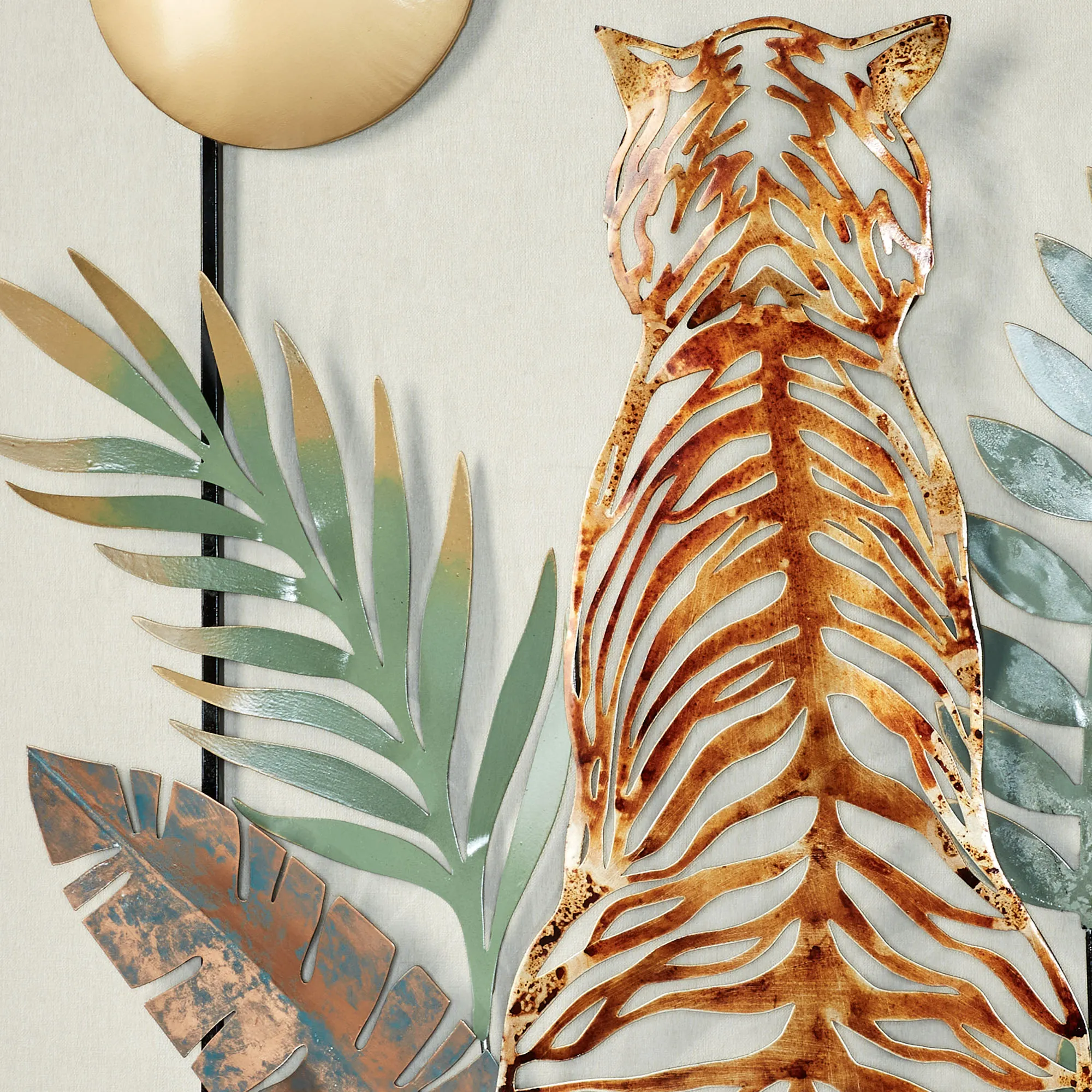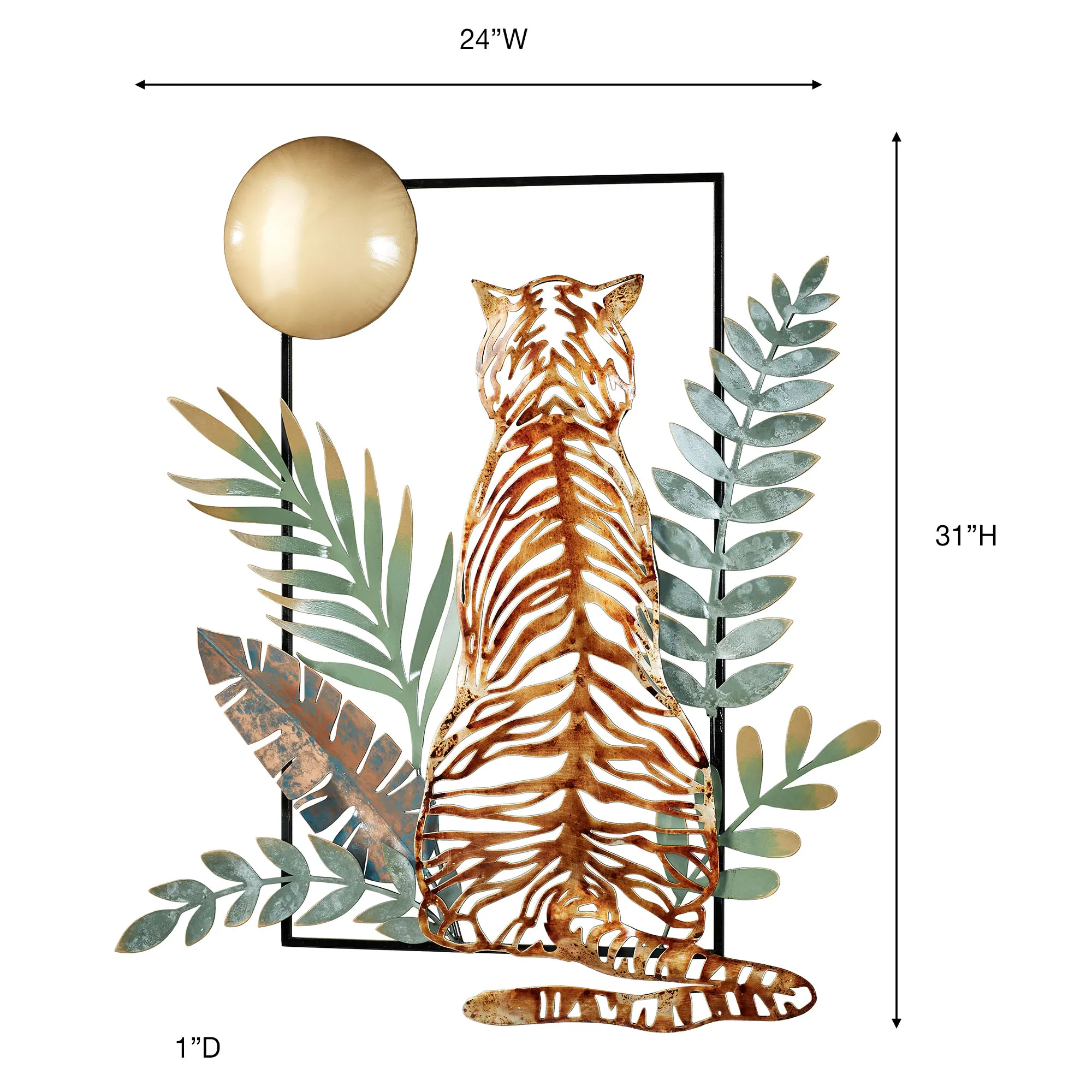 The Gazing Tiger watches the sun's slow arc across the horizon. Hand-finished in a unique alcohol ink process with handpainted accents, the metal wall art features an openwork black rectangle with a bronze and gold striped tiger sitting on the edge. Gold-, copper-, and silver-accented green tropical palm leaves surround the tiger, while a golden sun sets in the distance. The unique dimensional openwork design can accent your indoor space, covered porch, or enclosed patio. Overall, the tiger wall sculpture measures 24"Wx1"Dx31"H.