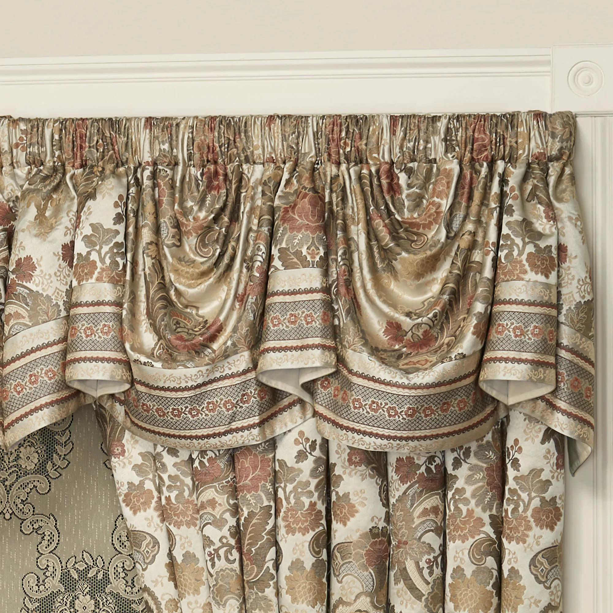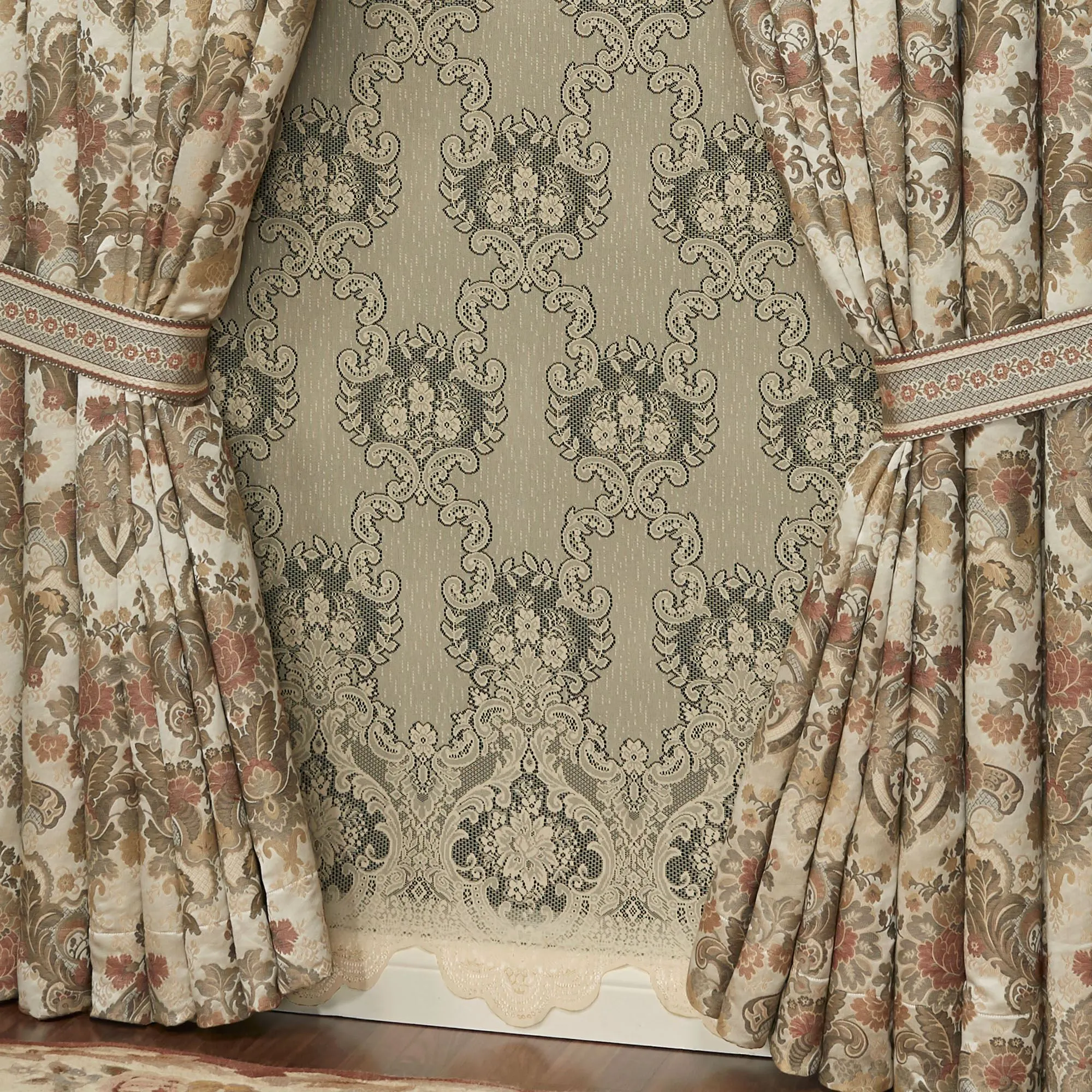 Classic beauty delights in traditional style throughout the Geneva Window Treatment. The jacquard-woven polyester window treatment features Jacobean floral damask in inviting shades of dark gray, gold, paprika, taupe, and sienna on a champagne ground. Window treatment has 3" rod pockets. Specify Empire Valance or Wide Curtain Pair. The lined Empire Valance is pieced with a stripe bottom. Wide Curtain Pair has tailored edges. Striped tiebacks are included. Dry clean only. Imported. The curtain pair width is the total width of two panels together.