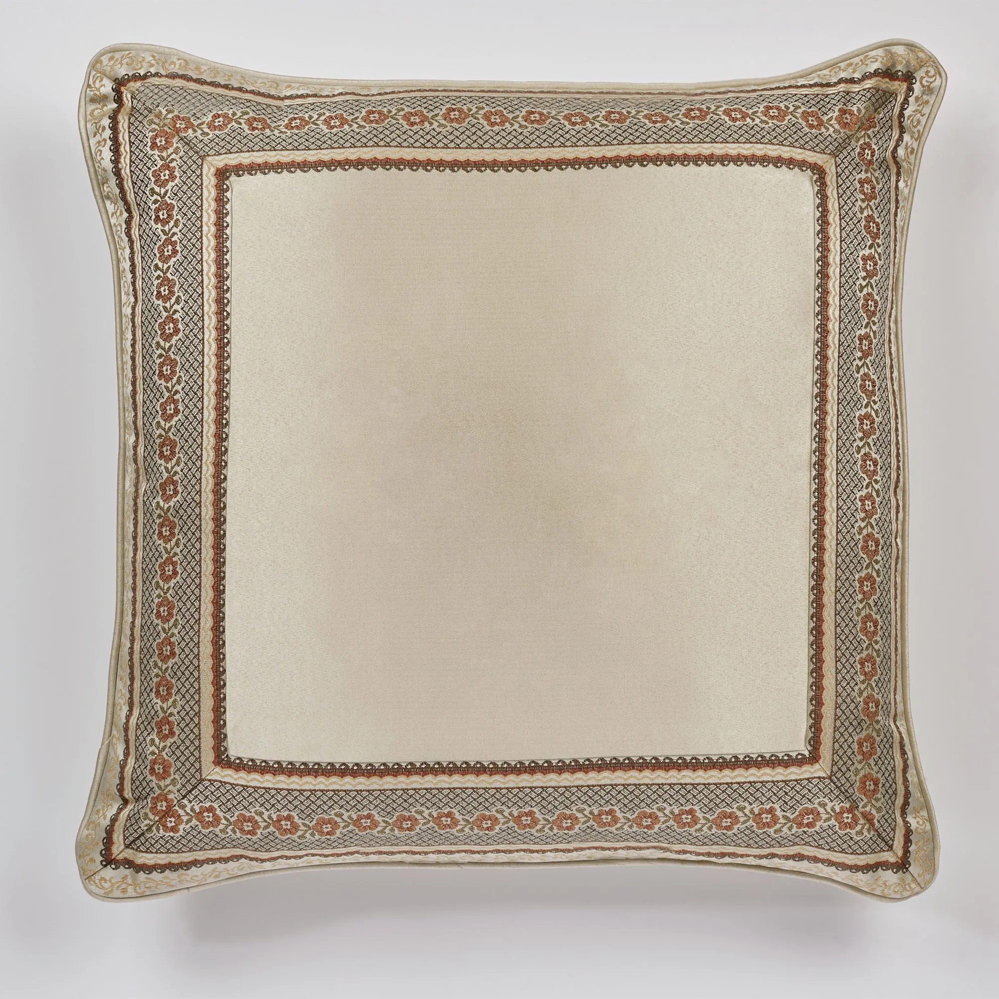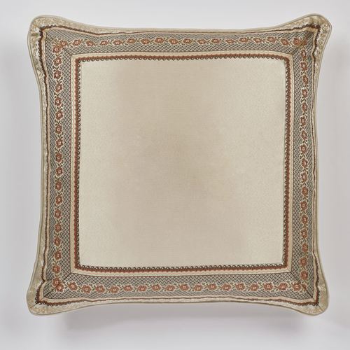 Classic beauty details the Geneva European Sham. The piped, polyester European sham is champagne framed in mitred, jacquard-woven floral stripes in shades of dark gray, gold, paprika, taupe, and sienna. Zipper closure. Dry clean only. Imported.