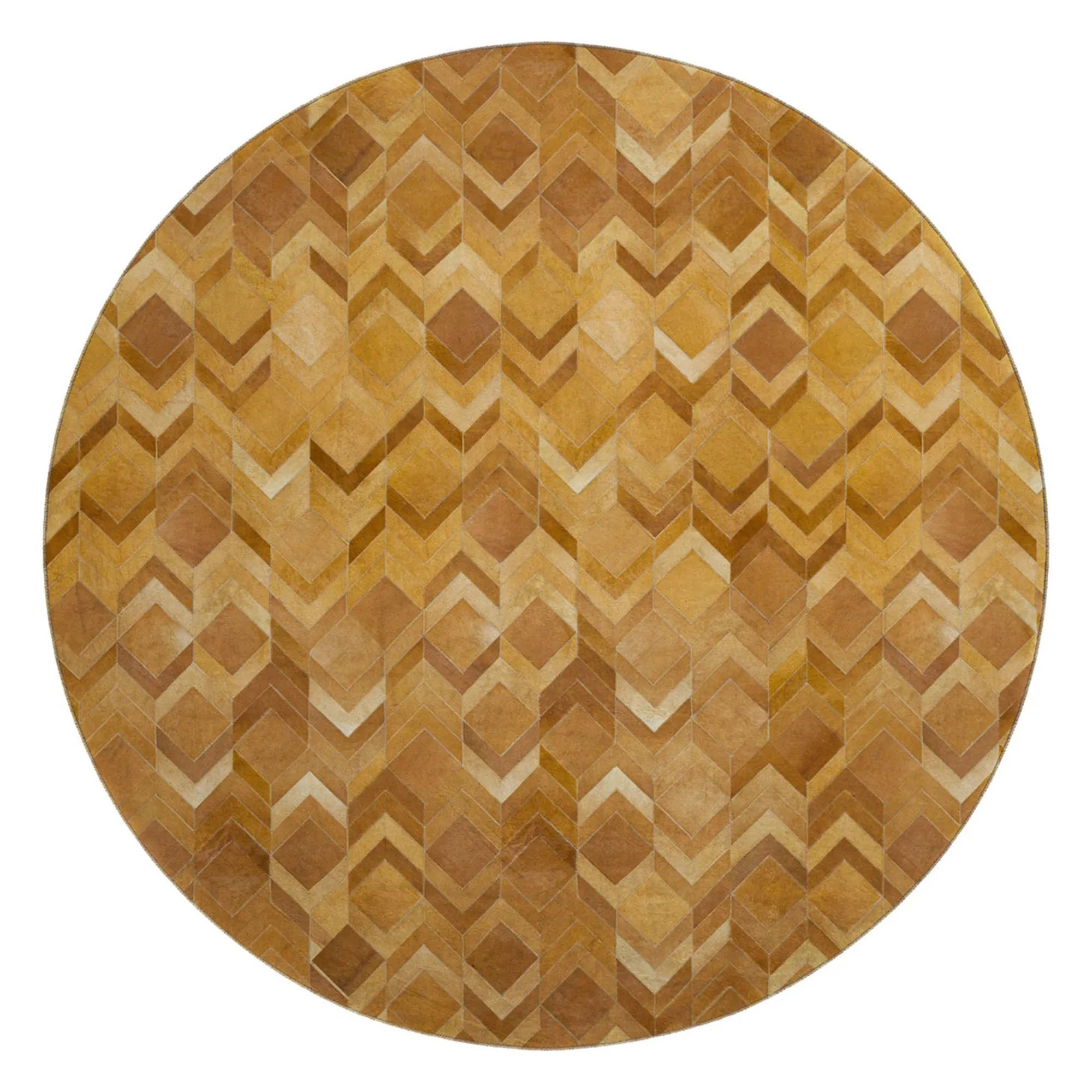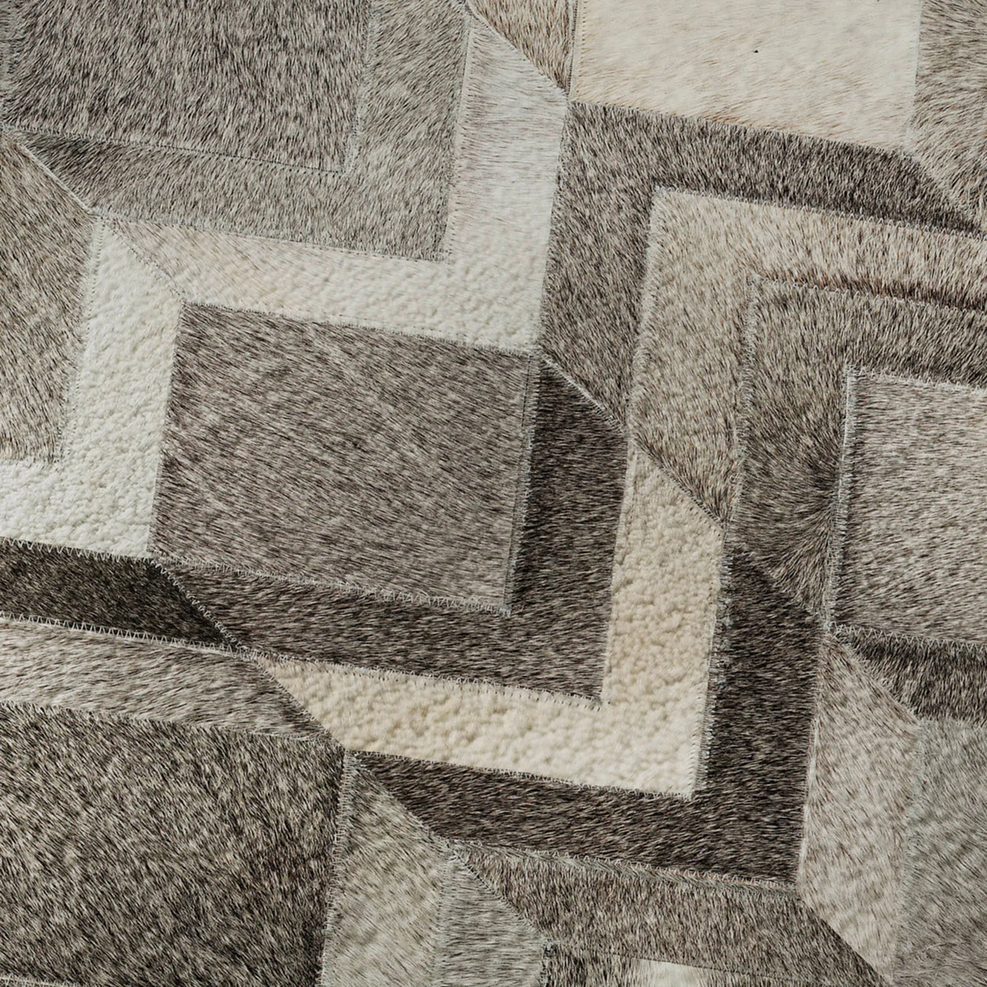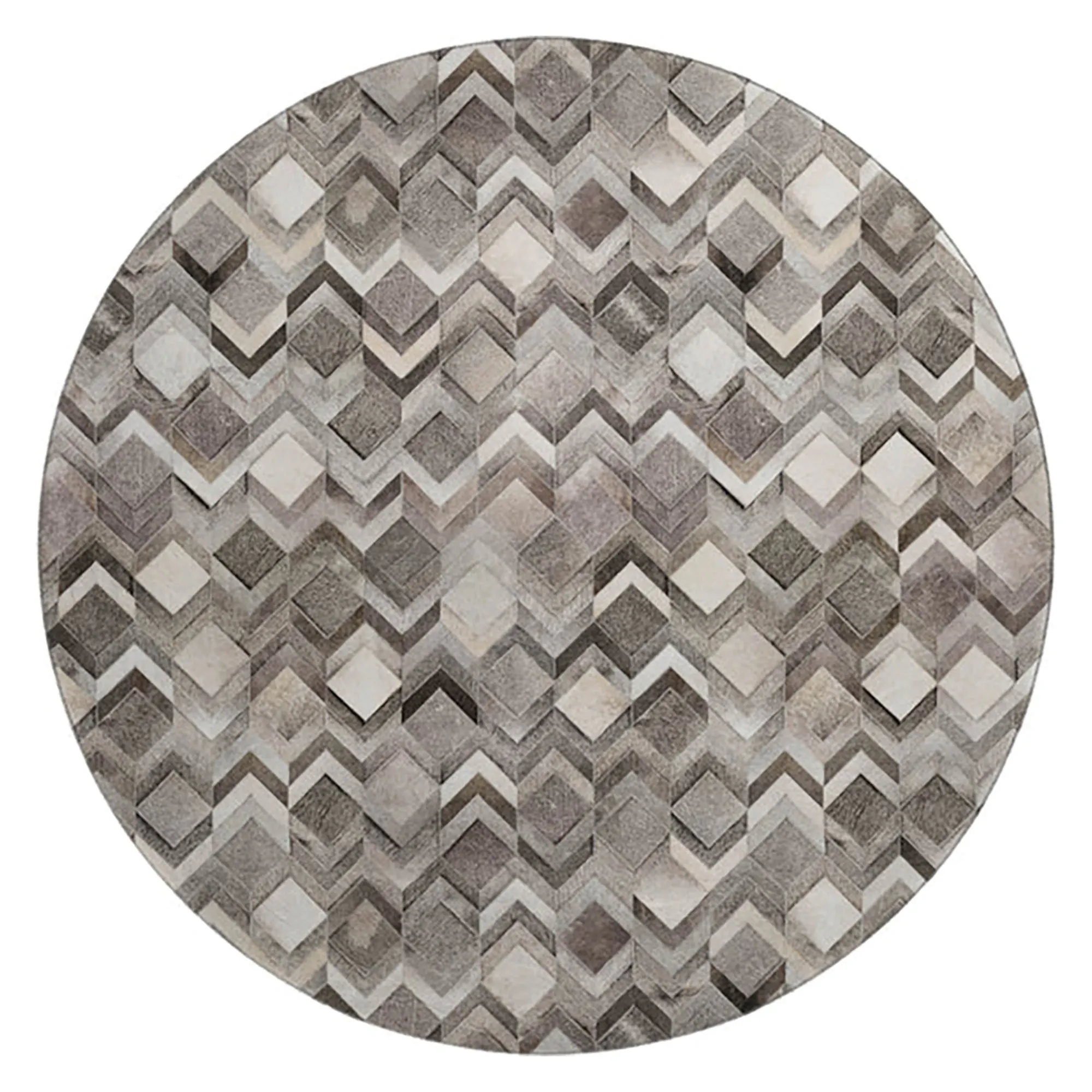 Add plush comfort, Geometric Illusion, and a natural touch to your floor with this unique printed round rug. Mimicking the look of pieced animal hides, the .5" thick, power-loomed polyester rug features fur-like geometric tonal blocks accented with faux stitching to create a patchwork appearance. The dappled tones of the pelt-like designs are UV-stabilized to resist fading. Rust has ivory, brown, beige, and mocha hues. Gray has charcoal, ivory, black, and beige hues. Backing is nonskid rubber. The machine washable rug can be used in your indoor or covered outdoor space. Machine wash or spot clean and rinse with a garden hose. Imported/USA.