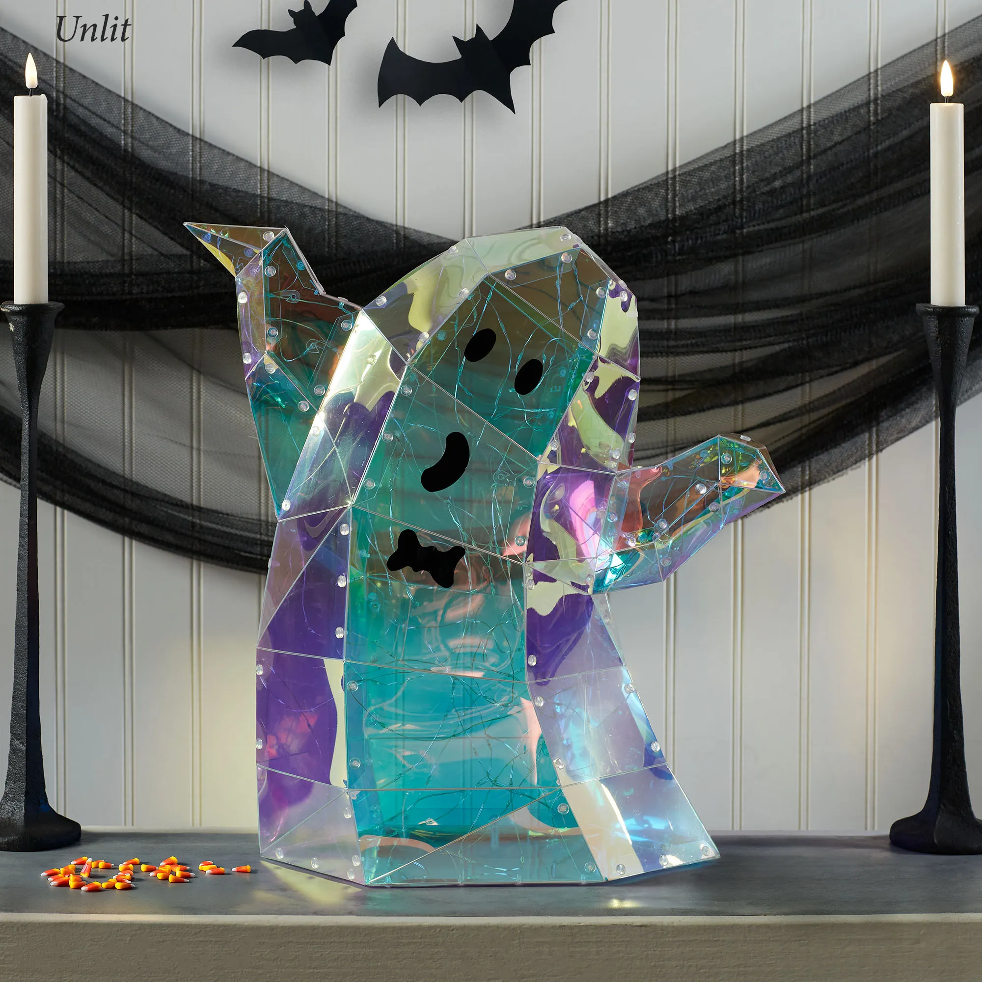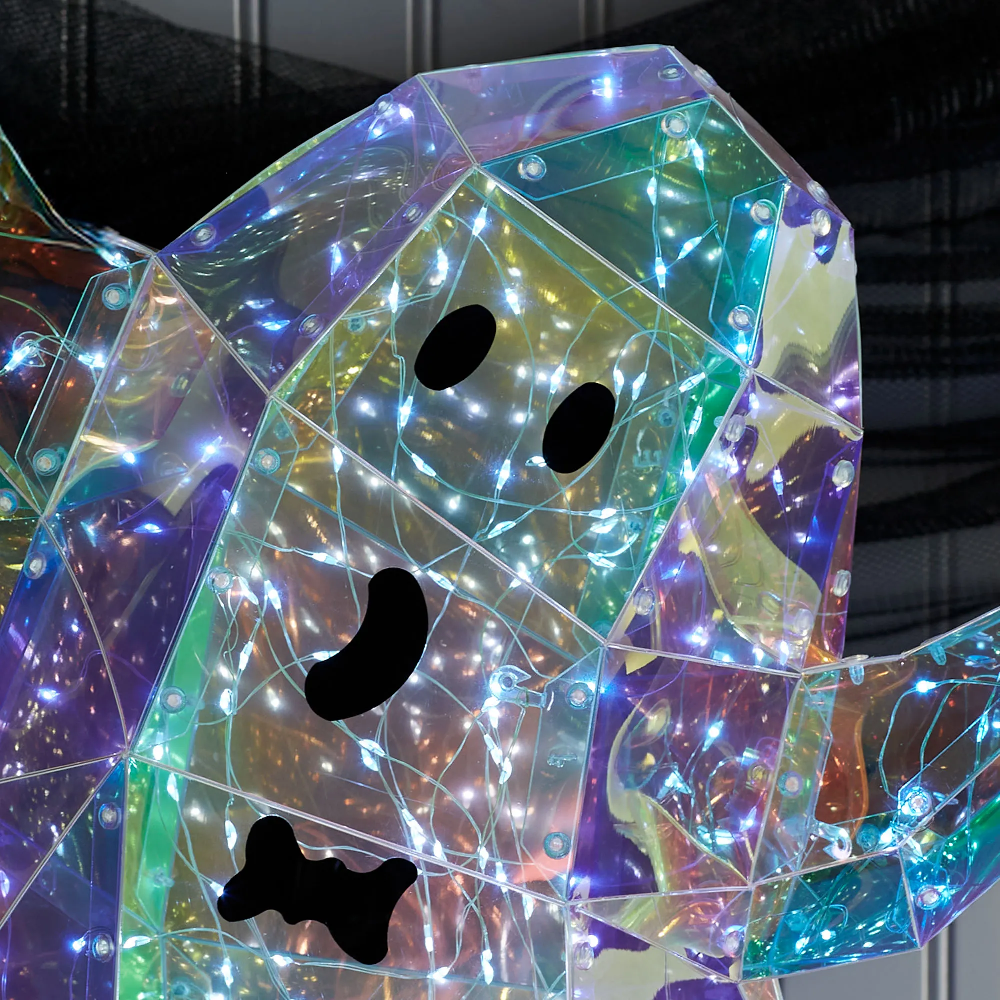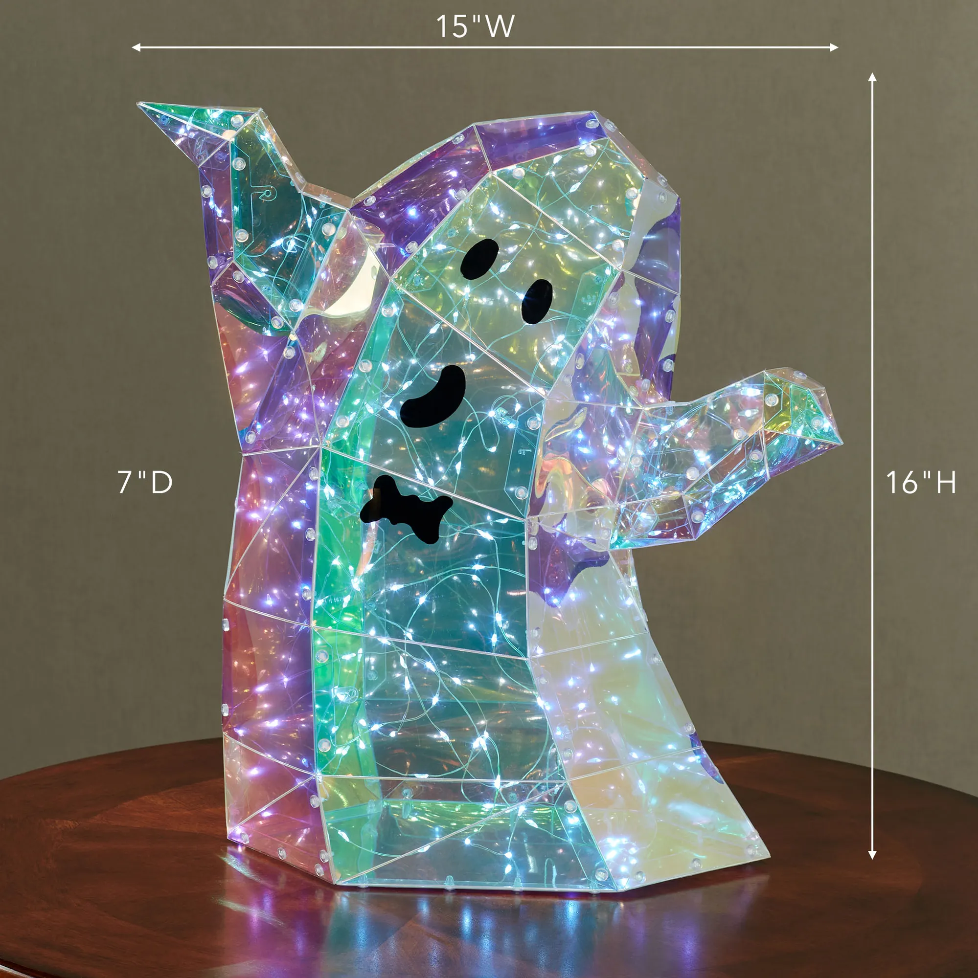 The Ghost Hologram Halloween Tabletop Accent is ready to join in on some spooky festivity. With a faceted shape, the molded polymer ghost features a clear iridescent hue, raised arms, and a black face and bow tie. Charming LED lights shimmer inside, creating mesmerizing reflections and iridescent effects. A steady light option is also available. Requires the included USB cord and adapter and operates via the included 10-function remote; the remote includes one battery. The on/off button is on the USB cord. Indoor use only. Measures 15"Wx7"Dx16"H.